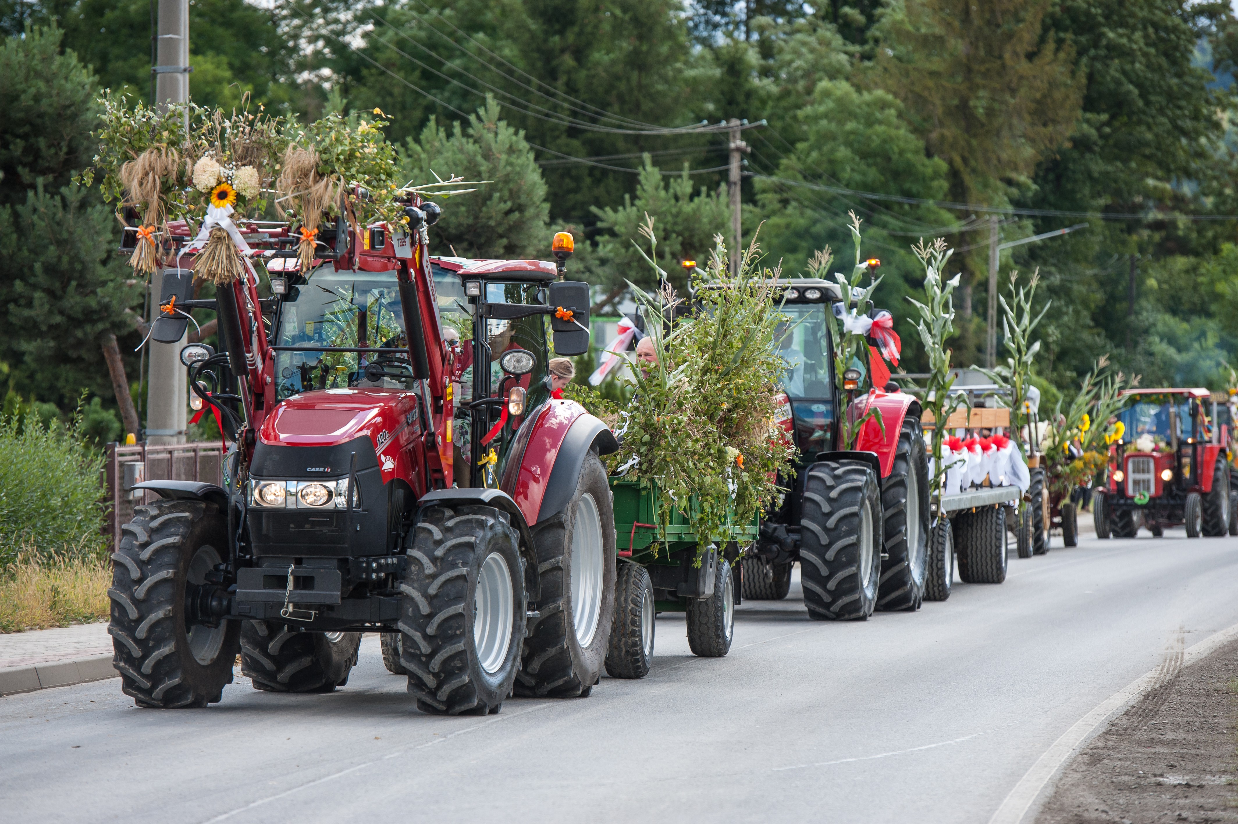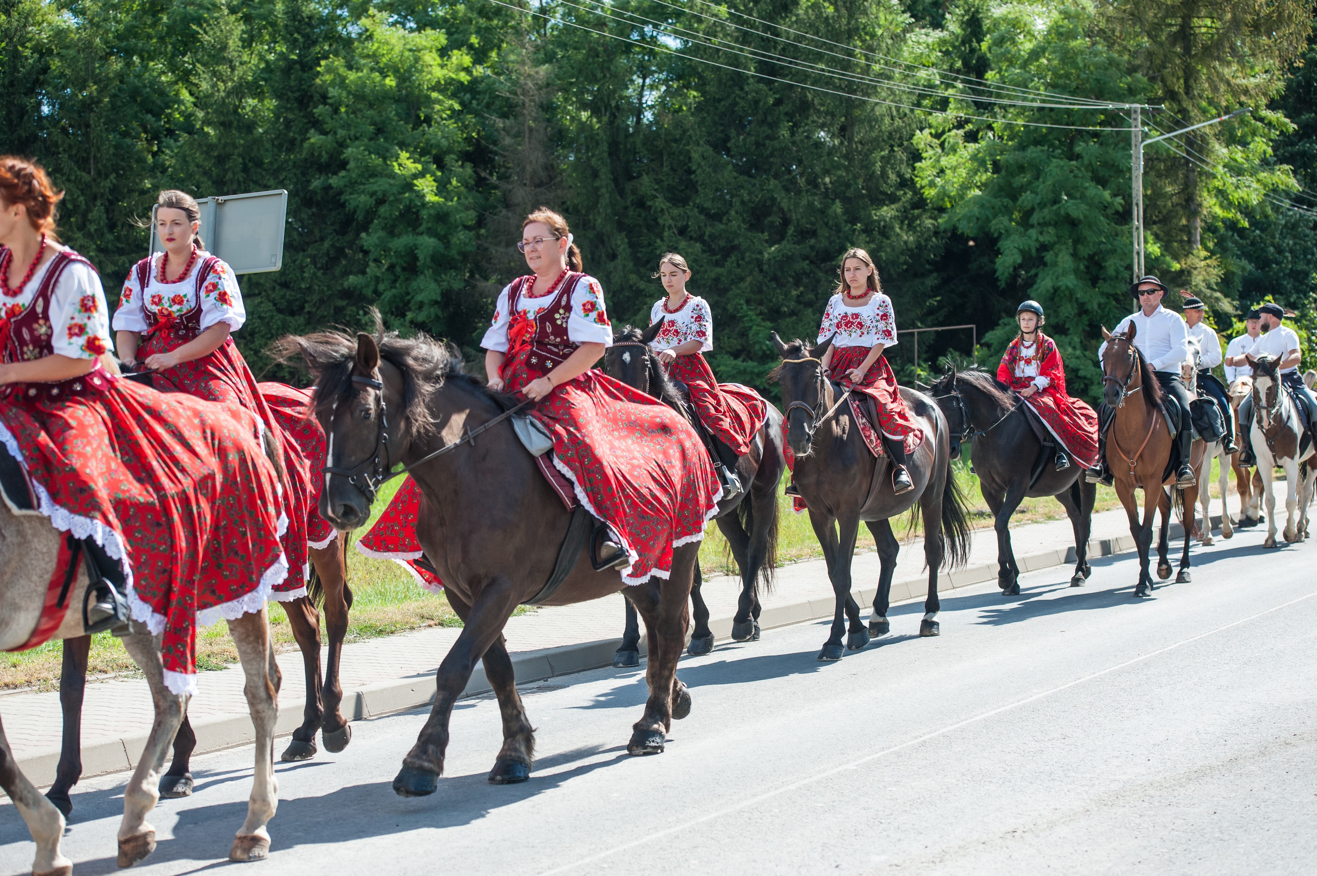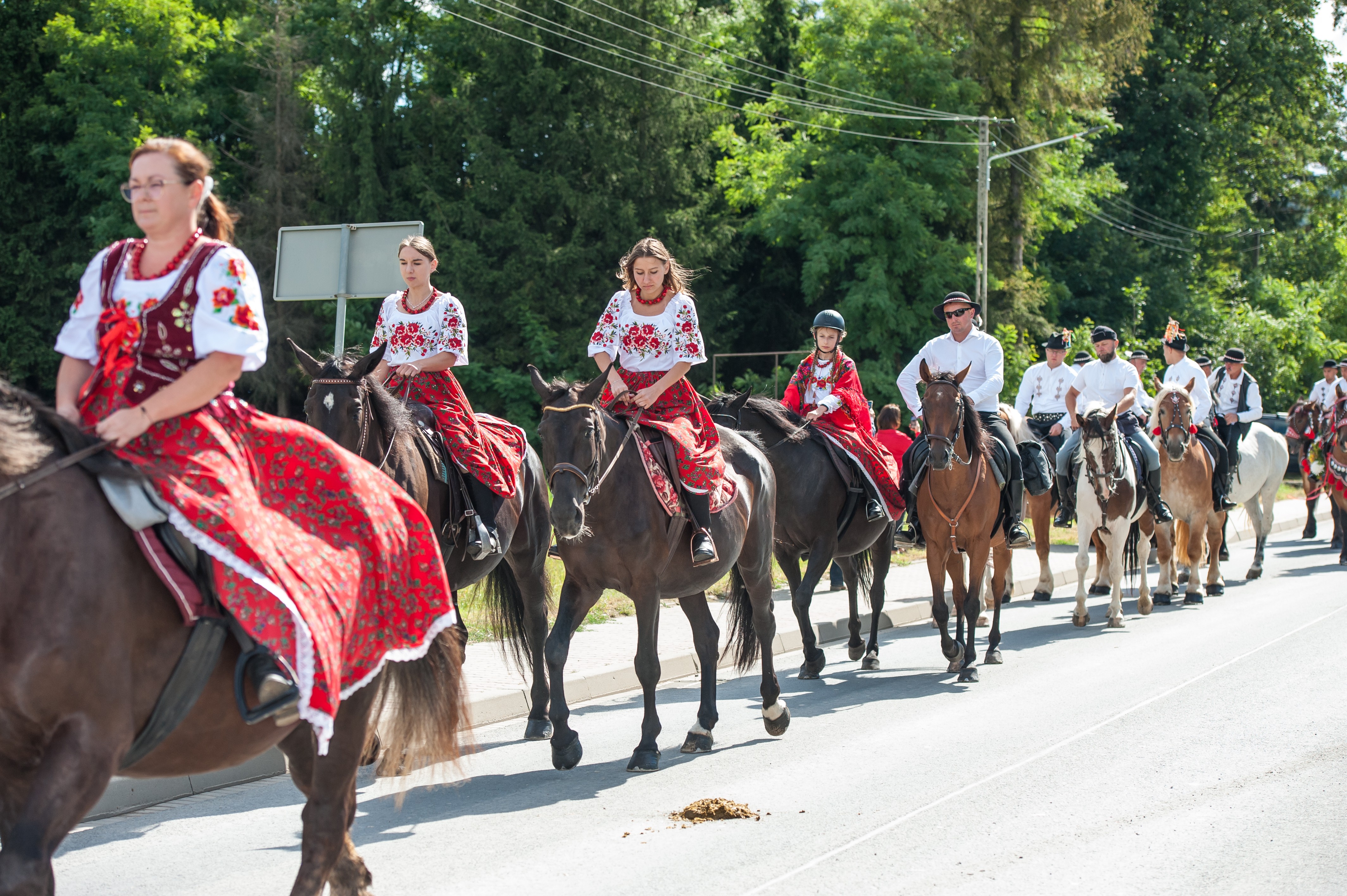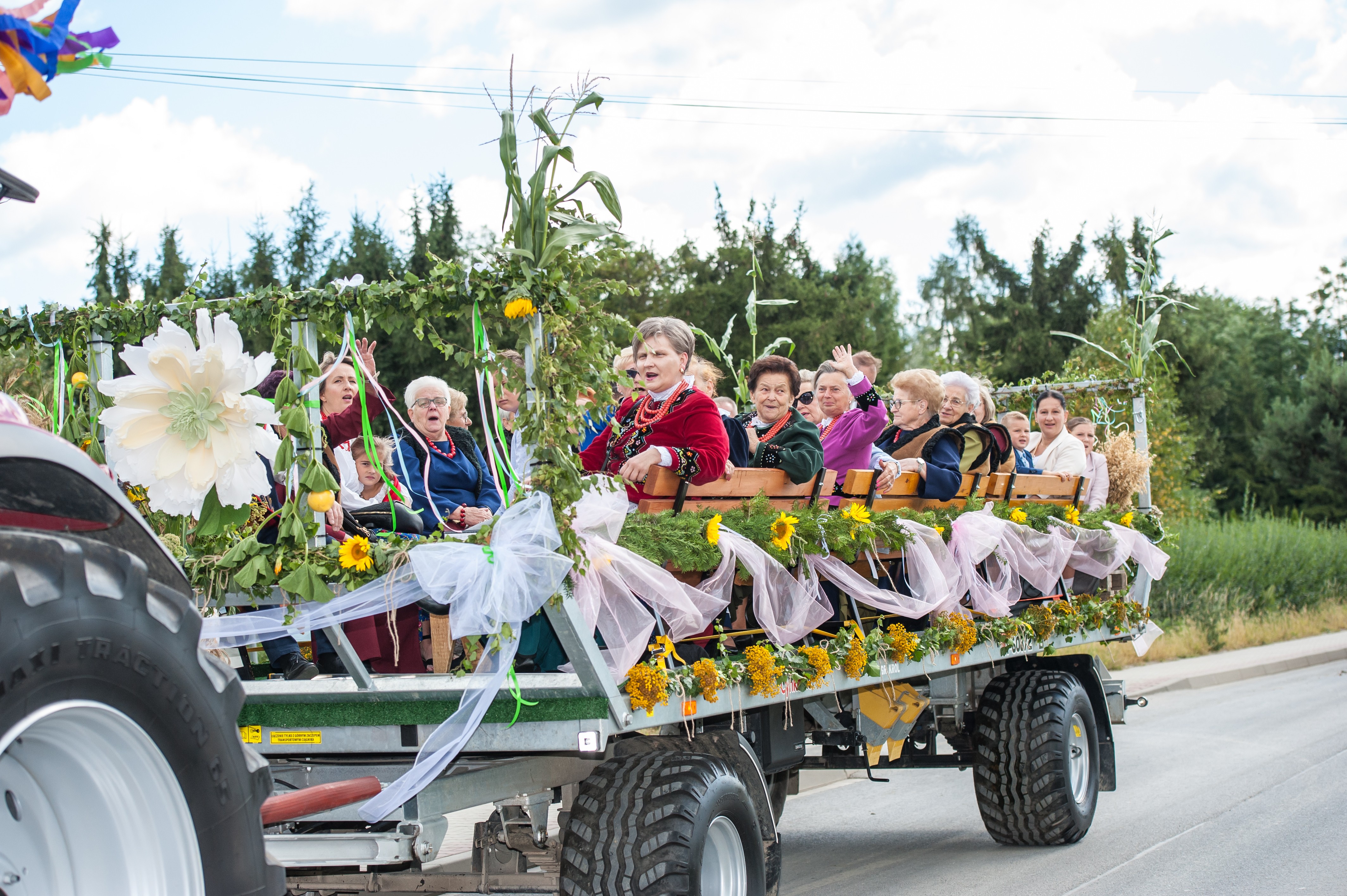 Po Mszy św. miał miejsce uroczysty przejazd korowodem dożynkowym drogami Męciny, w którym udział wzięli goście i wszystkie chętne osoby. Przejazd ulicami miejscowości przyciąga mieszkańców i turystów, tworząc niepowtarzalną atmosferę święta i wspólnoty, co widać było szczególnie w tym dniu. Po powrocie odbył się wspólny obiad i ksiądz proboszcz powitał wszystkich zebranych na placu przy kościele. Po powitaniu rozpoczęły się występy, które zapoczątkował zespół Męcinianie. Pięknie przygotowana choreografia, taniec i śpiew rozbrzmiały przy męcińskiej świątyni, a młodzież i dzieci zachwyciły wszystkich swoim występem. Tuż po nim zespół Tradycja, czyli seniorki z Męciny zaprezentowały się ze swoim programem.