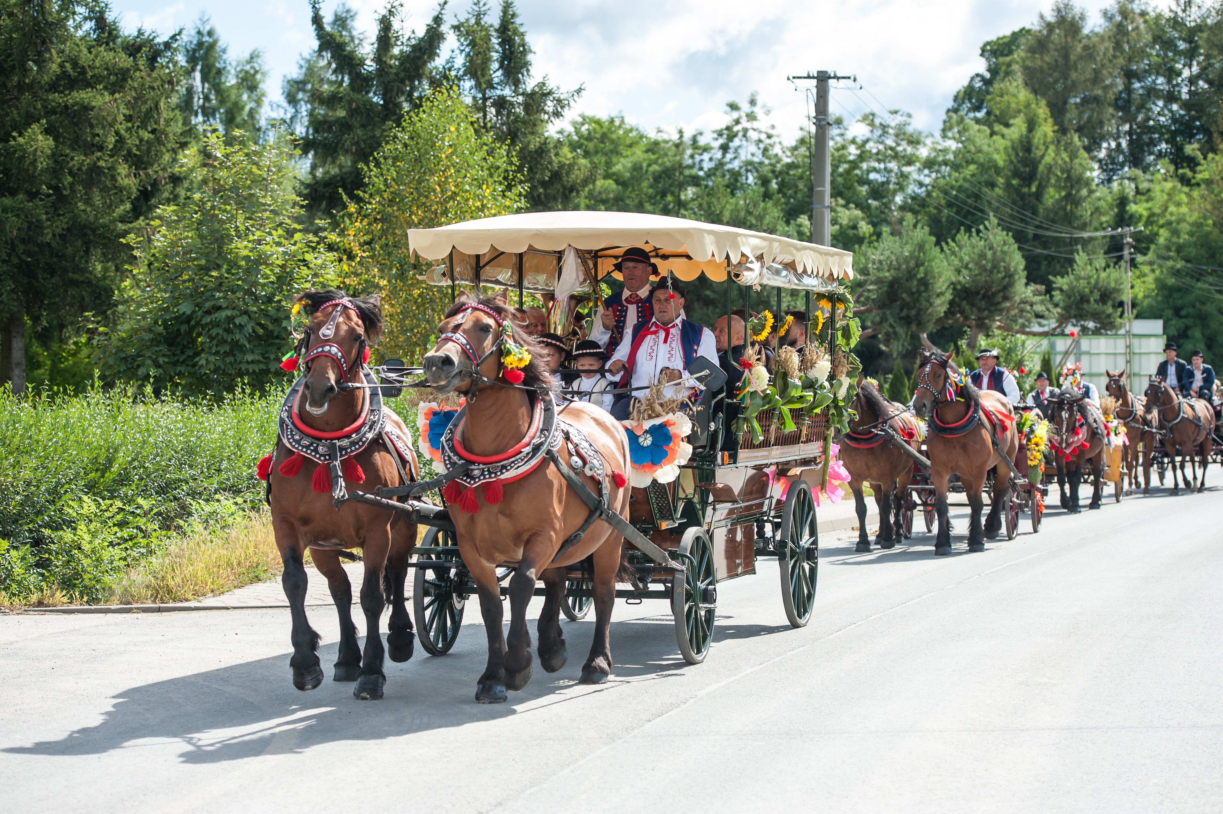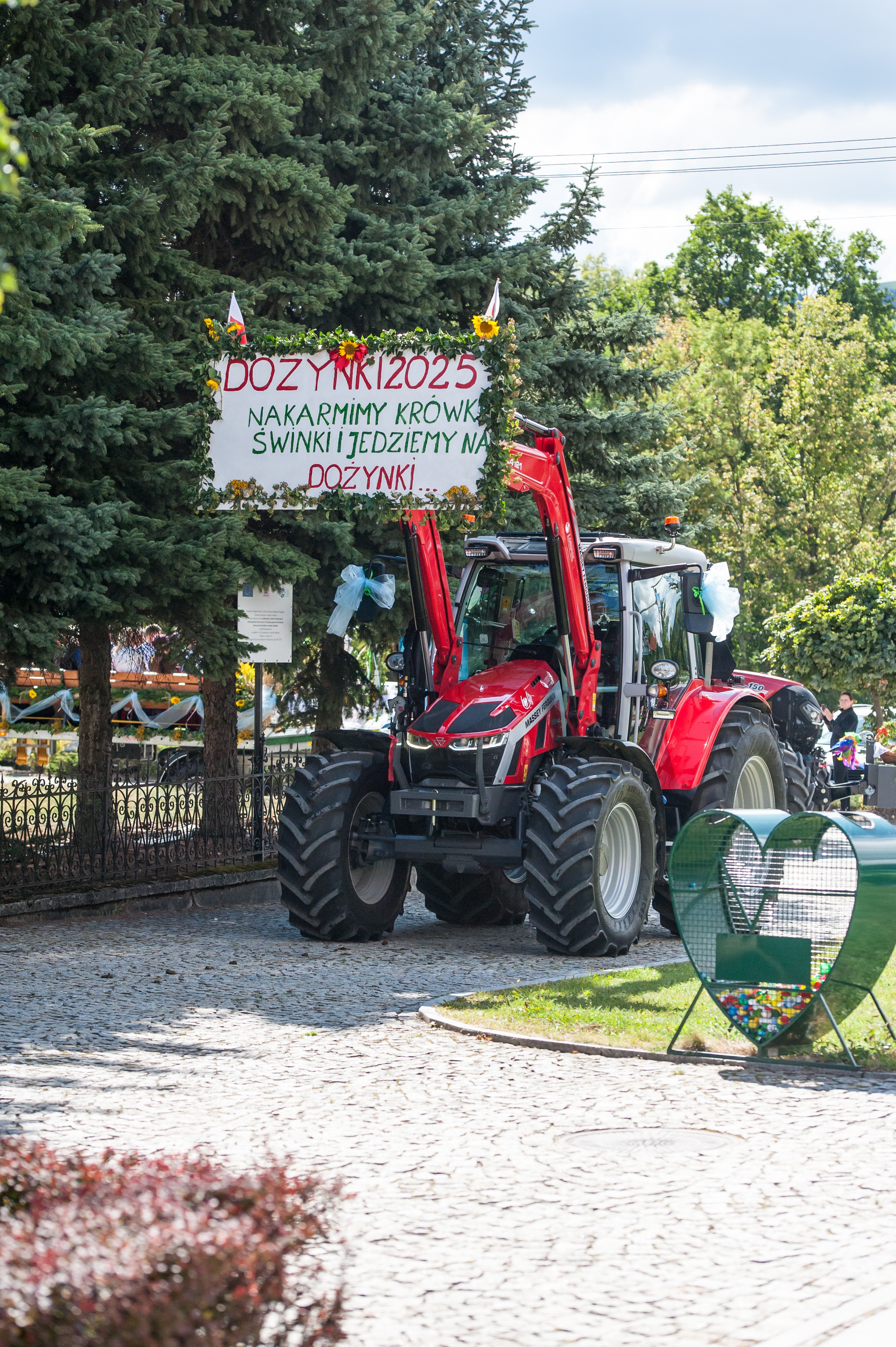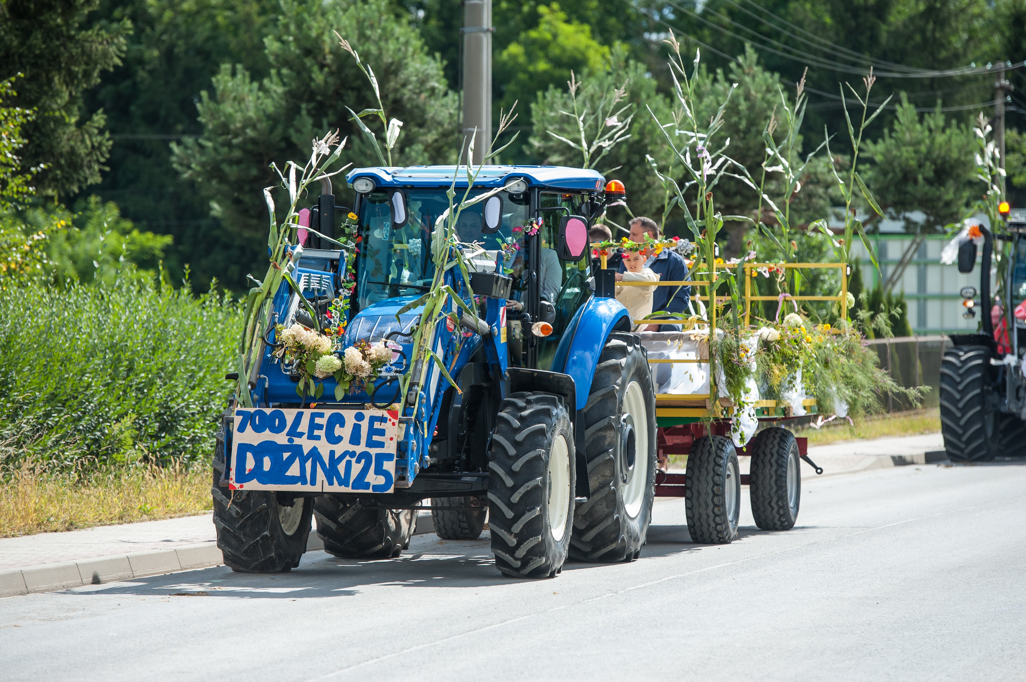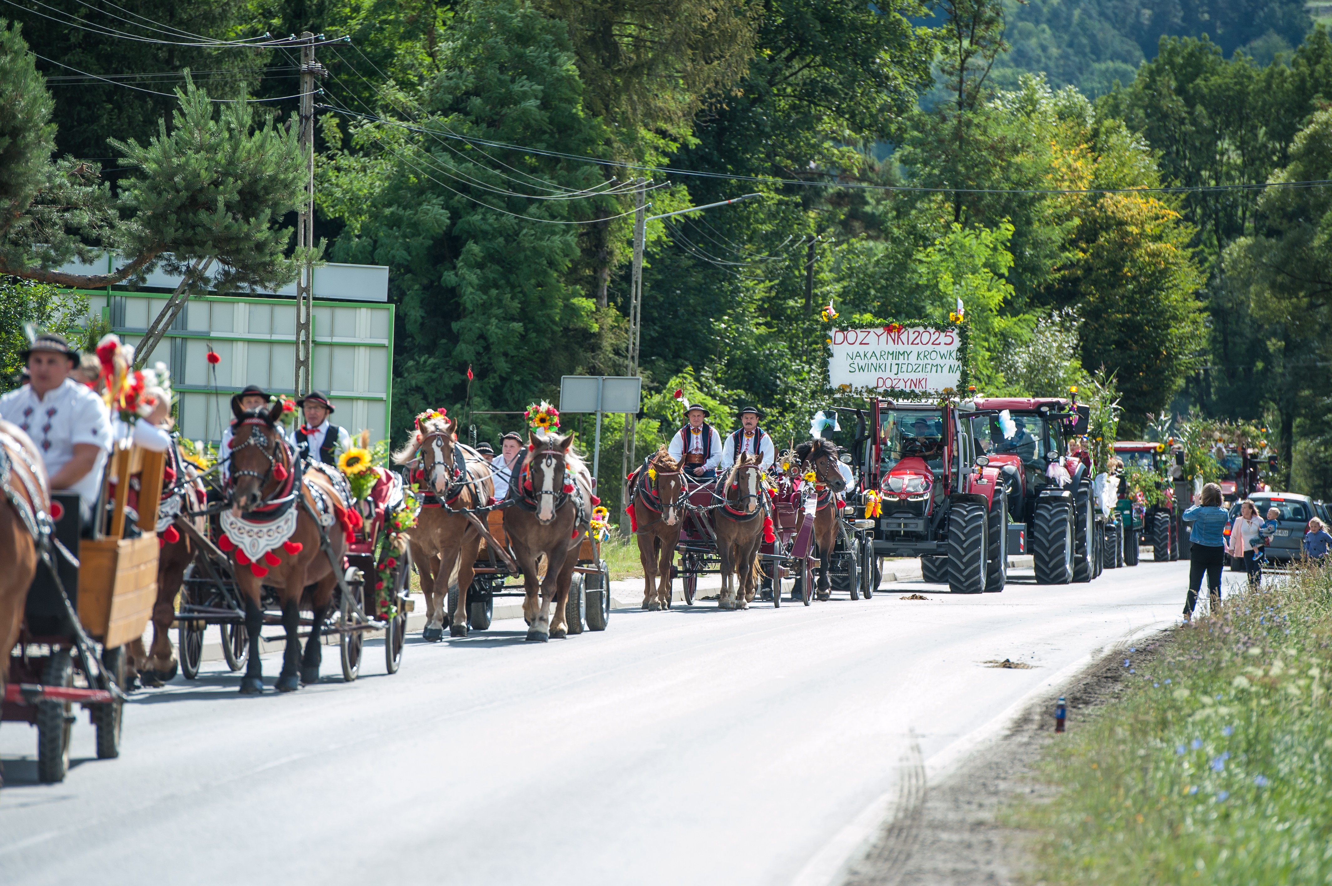 Po Mszy św. miał miejsce uroczysty przejazd korowodem dożynkowym drogami Męciny, w którym udział wzięli goście i wszystkie chętne osoby. Przejazd ulicami miejscowości przyciąga mieszkańców i turystów, tworząc niepowtarzalną atmosferę święta i wspólnoty, co widać było szczególnie w tym dniu. Po powrocie odbył się wspólny obiad i ksiądz proboszcz powitał wszystkich zebranych na placu przy kościele. Po powitaniu rozpoczęły się występy, które zapoczątkował zespół Męcinianie. Pięknie przygotowana choreografia, taniec i śpiew rozbrzmiały przy męcińskiej świątyni, a młodzież i dzieci zachwyciły wszystkich swoim występem. Tuż po nim zespół Tradycja, czyli seniorki z Męciny zaprezentowały się ze swoim programem.