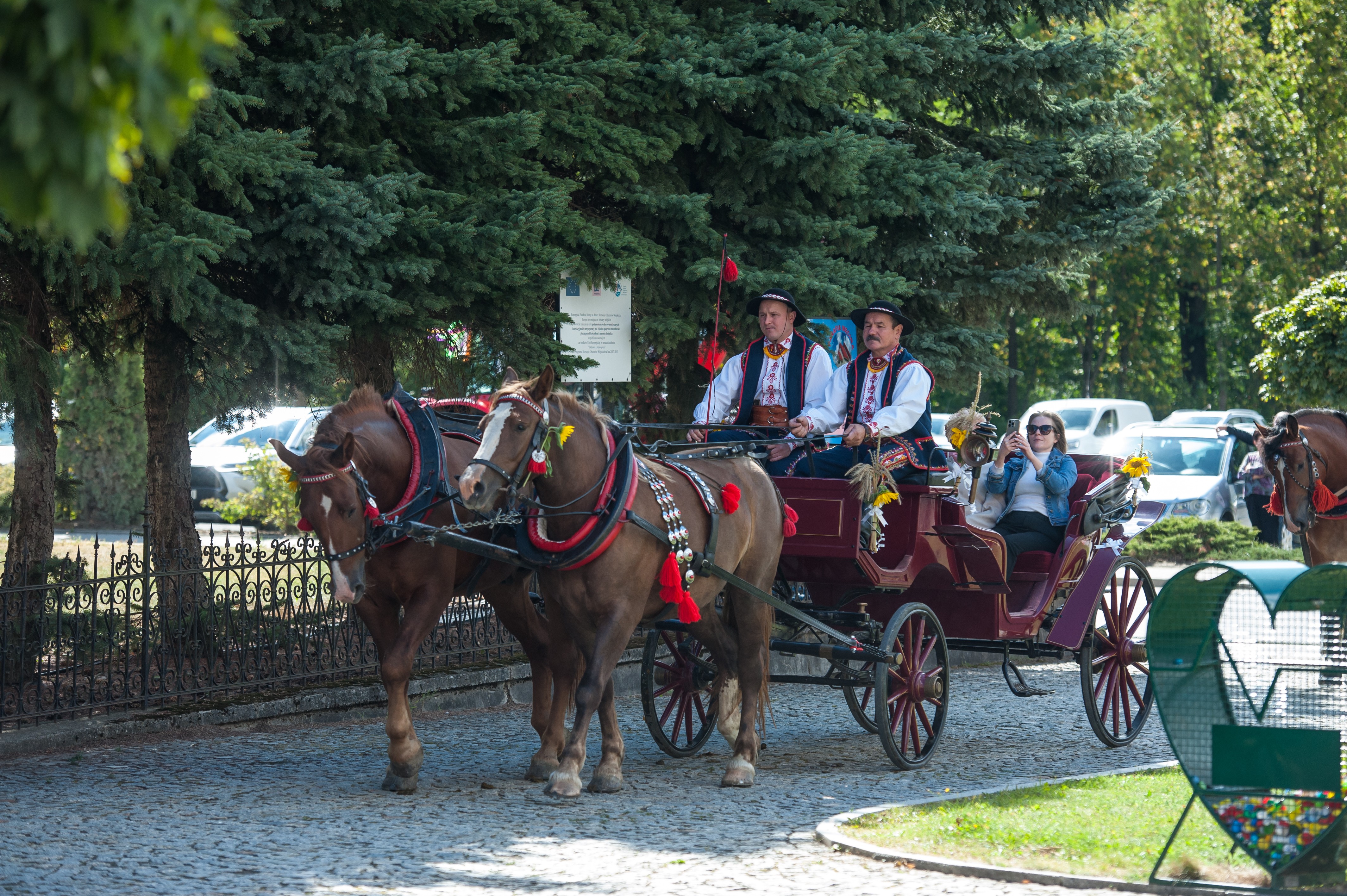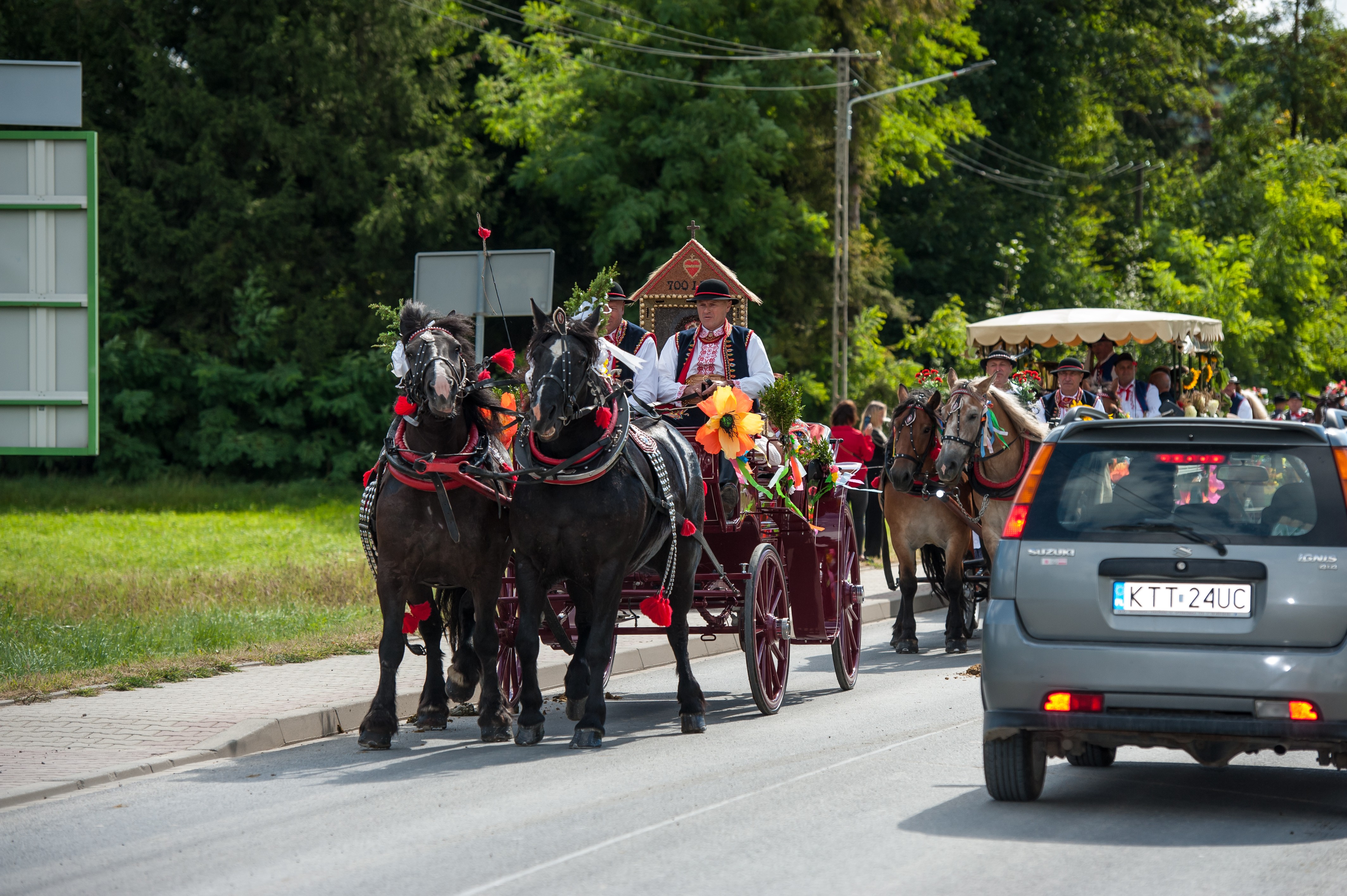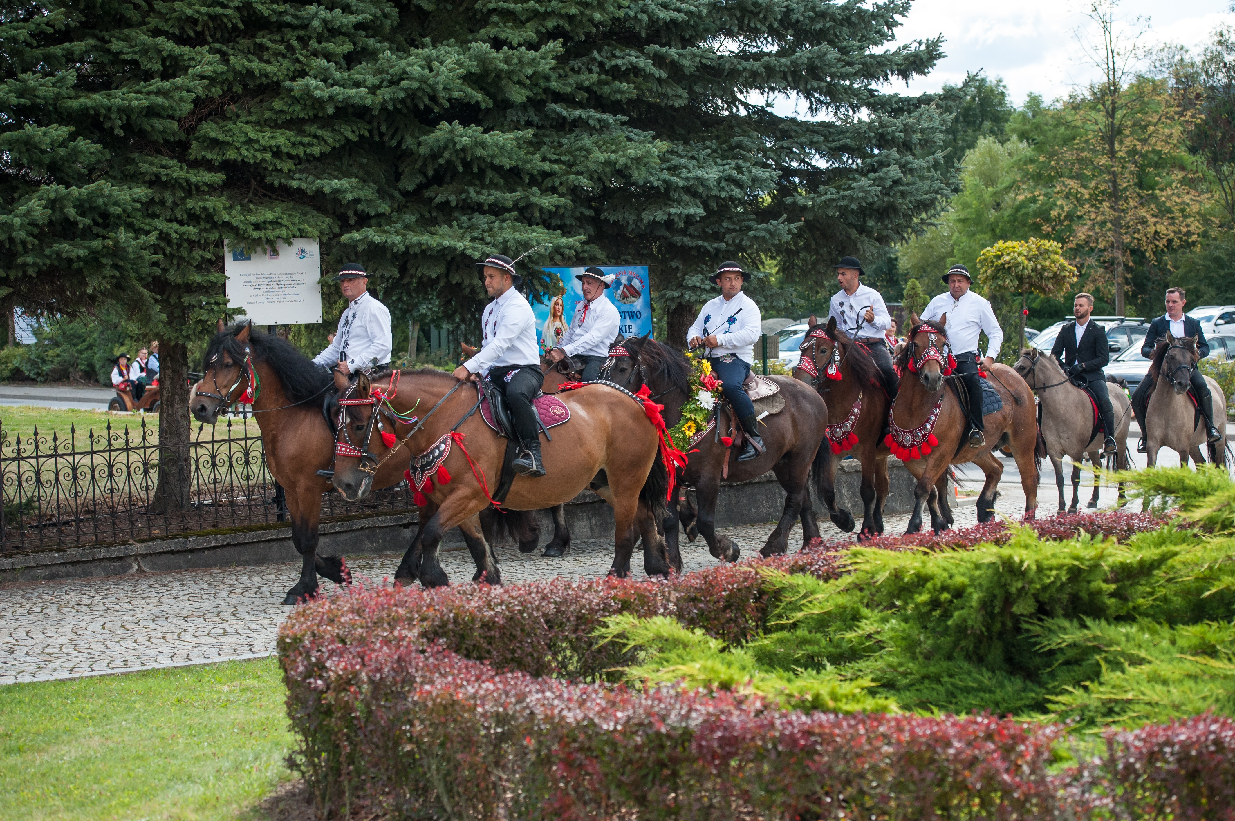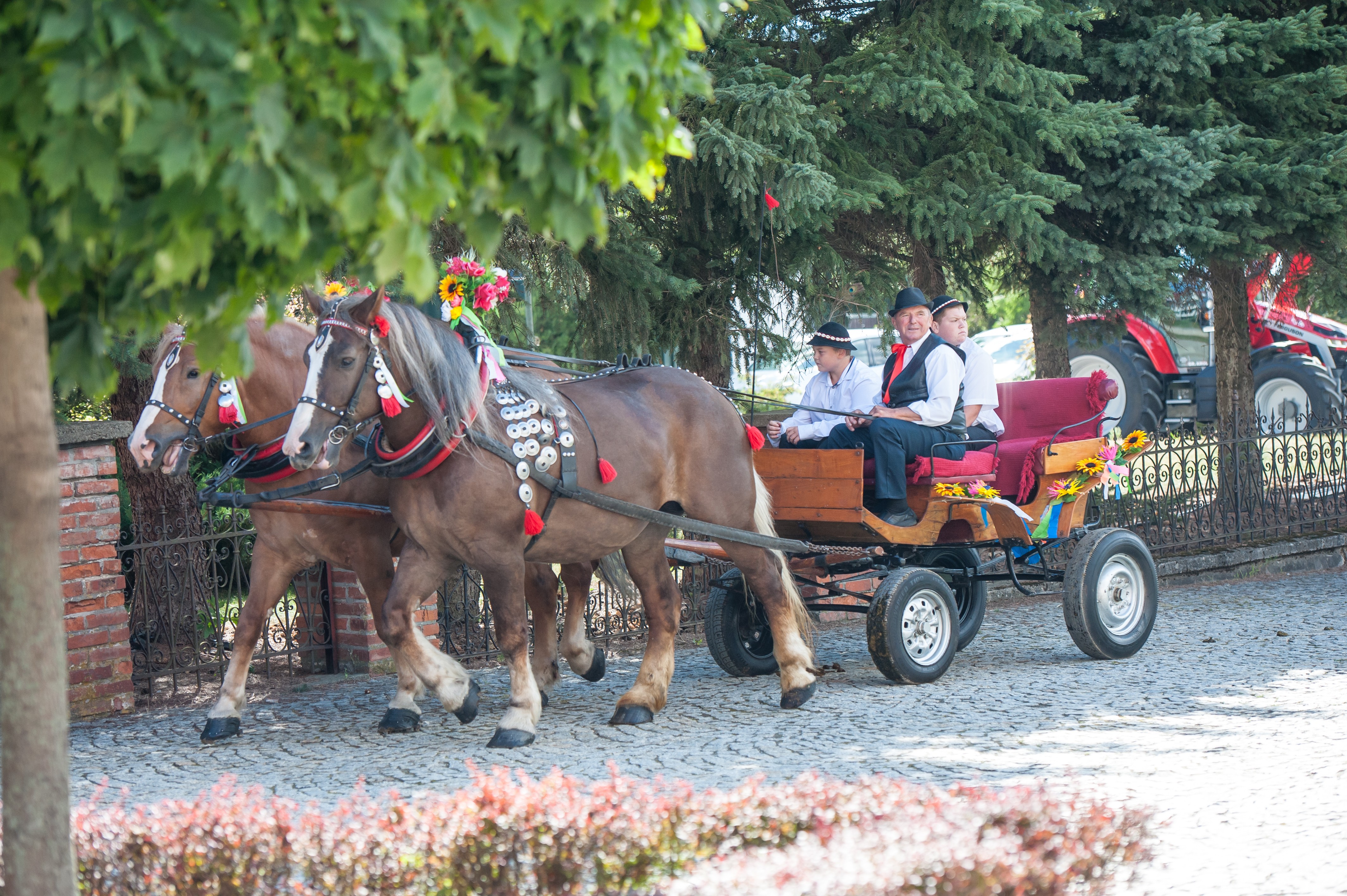 Po Mszy św. miał miejsce uroczysty przejazd korowodem dożynkowym drogami Męciny, w którym udział wzięli goście i wszystkie chętne osoby. Przejazd ulicami miejscowości przyciąga mieszkańców i turystów, tworząc niepowtarzalną atmosferę święta i wspólnoty, co widać było szczególnie w tym dniu. Po powrocie odbył się wspólny obiad i ksiądz proboszcz powitał wszystkich zebranych na placu przy kościele. Po powitaniu rozpoczęły się występy, które zapoczątkował zespół Męcinianie. Pięknie przygotowana choreografia, taniec i śpiew rozbrzmiały przy męcińskiej świątyni, a młodzież i dzieci zachwyciły wszystkich swoim występem. Tuż po nim zespół Tradycja, czyli seniorki z Męciny zaprezentowały się ze swoim programem.