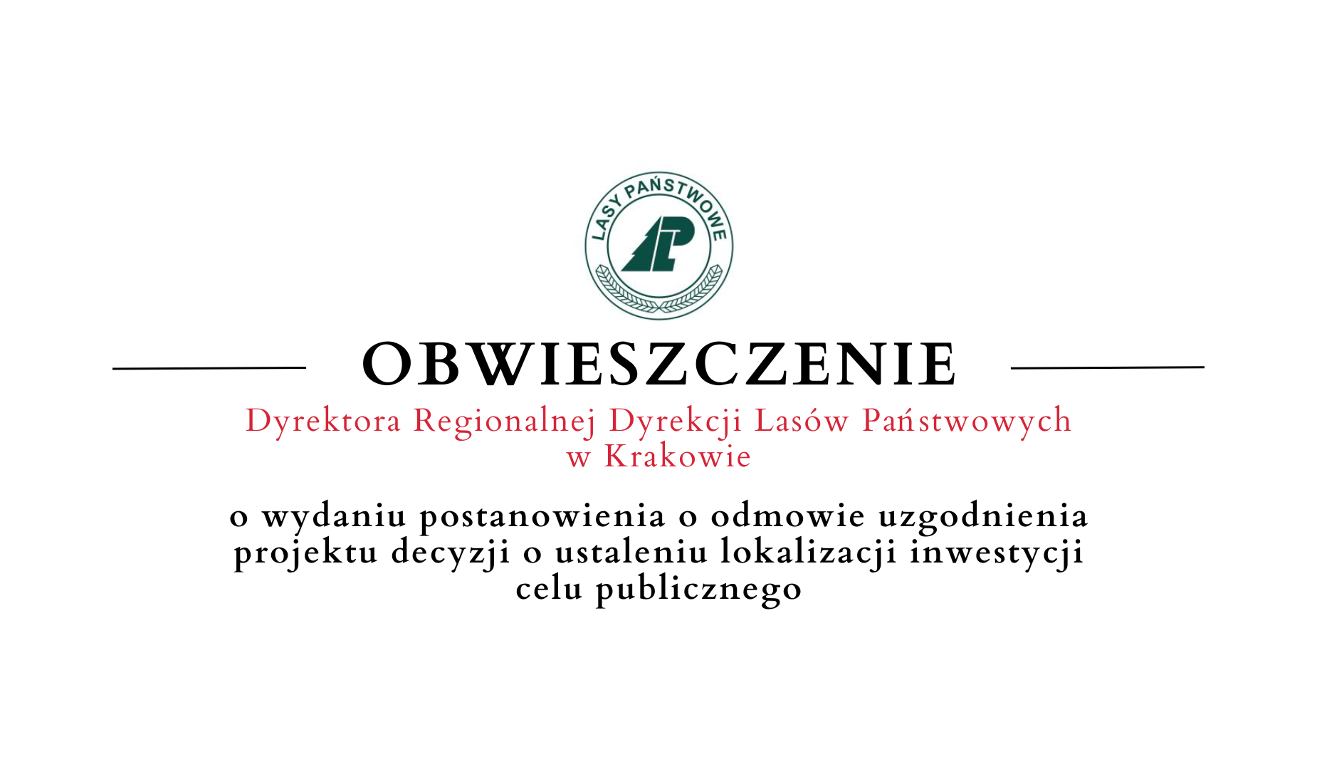 zawiadamia o wydaniu w dniu 21.08.2025 r. postanowienia znak: ZZ.224.4.30.2025 o odmowie uzgodnienia projektu decyzji o ustaleniu lokalizacji inwestycji celu publicznego w zakresie ochrony gruntów leśnych dla inwestycji pn.: „Budowa sieci gazowej średniego ciśnienia wraz z przyłączami w ramach realizacji inwestycji ,,Przebudowa sieci gazowej średniego ciśnienia wraz z przyłączami gazu w miejscowości Siekierczyna - Kanina, gm. Limanowa" obejmującego tereny części dz. ew. 325/4, 198, 330/9, 330/4, 330/8, 330/7, 329, 483/1, 483/2, 482/16, 481, 479/5, 476/6, 476/5, 476/9, 476/4, 476/7, 476/8, 477, 442/4, 442/3, 402, 471/3, 471/8, 471/12, 471/10, 471/11, 447, 468, 454, 449/3, 466, 465/5, 457/13, 457/15, 457/12, 457/2, 457/9, 457/11, 457/10, 456, 471/9, 473/3, 473/1, 472, 474/1, 474/2, 469/1, 469/2, 498, 499/1, 500, 501/1, 501/2, 494/1, 501/4, 692, 693, 698, 699, 734/1, 689, 494/2, 496/15, 496/19, 493, 492, 490/14, 490/6, 490/7, 490/9, 681, 433, 434/1, 435/1, 435/2, 436/2 obręb Siekierczyna oraz części dz. ew. 2/1, 13/1, 13/2, 16/2, 7, 14, 16/6, 27/1, 27/3, 26/2, 27/2, 25, 24/9, 24/7, 286, 282, 300, 55, 54, 53, 56/2, 58, 97/6 obręb Kanina, gm. Limanowa" w zakresie działek ewid. nr: 27/1, 53 położonych w obrębie Kanina, gm. Limanowa oraz o umorzeniu postępowania w zakresie pozostałych działek wymienionych w projekcie decyzji.