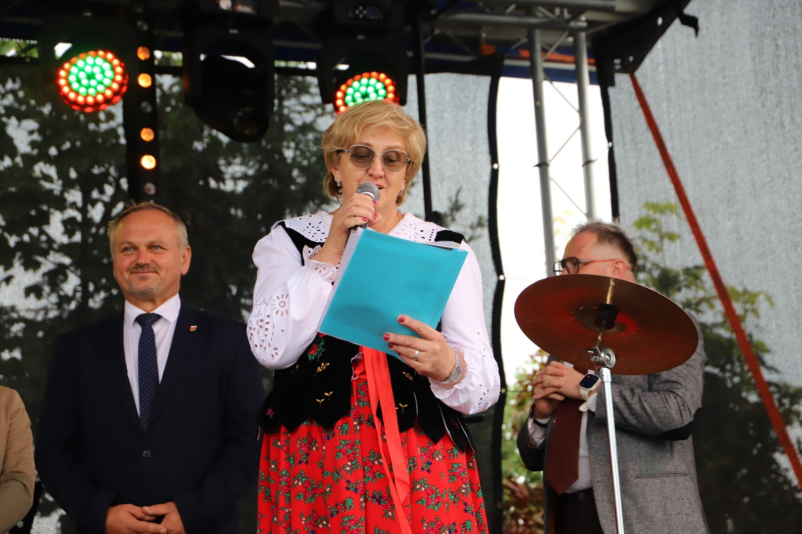 Grażyna Gawlik sołtys miejscowości Siekierczyna a zarazem Przewodnicząca Koła Gospodyń Wiejskich w Siekierczynie zachęcając wszystkich do wspólnego biesiadowania.