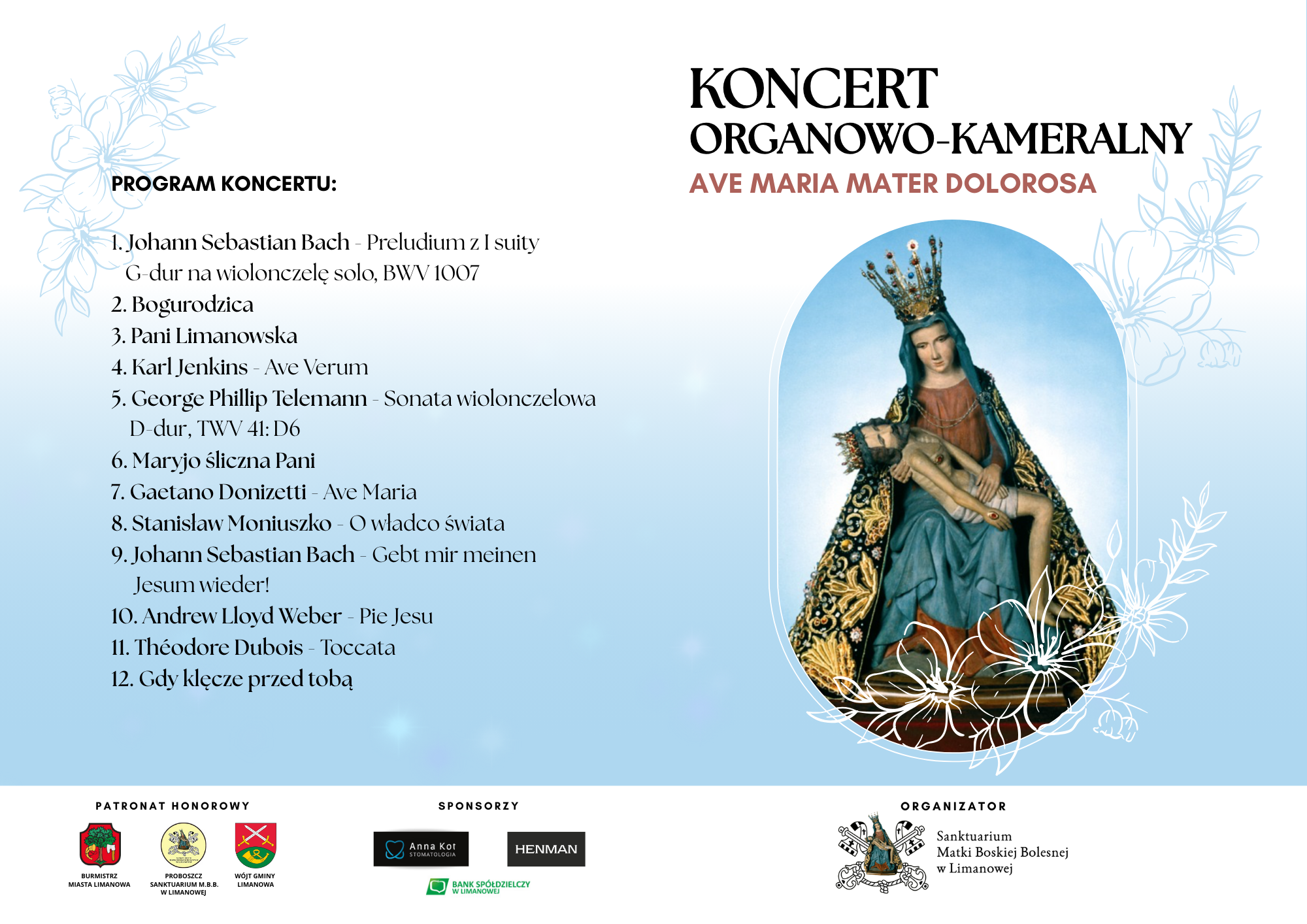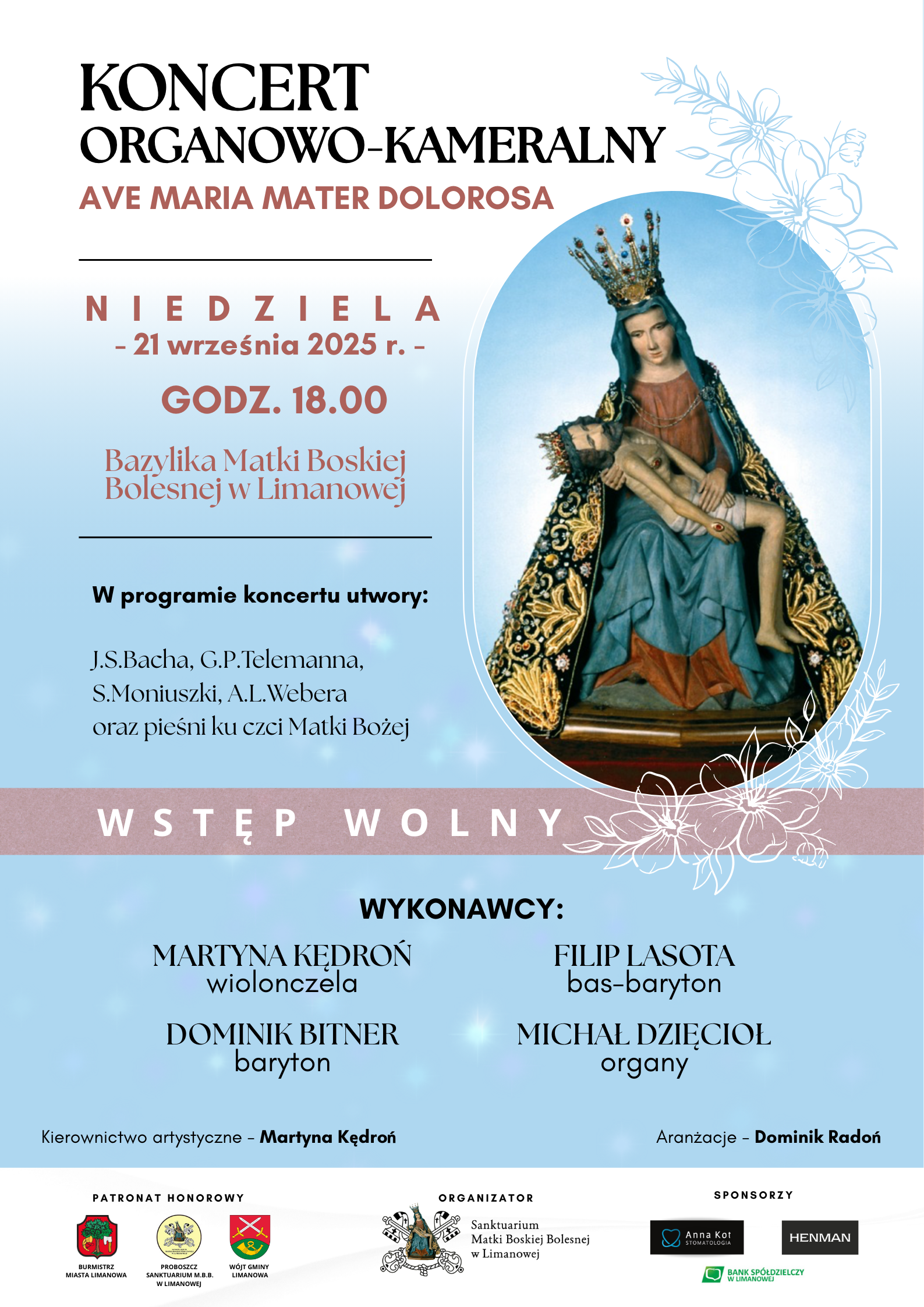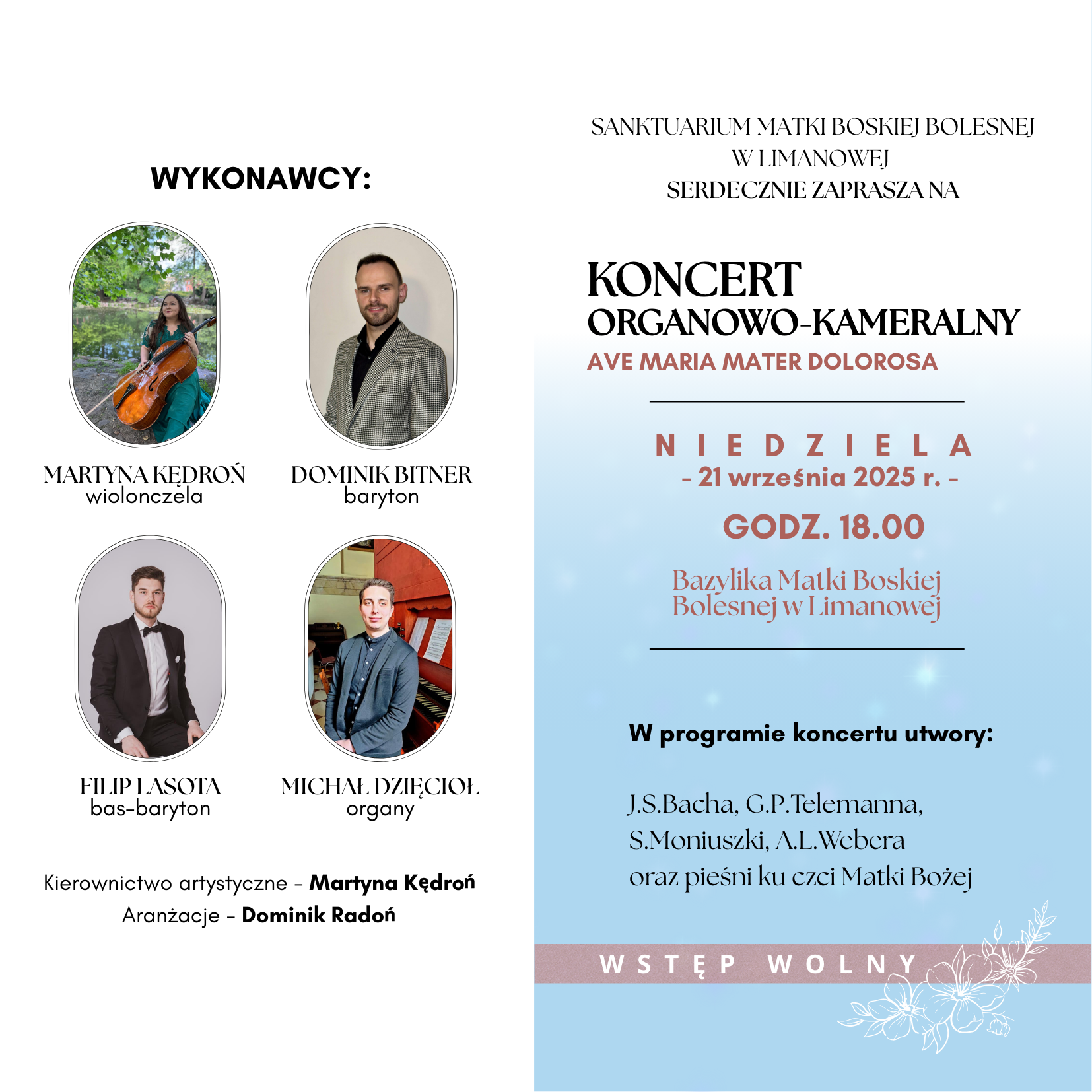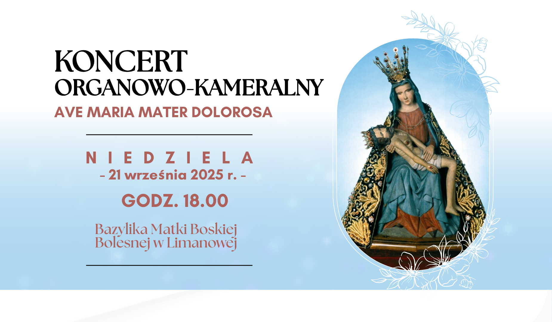 W imieniu organizatorów serdecznie zapraszamy na koncert organowo-kameralny AVE MARIA MATER DOLOROSA, który odbędzie się już w tą niedzielę - 21 września 2025 roku o godzinie 18.00 w Bazylice Matki Boskiej Bolesnej w Limanowej.