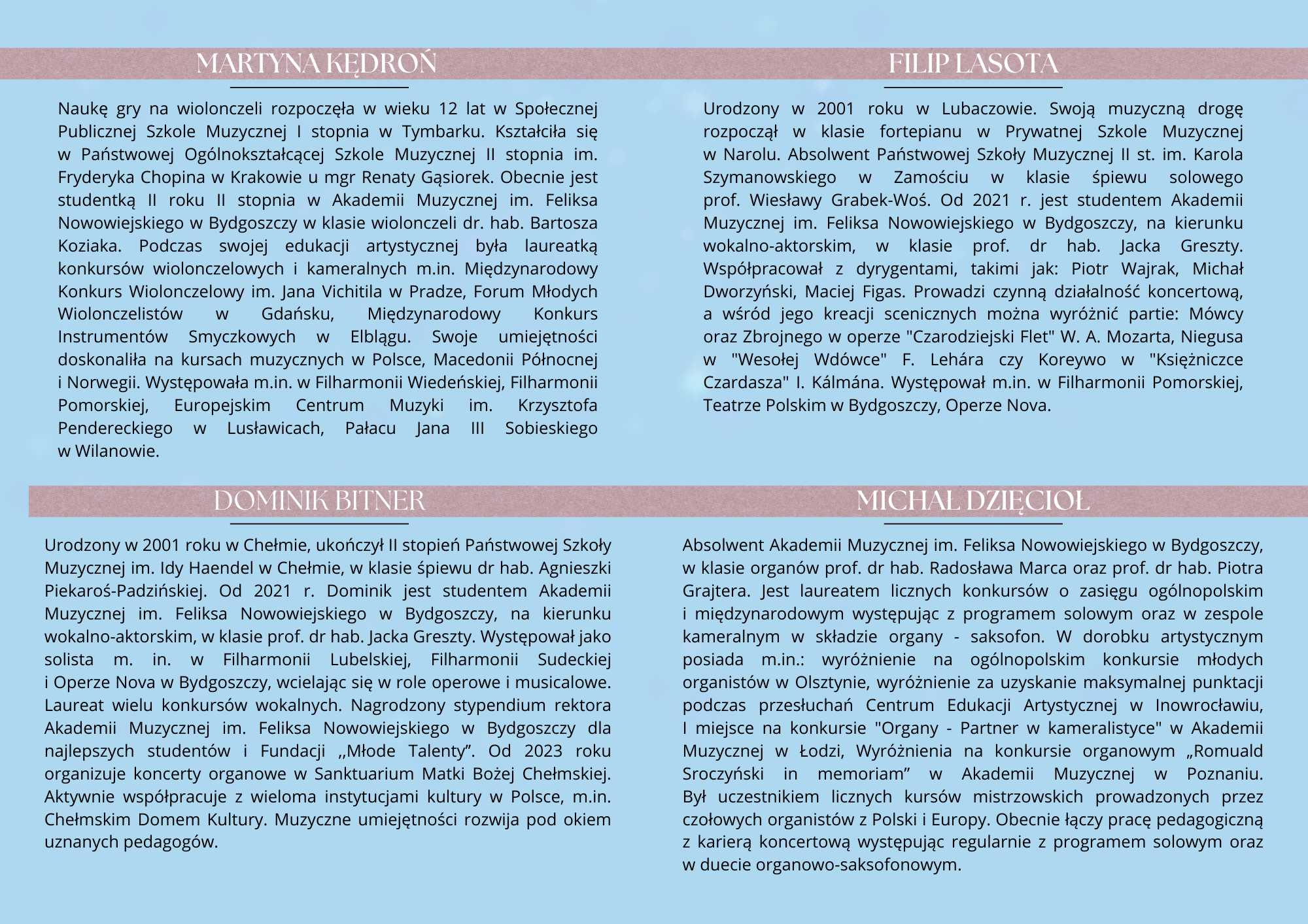 Podczas koncertu, na instrumentach, wystąpią: Martyna Kędroń, Filip Lasota, Dominik Bitner, Michał Dzięcioł.