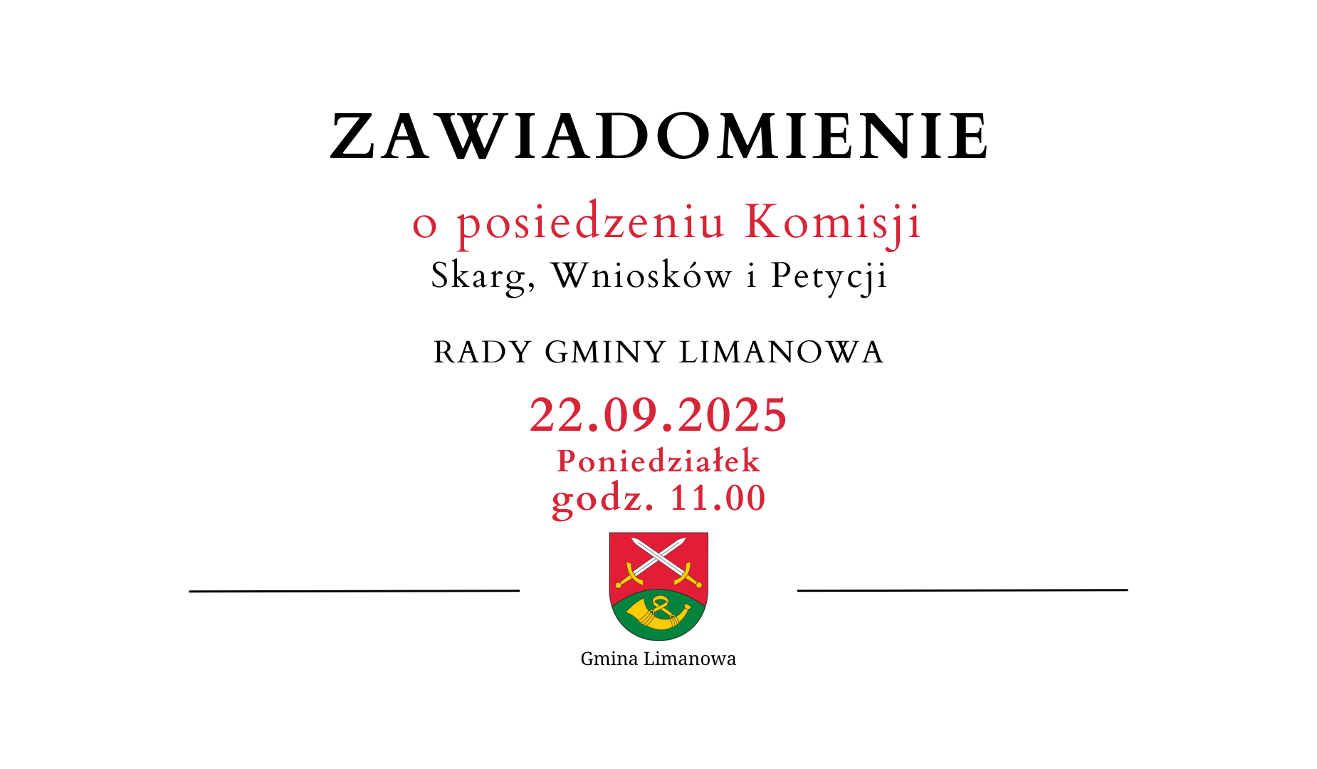 Na podstawie § 60 ust. 3 uchwały Nr XXIX/278/2018 Rady Gminy Limanowa z dnia 6 września 2018 r. w sprawie Statutu Gminy Limanowa (Dz. Urz. Woj. Mał. z 2018 r. poz. 6395) zapraszam na posiedzenie Komisji Skarg, Wniosków i Petycji Rady Gminy Limanowa, które odbędzie się w dniu 22 września 2025 r. /poniedziałek/ o godz. 11.00 w sali konferencyjnej Urzędu Gminy Limanowa.