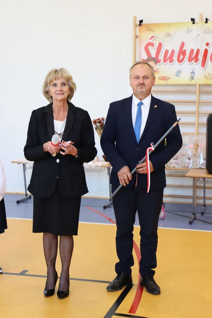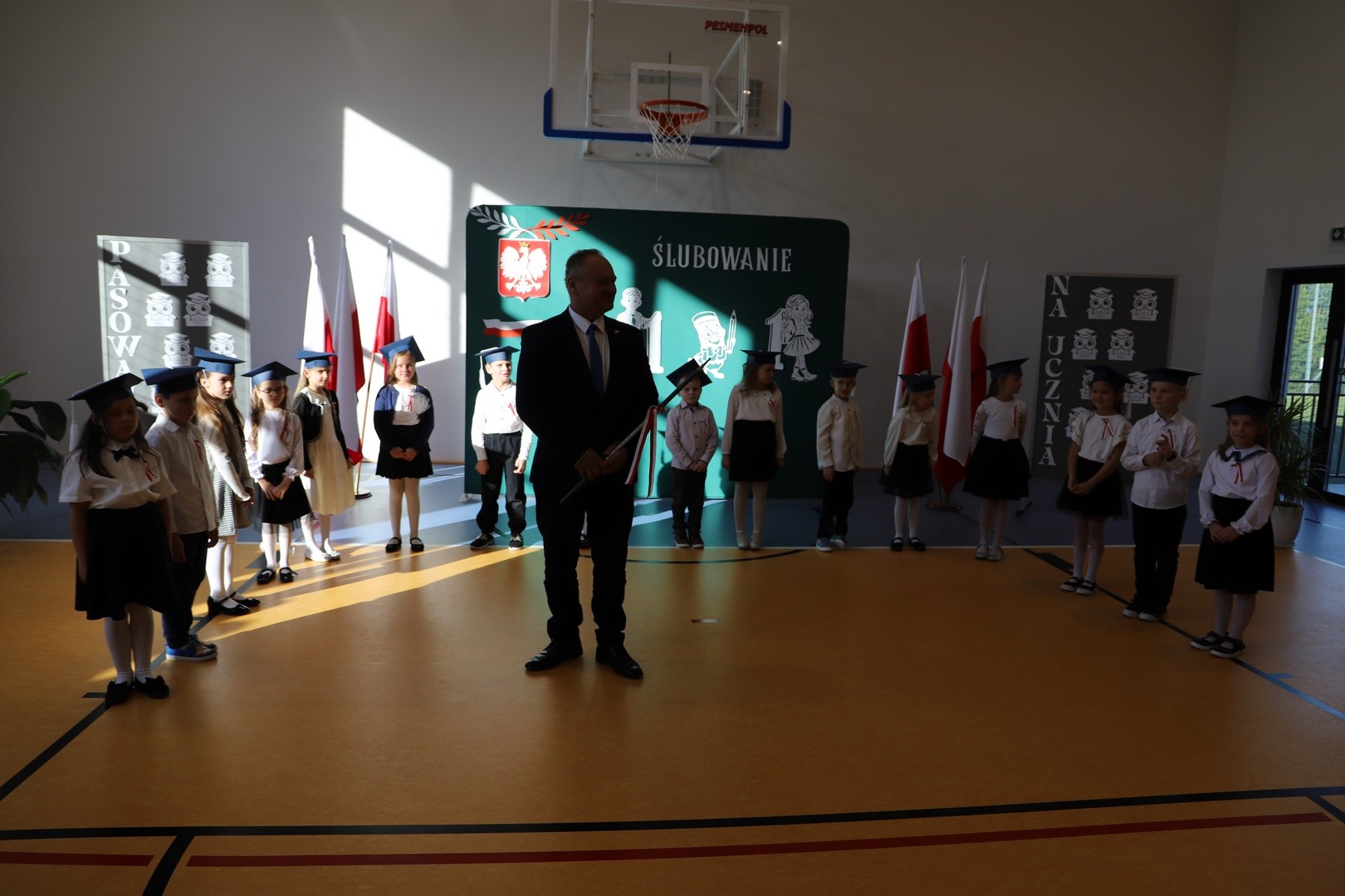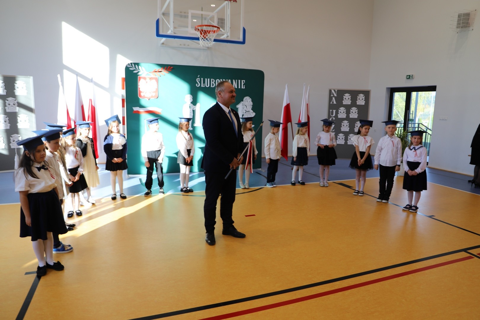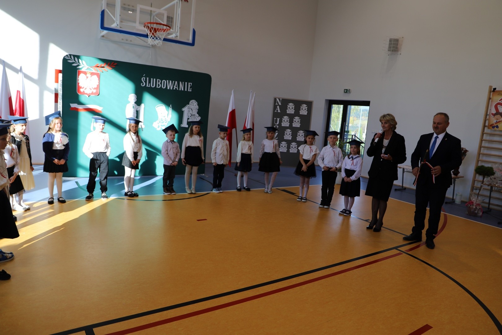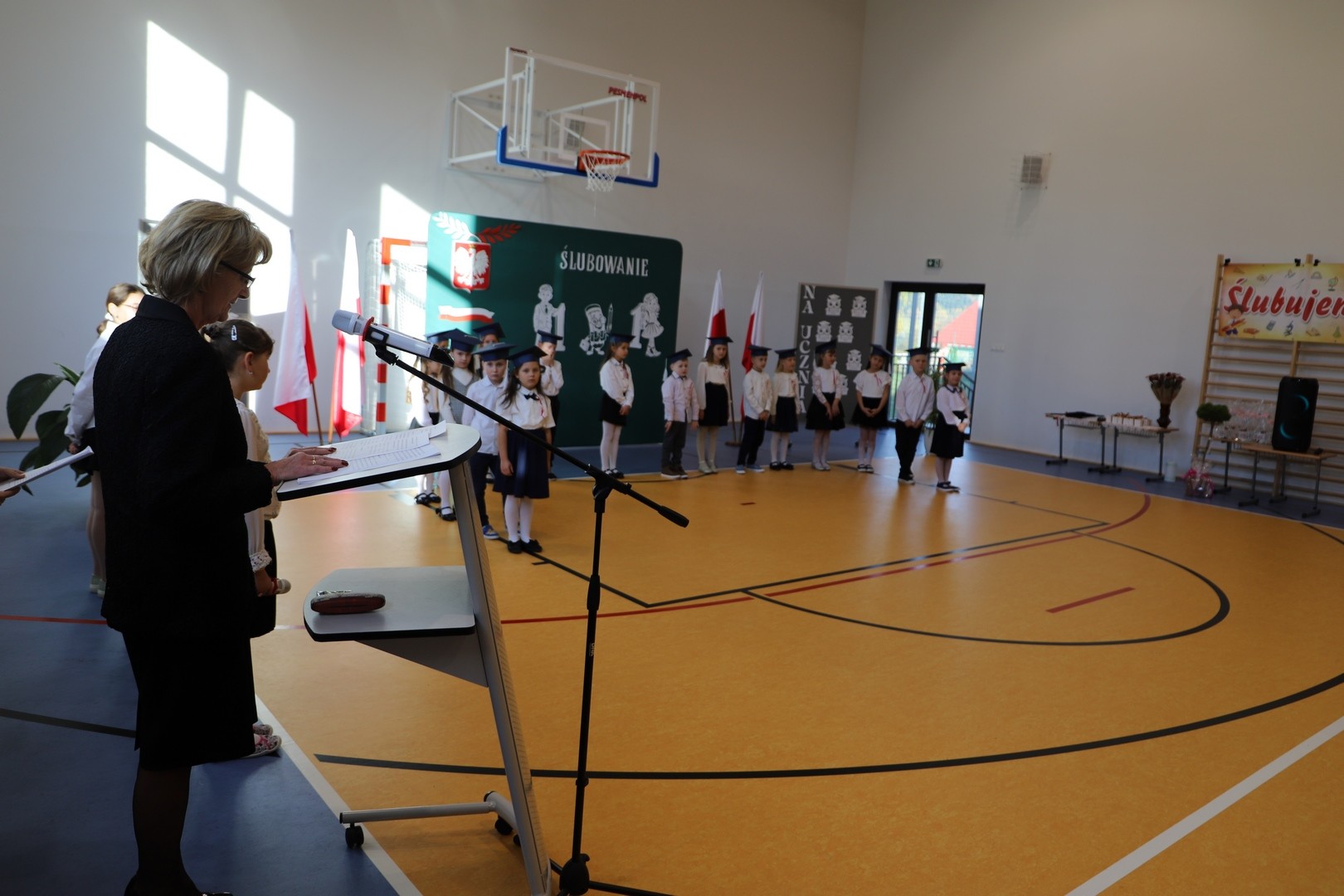 Dzisiaj, to szczególny dzień - powiedziała dyrektor, po raz pierwszy na uroczystości ślubowania, gromadzimy się w pięknej nowej sali gimnastycznej, aby za chwilę pierwszoklasiści złożyli ślubowanie i zostali pasowani na ucznia. To chwila, aby jeszcze raz podziękować Wójtowi Janowi Skrzekutowi i wyrazić ogromną wdzięczność za piękny, nowoczesny obiekt i salę gimnastyczną.