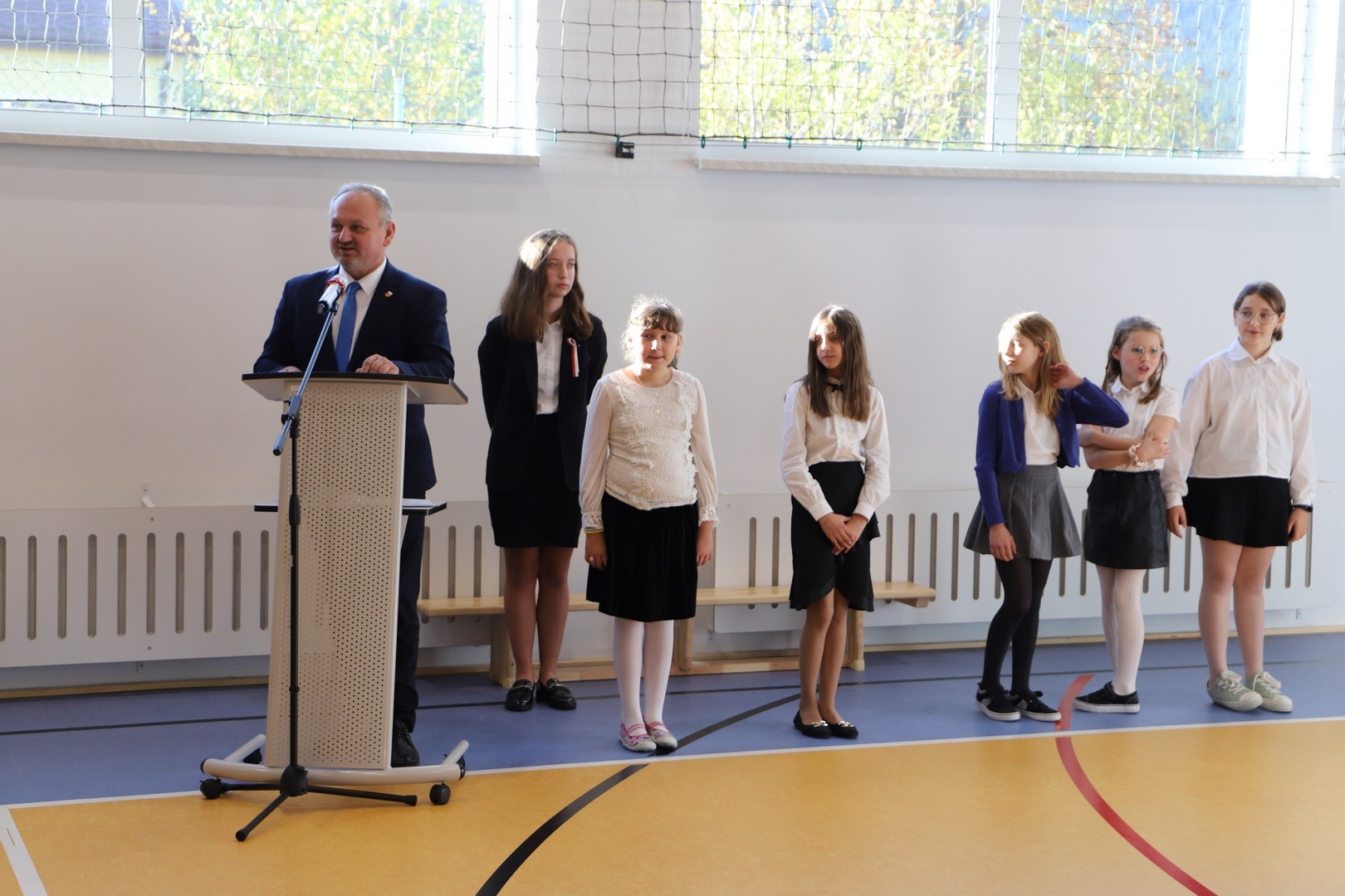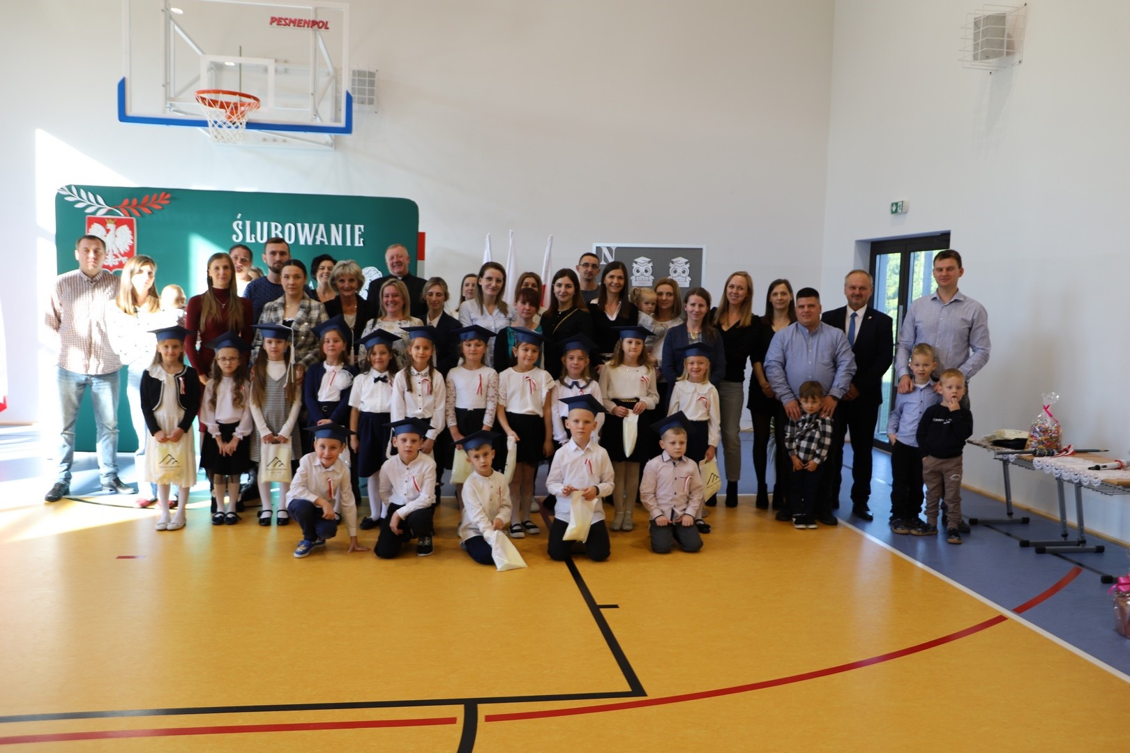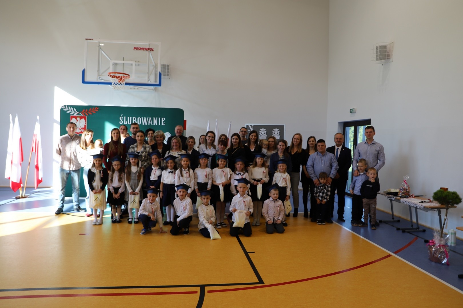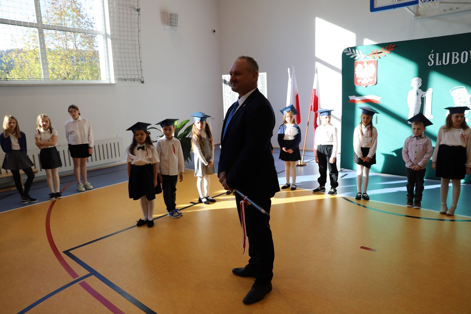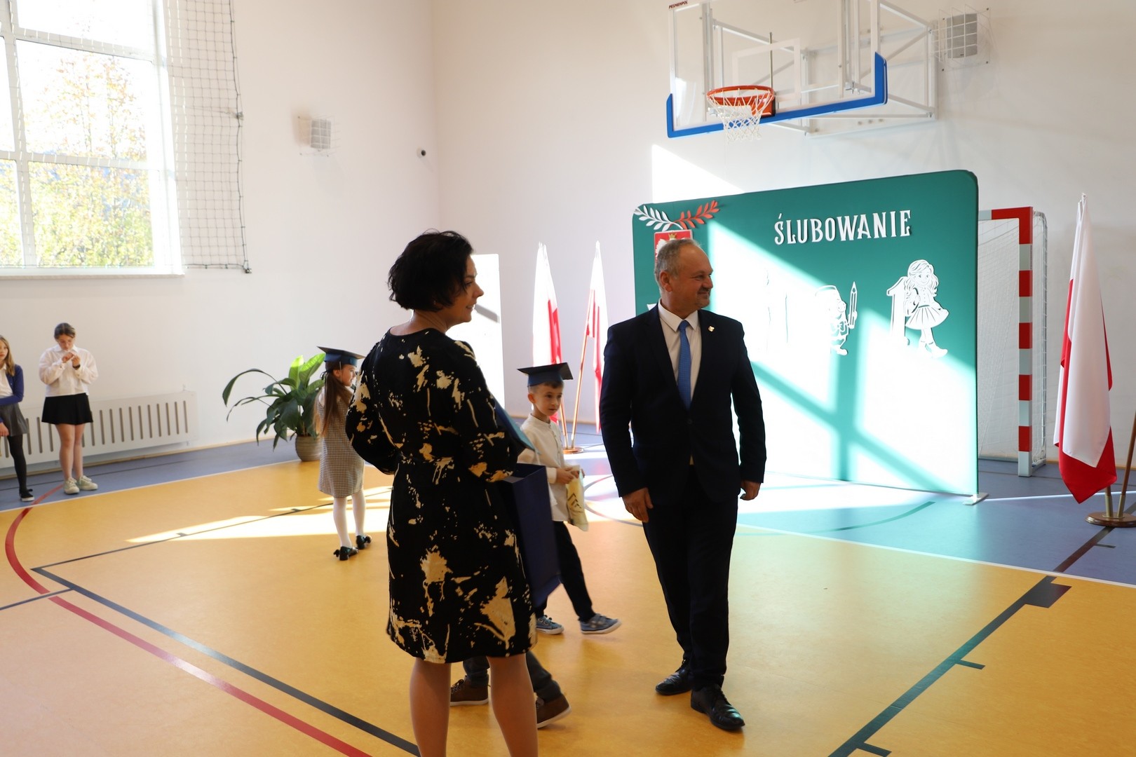 Dzisiaj, to szczególny dzień - powiedziała dyrektor, po raz pierwszy na uroczystości ślubowania, gromadzimy się w pięknej nowej sali gimnastycznej, aby za chwilę pierwszoklasiści złożyli ślubowanie i zostali pasowani na ucznia. To chwila, aby jeszcze raz podziękować Wójtowi Janowi Skrzekutowi i wyrazić ogromną wdzięczność za piękny, nowoczesny obiekt i salę gimnastyczną.