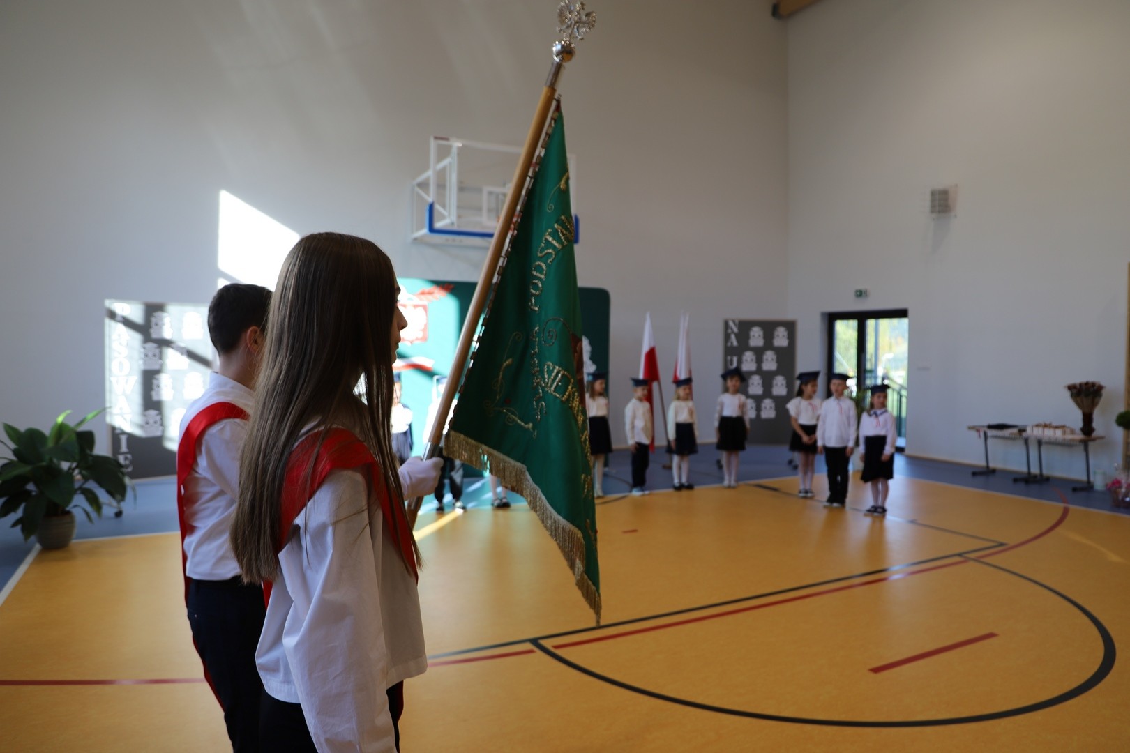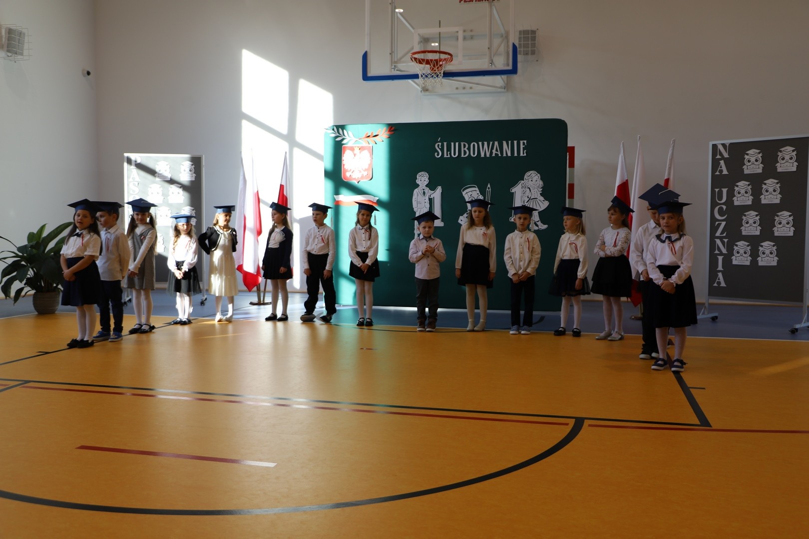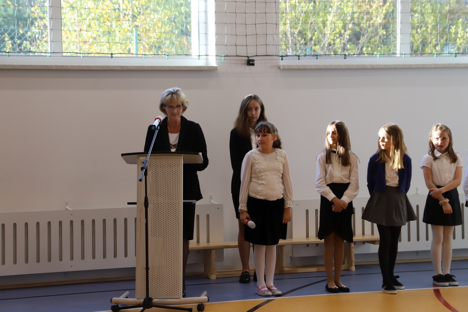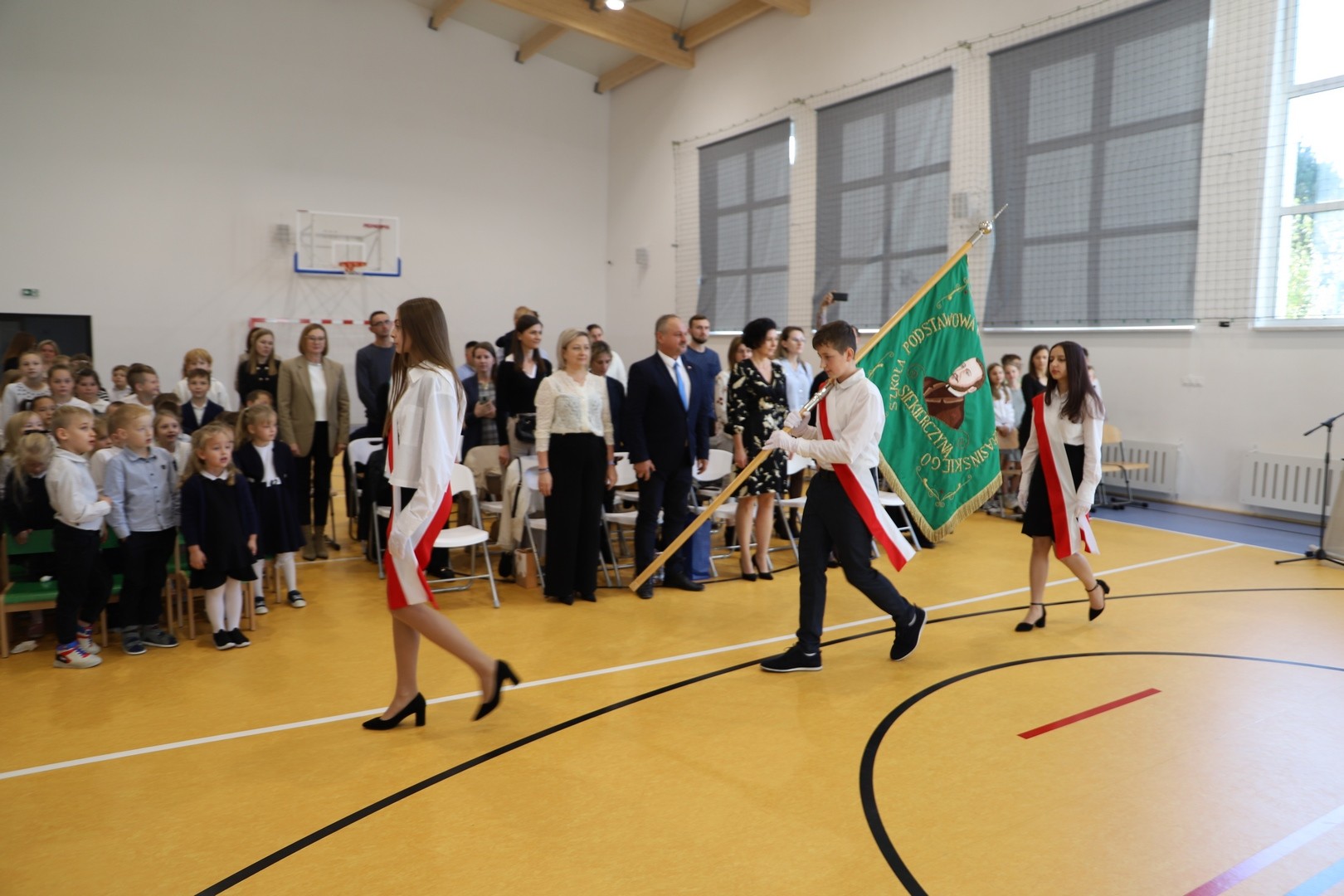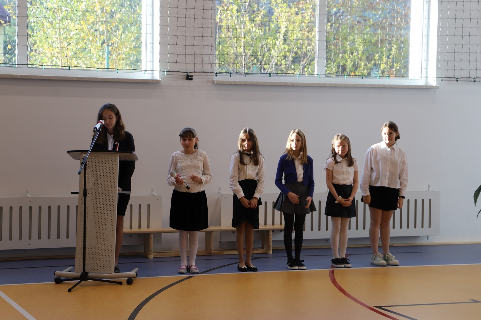 Dzisiaj, to szczególny dzień - powiedziała dyrektor, po raz pierwszy na uroczystości ślubowania, gromadzimy się w pięknej nowej sali gimnastycznej, aby za chwilę pierwszoklasiści złożyli ślubowanie i zostali pasowani na ucznia. To chwila, aby jeszcze raz podziękować Wójtowi Janowi Skrzekutowi i wyrazić ogromną wdzięczność za piękny, nowoczesny obiekt i salę gimnastyczną.