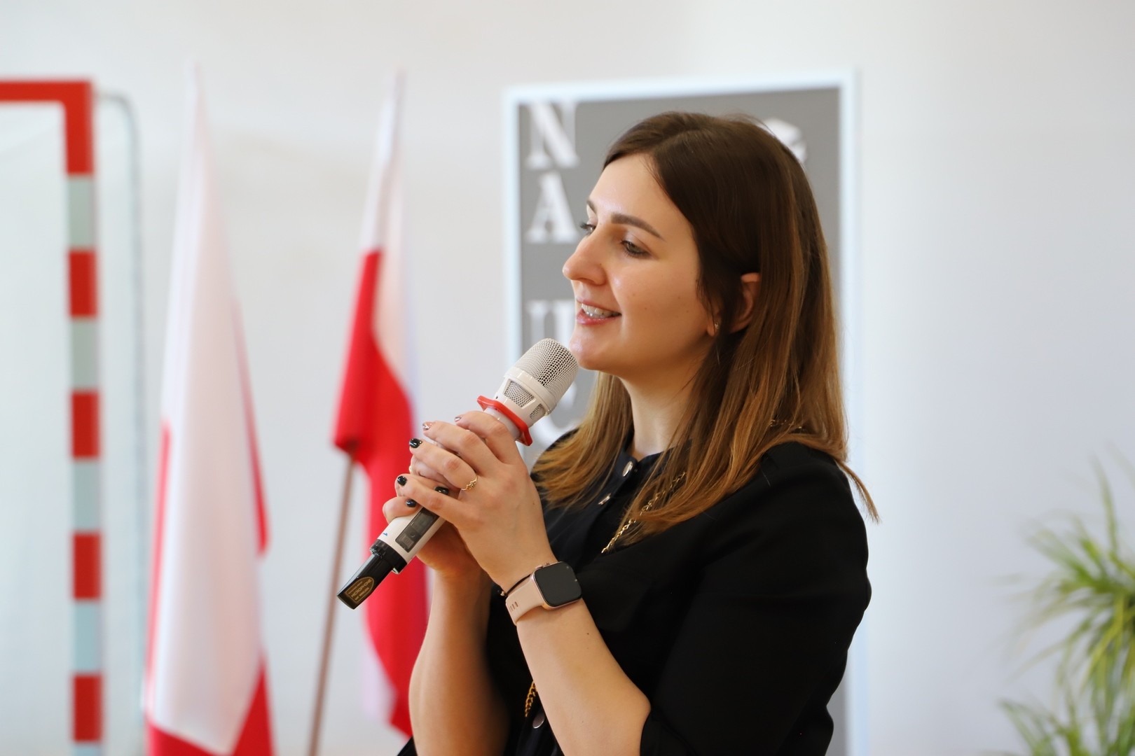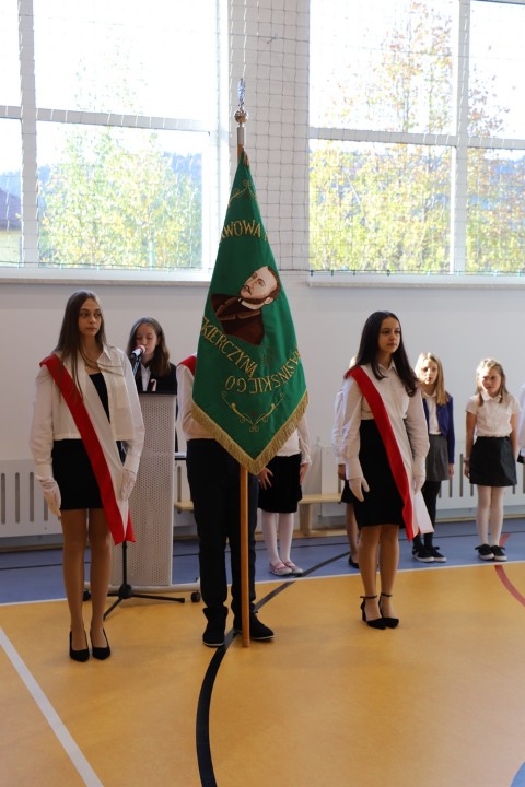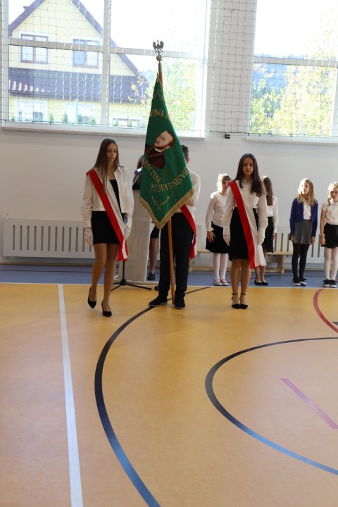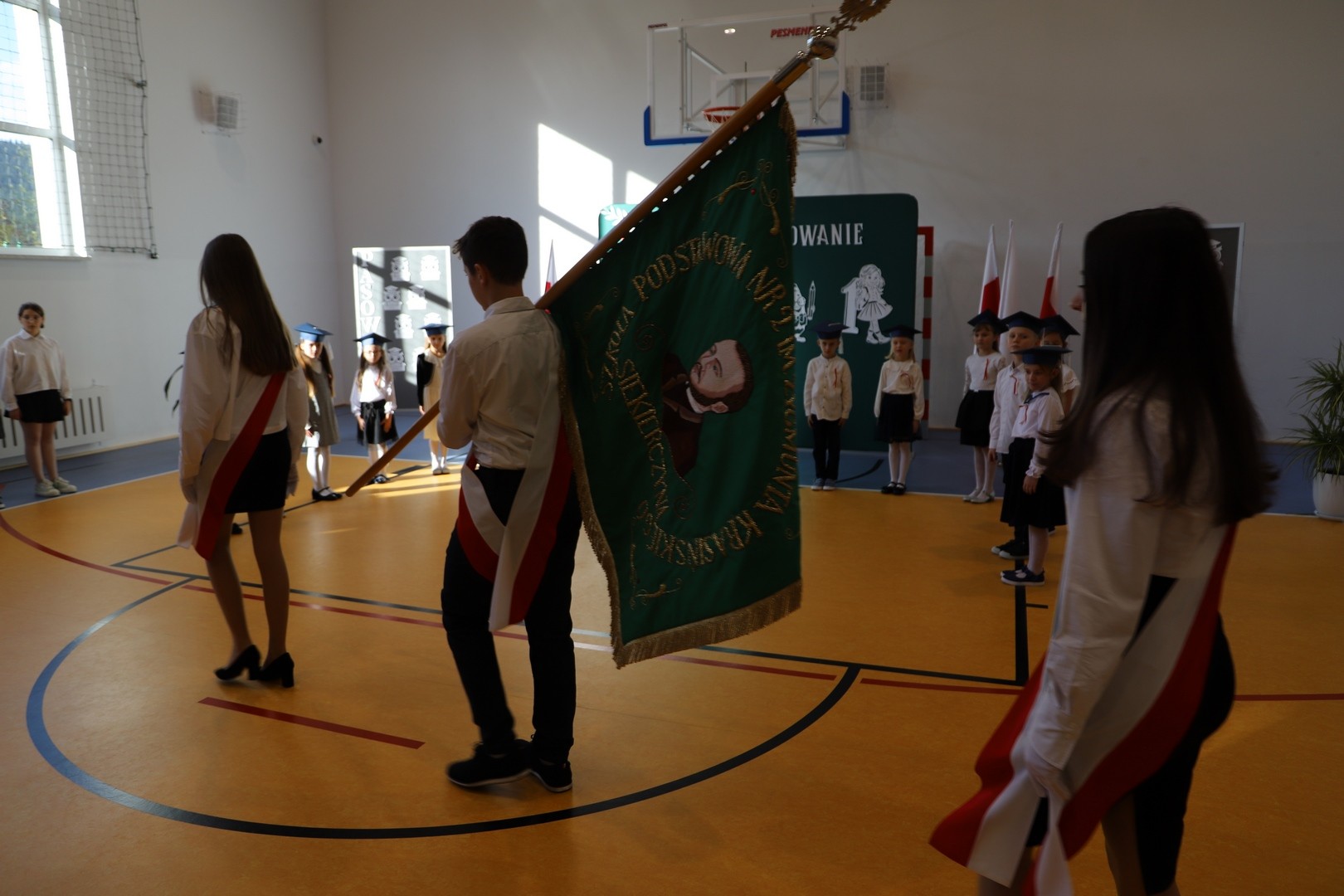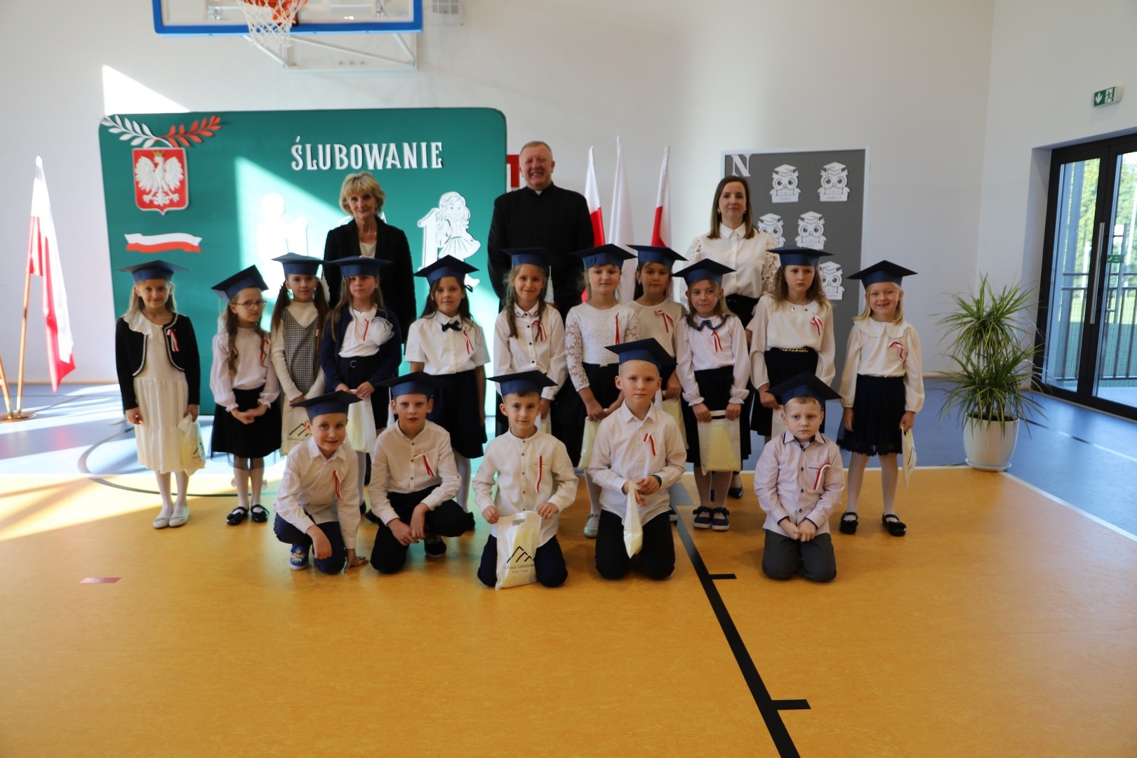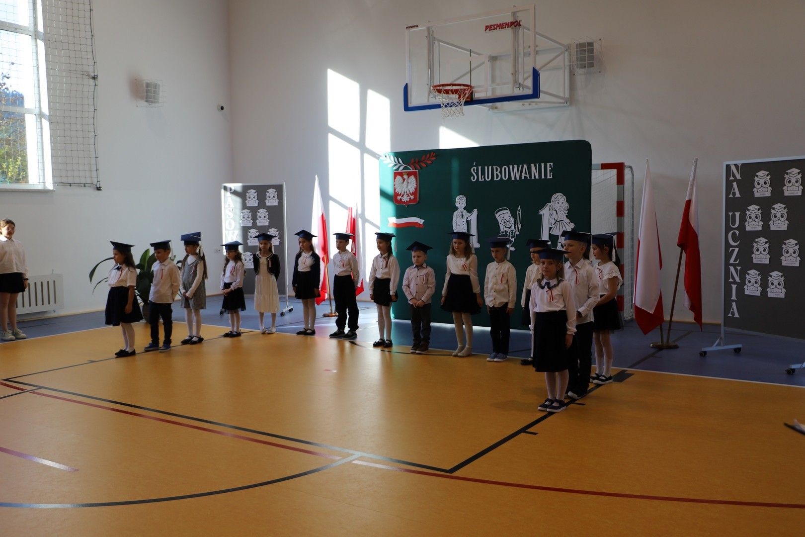 Dzisiaj, to szczególny dzień - powiedziała dyrektor, po raz pierwszy na uroczystości ślubowania, gromadzimy się w pięknej nowej sali gimnastycznej, aby za chwilę pierwszoklasiści złożyli ślubowanie i zostali pasowani na ucznia. To chwila, aby jeszcze raz podziękować Wójtowi Janowi Skrzekutowi i wyrazić ogromną wdzięczność za piękny, nowoczesny obiekt i salę gimnastyczną.