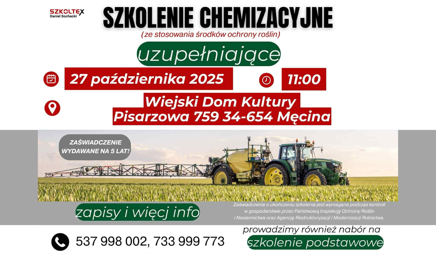 Zaproszenie na szkolenie chemizacyjne (ze stosowania środków ochrony roślin)