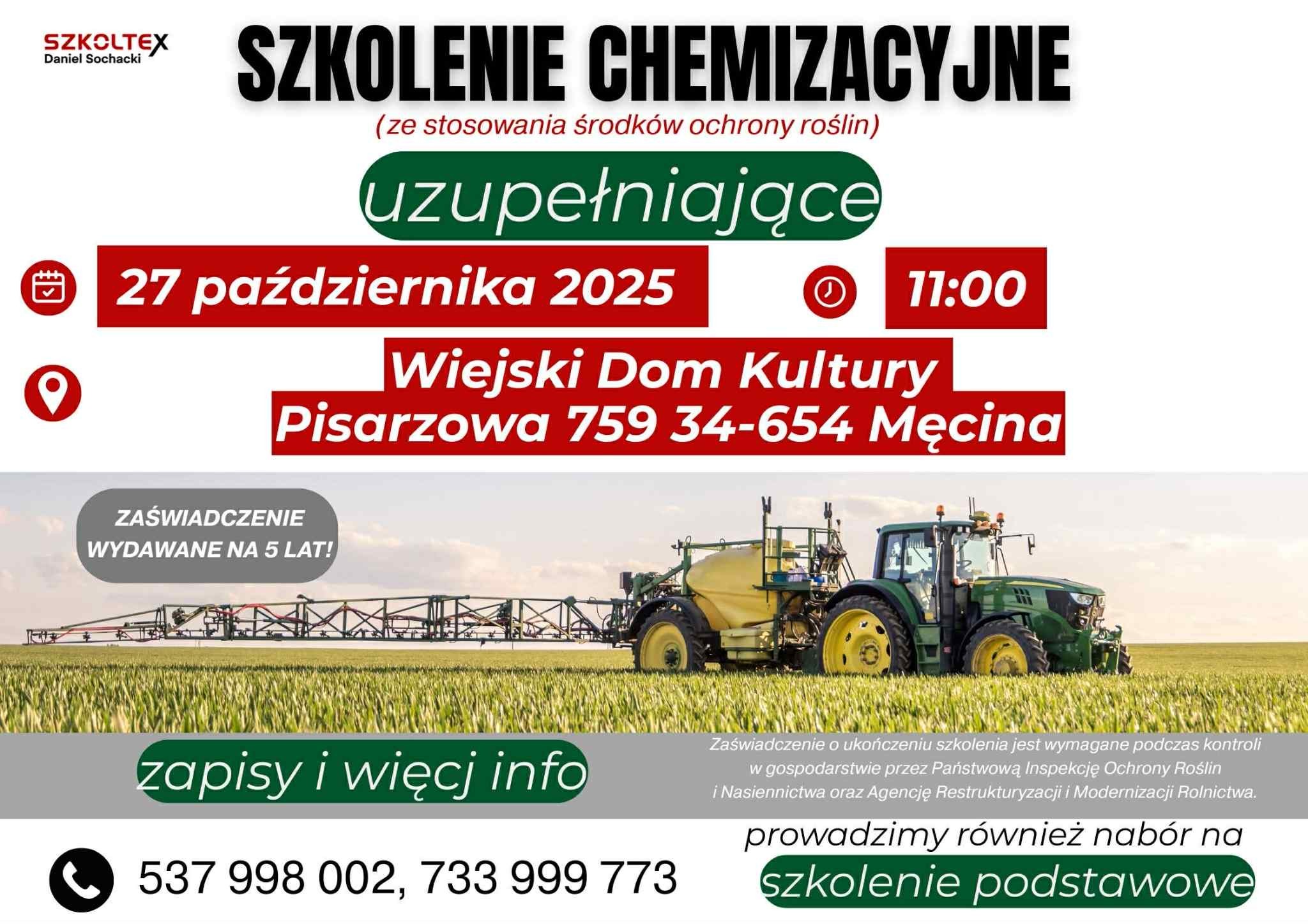 W imieniu organizatorów serdecznie zapraszamy na szkolenie chemizacyjne (ze stosowania środków ochrony roślin), które odbędzie się w Wiejskim Domu Kultury w Pisarzowej dnia 27 października 2025 roku o godzinie 11.00.