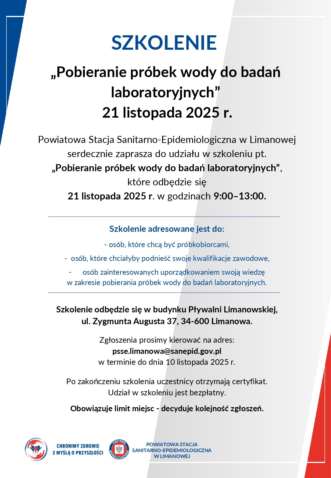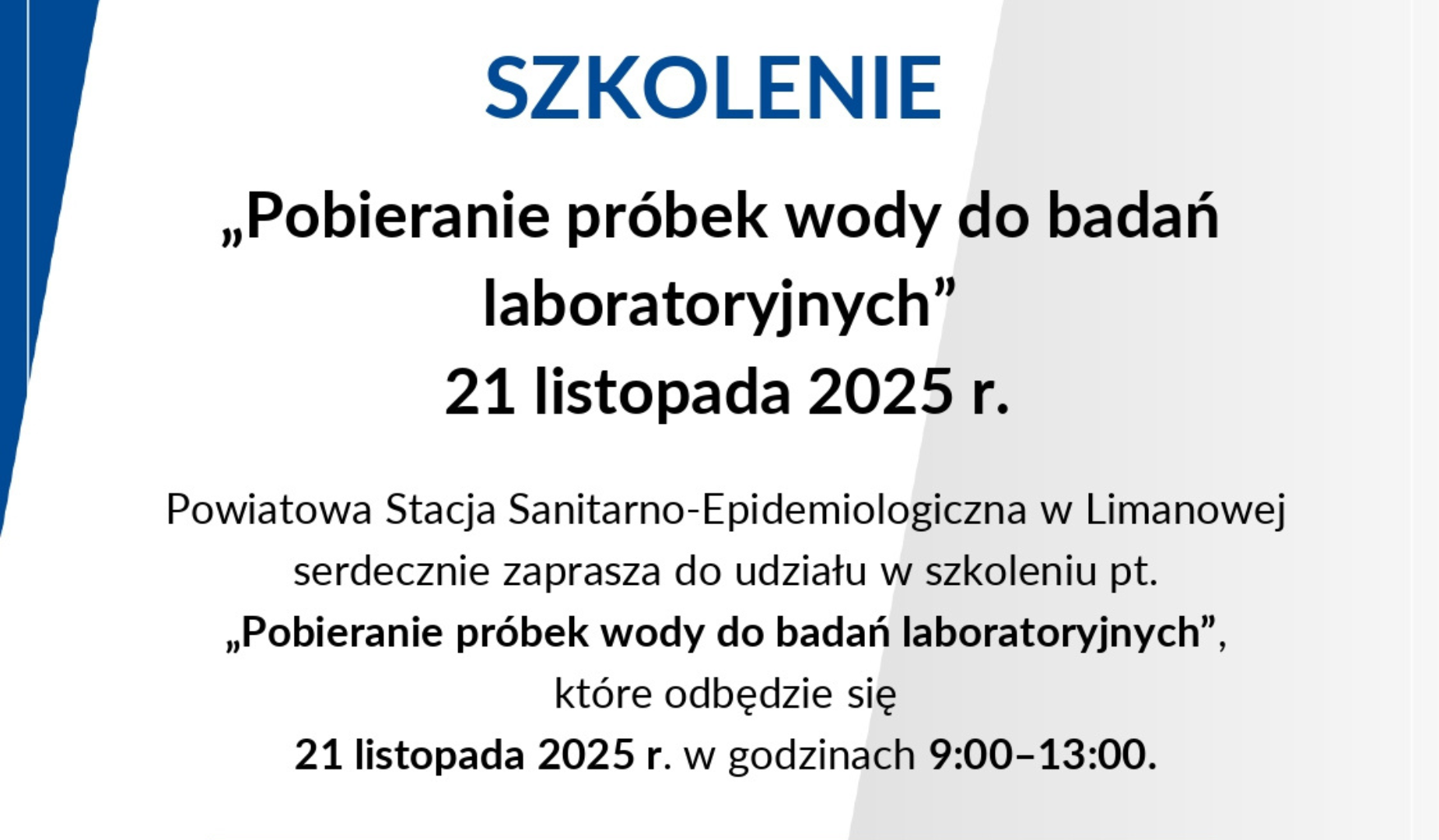 Powiatowa Stacja Sanitarno-Epidemiologiczna w Limanowej serdecznie zaprasza do udziału w szkoleniu pt. „Pobieranie próbek wody do badań laboratoryjnych”, które odbędzie się 21 listopada 2025 r. w godzinach 9:00–13:00 w budynku Pływalni Limanowskiej, ul. Zygmunta Augusta 37, 34-600 Limanowa.