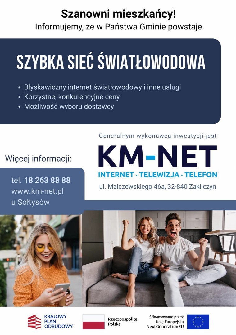 Na prośbę firmy KM-NET, która na terenie gminy Limanowa realizuje zadanie polegające na dostarczeniu mieszkańcom dostępu do sieci światłowodowej, podajemy do publicznej wiadomości komunikat :