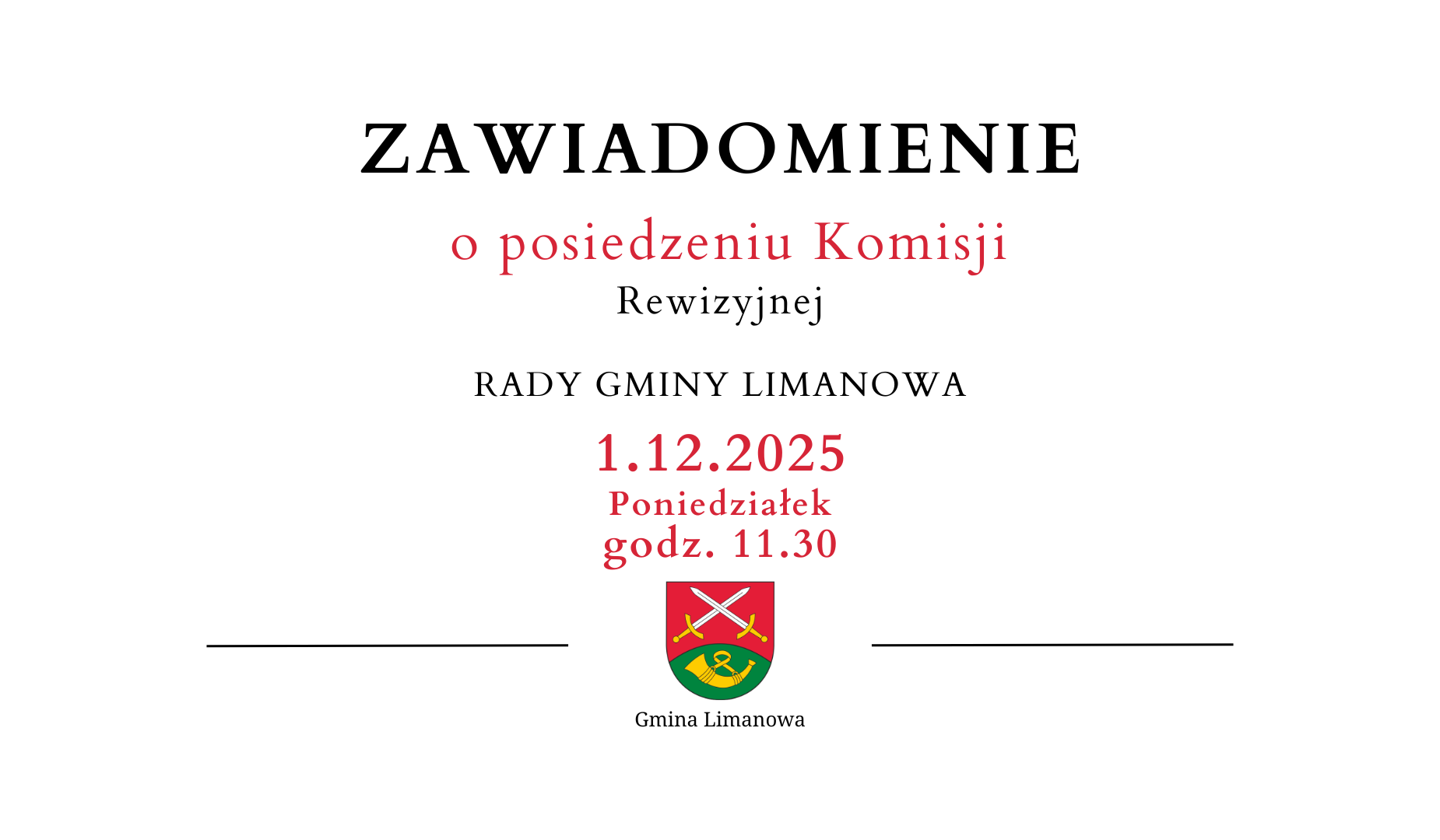 Zawiadomienie o posiedzeniu Komisji Rewizyjnej Rady Gminy Limanowa - 1.12