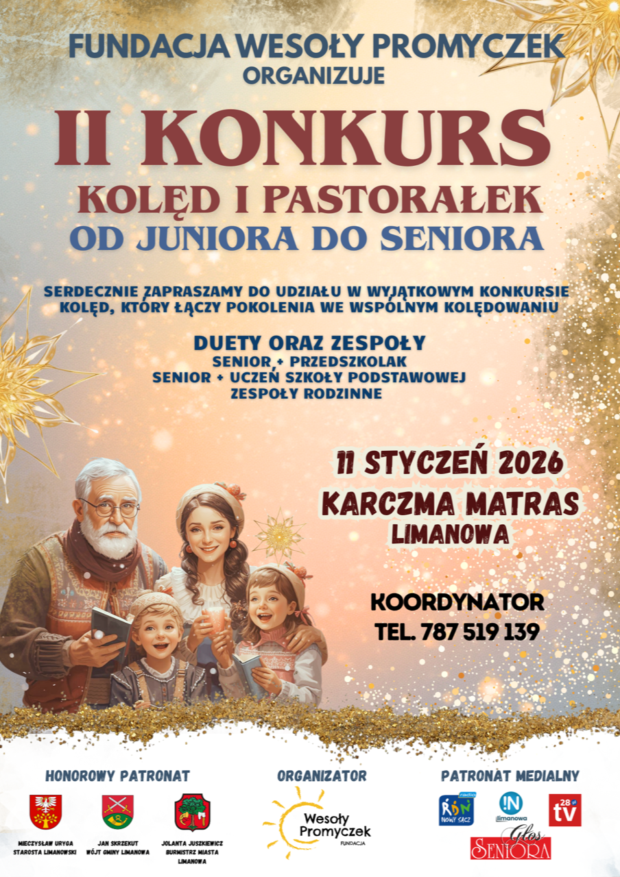 W imieniu Fundacji Wesoły Promyczek z Limanowej serdecznie zapraszamy na II Konkursu Kolęd i Pastorałek – od Juniora do Seniora.