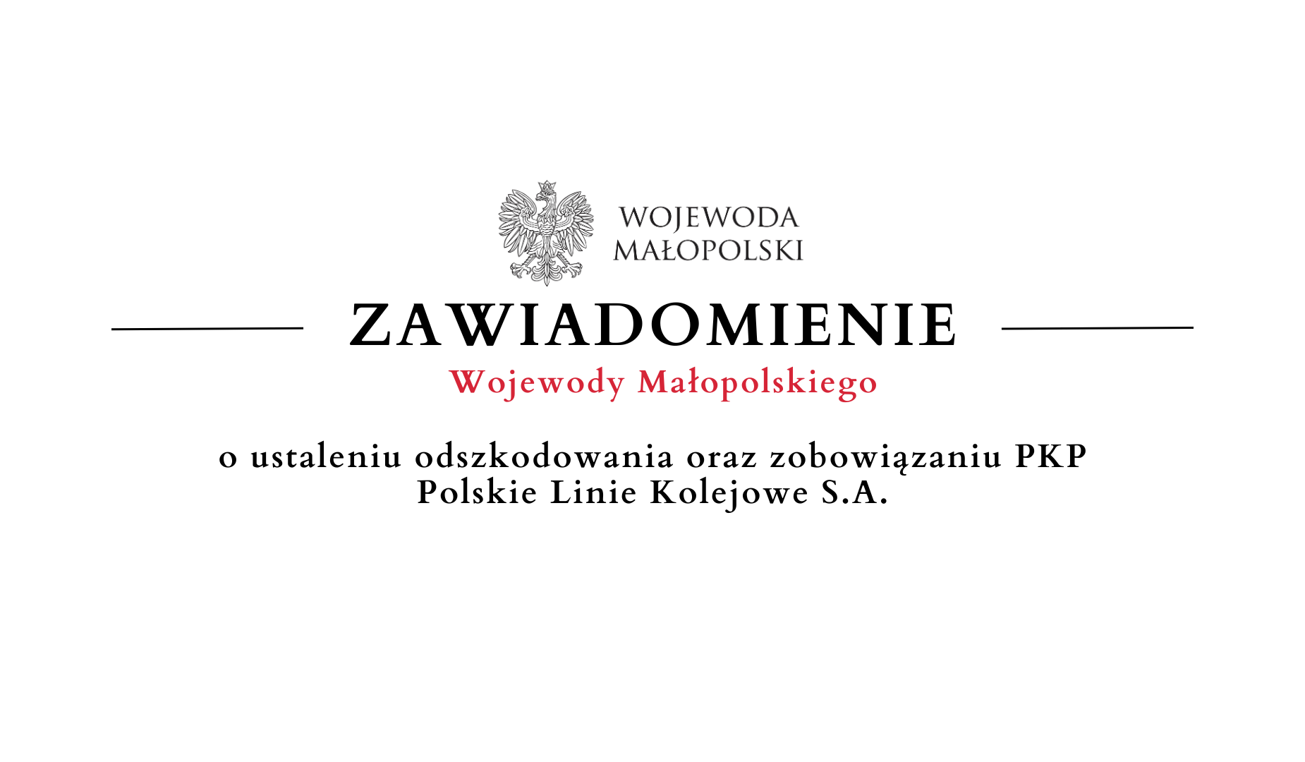 Na podstawie ustawy z dnia 28 marca 2003 r. o transporcie kolejowym (tekst jednolity: Dz. U. z 2025 r., poz. 1234), art. 118a ust. 2 ustawy z dnia 21 sierpnia 1997 r. o gospodarce nieruchomościami (tekst jednolity: Dz. U. z 2024 r., poz. 1145 z późn. zm.), w związku z art. 49 ustawy z dnia 14 czerwca 1960 r. Kodeks postępowania administracyjnego (tekst jednolity: Dz. U. z 2025 r., poz. 1691), zawiadamiam, że Wojewoda Małopolski decyzją Nr 2 z dnia 30 grudnia 2025 r., znak: WS-VIII.7570.5.273.2024.KB, orzekł: