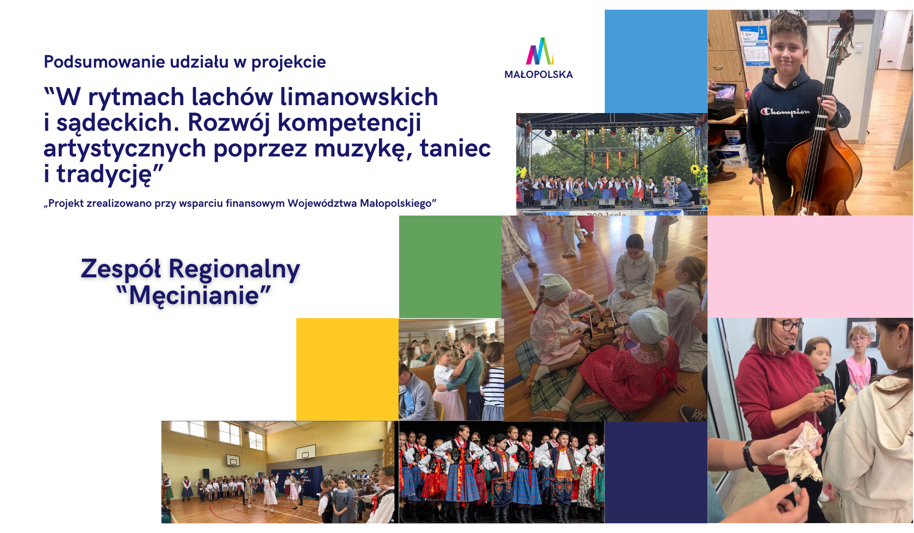 Szkoły Podstawowej nr 1 im Jana Pawła II w Męcinie, która od wielu lat aktywnie wspiera rozwój edukacji regionalnej oraz kultywowanie lokalnej tradycji; stanowiąc przy tym centrum integracji uczniów, instruktorów i lokalnych twórców ludowych. Uczestnicy projektu pod kierunkiem doświadczonych instruktorów mieli możliwość; nauki gry na tradycyjnych instrumentach (skrzypce, klarnet, trąbka, kontrabas), rozwijania muzykalności i umiejętności wokalnych w oparciu o repertuar regionalny, poznania i wykonywania tańców ludowych charakterystycznych dla regionu lachów limanowskich i sądeckich ( polka walc ), wzmacniania pewności siebie, odpowiedzialności oraz umiejętności współpracy w grupie, tworzenia układów i prezentowania ich przed publicznością. Natomiast udział w warsztatach muzealnych w Miasteczku Galicyjskim oraz spotkanie z animatorami kultury dał możliwość poznania tradycji lachów w naturalnym autentycznym kontekście-poprzez kontakt z kulturą, architekturą i historią regionu.