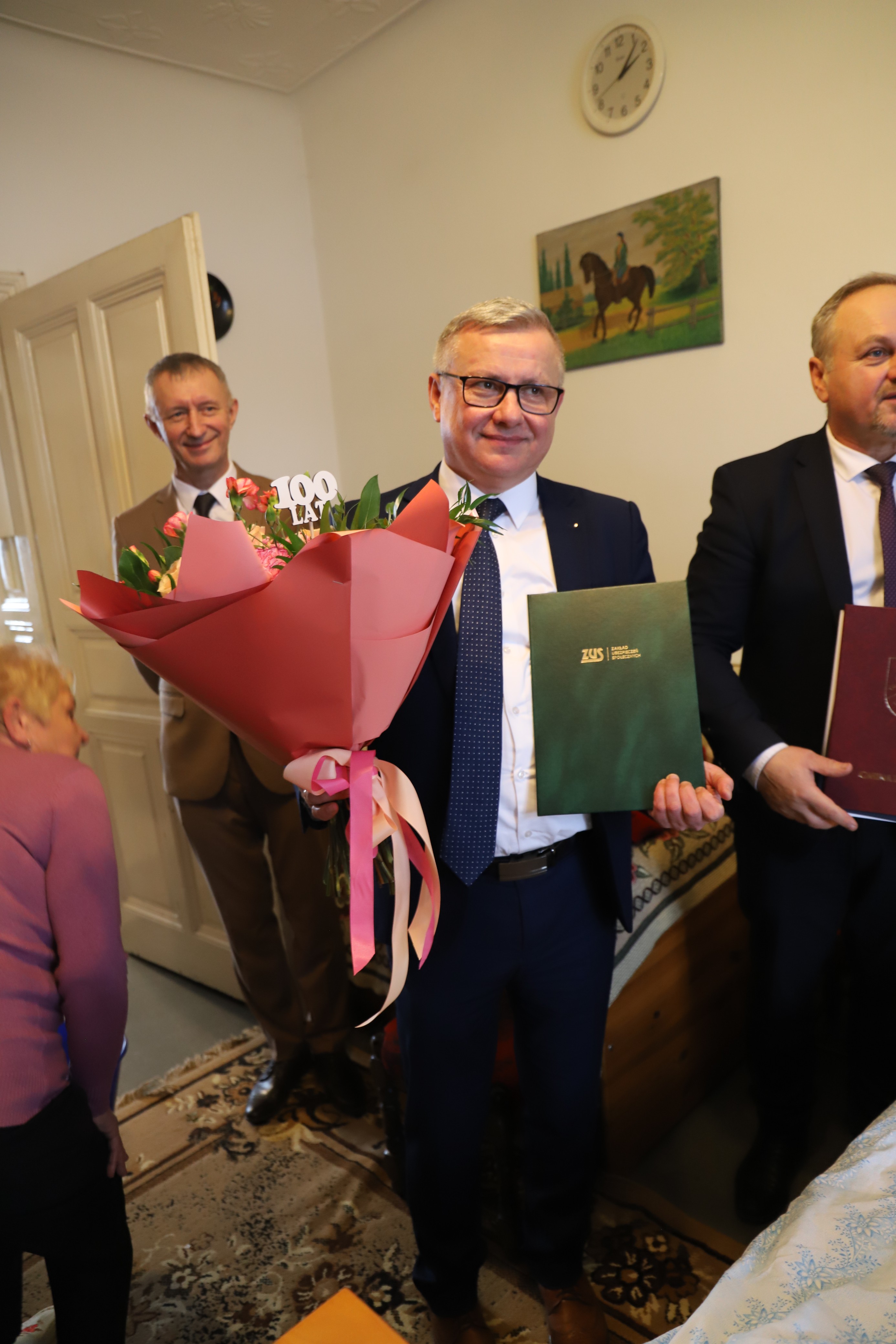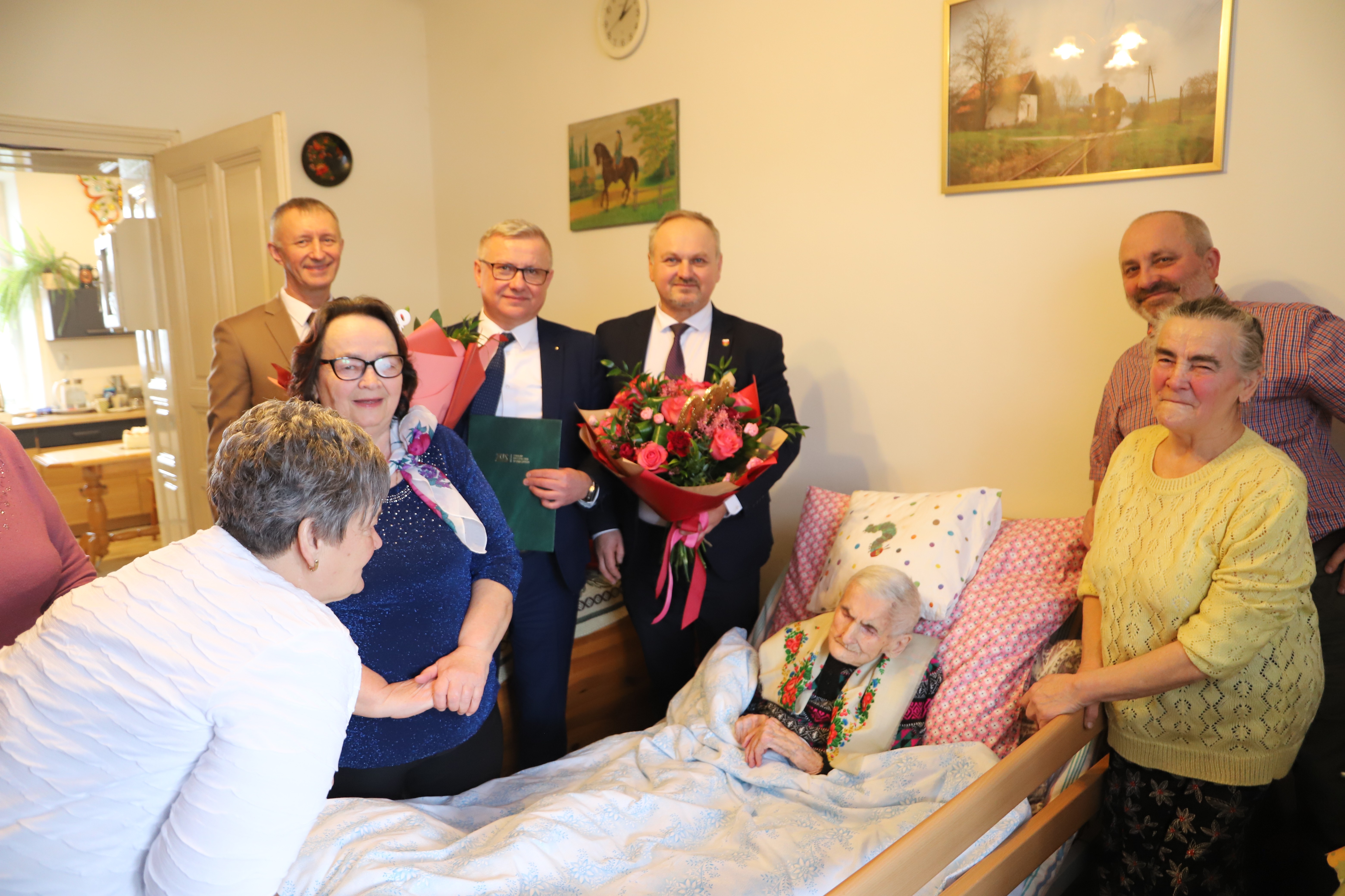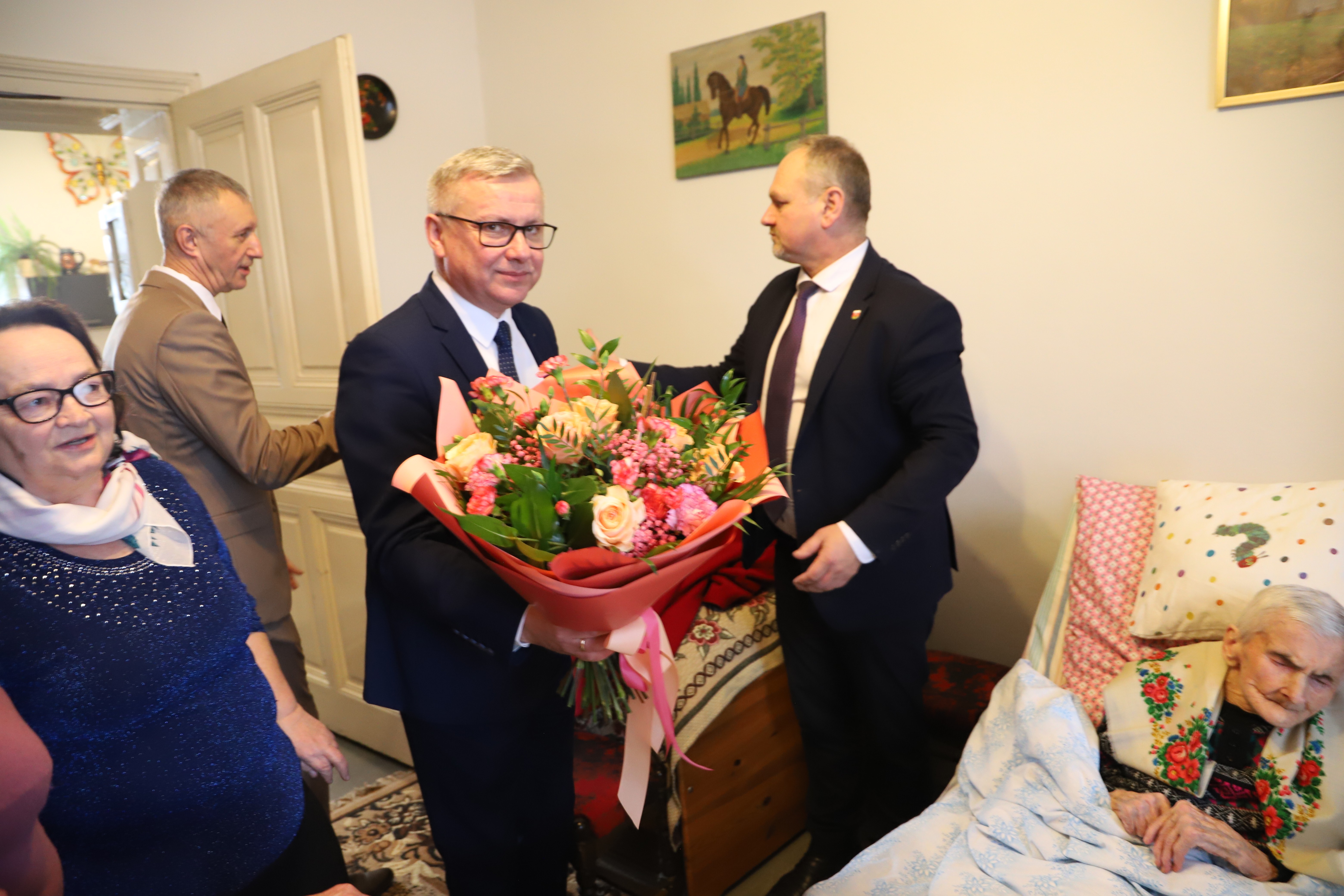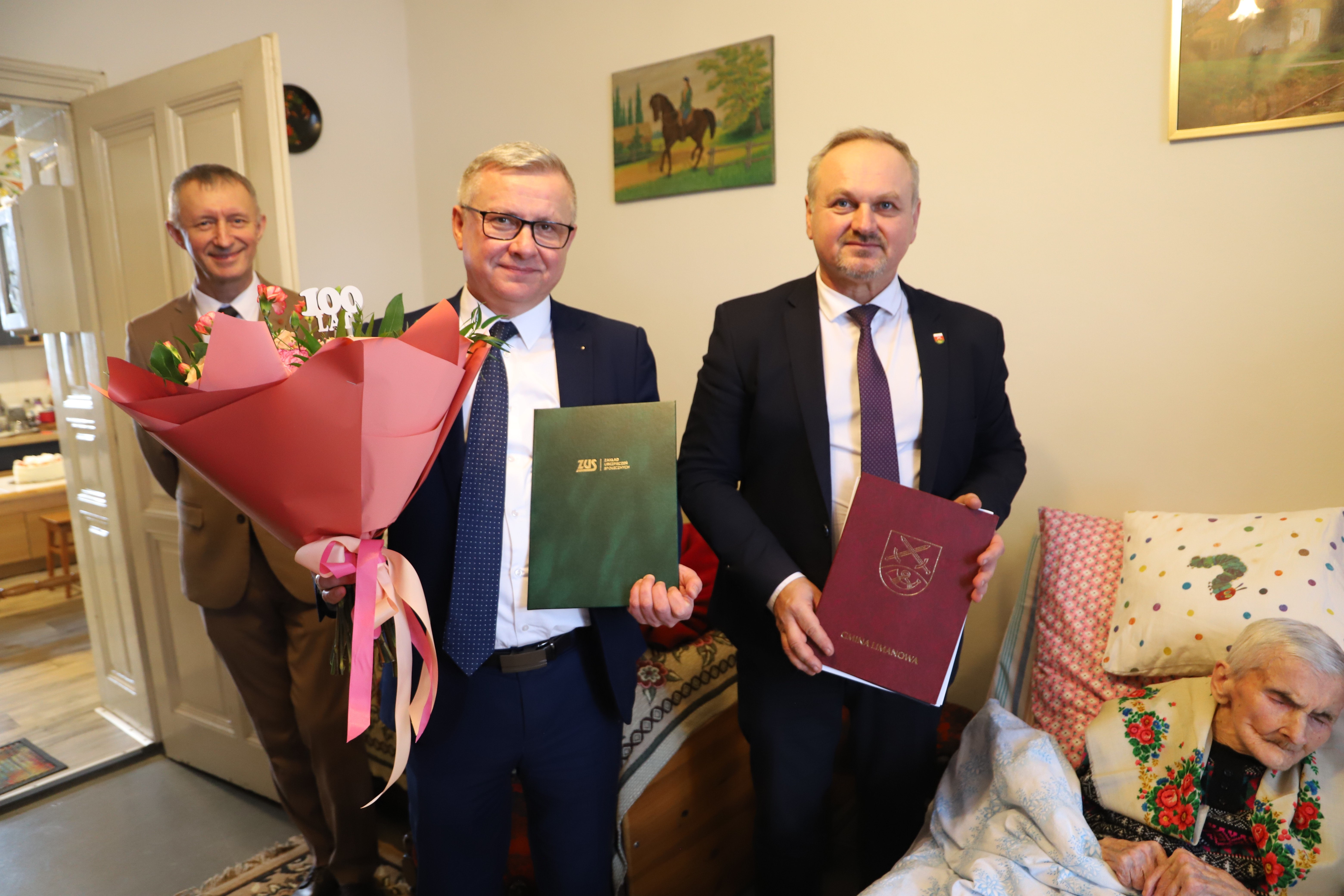 Wójt Gminy Limanowa Jan Skrzekut, Kierownik Urzędu Stanu Cywilnego Dariusz Dutka, kierownik Inspektoratu ZUS w Limanowej Andrzej Gołąb oraz najbliższa rodzina jubilatki.