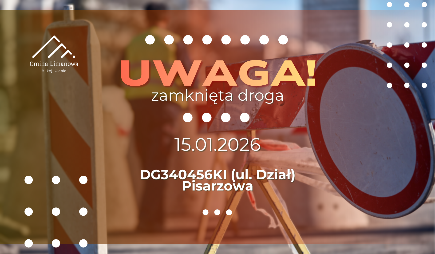 Konsorcjum firm Budimex S.A. oraz Gulermak S.A. informuje, że w związku z poprawiającą się sytuacją pogodową zamknięcie drogi DG 340456K (ul. Dział) w miejscowości Pisarzowa nastąpi w dniu 15.01.2026 (czwartek) o godzinie 11:00.