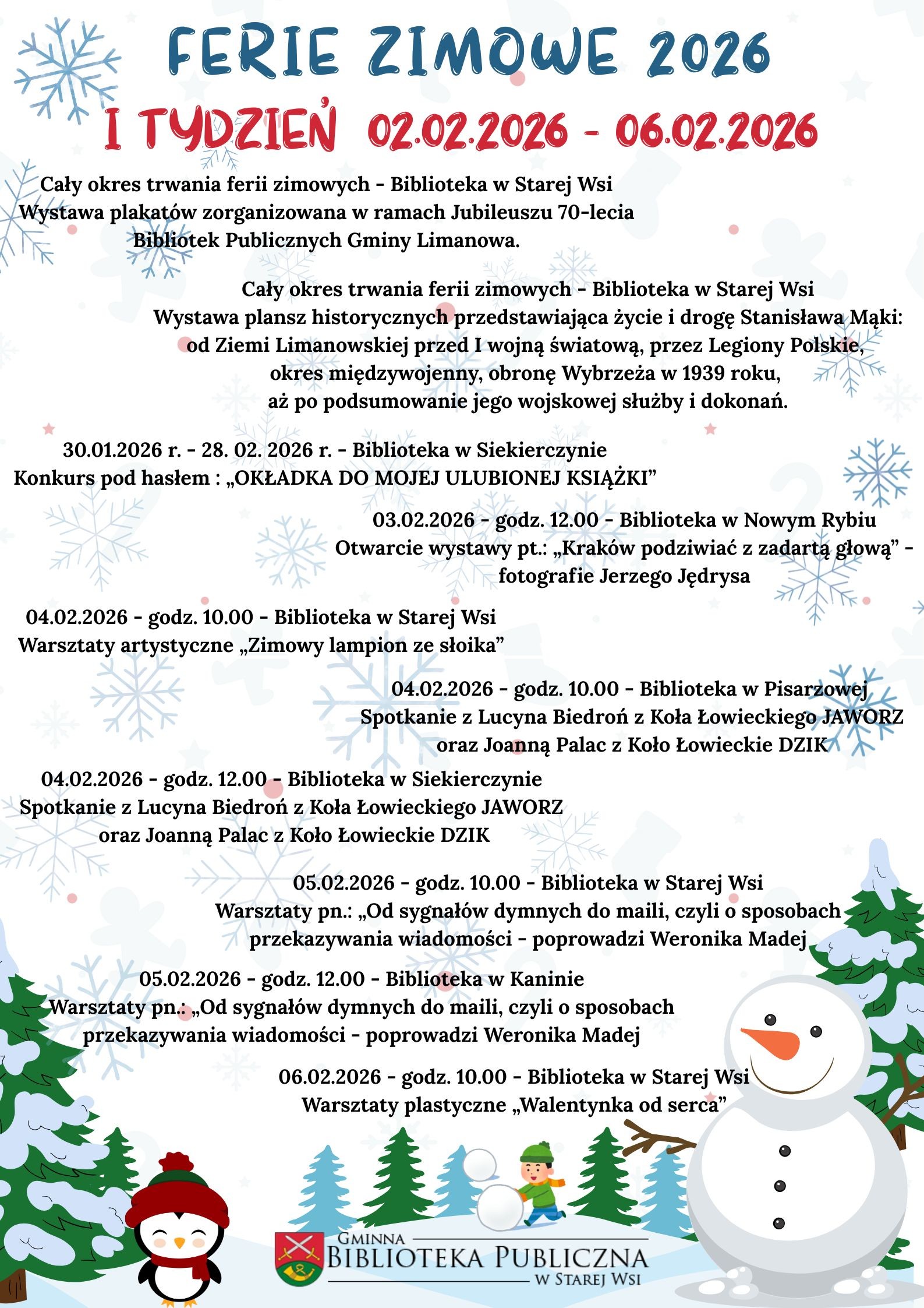 Gminna Biblioteka Publiczna w Starej Wsi wraz z filiami zaprasza dzieci do udziału w bogatej i różnorodnej ofercie zajęć przygotowanych na ferie zimowe. Program obejmuje zarówno wydarzenia kulturalne, artystyczne, jak i edukacyjne, które będą odbywać się w bibliotekach na terenie Gminy Limanowa.
