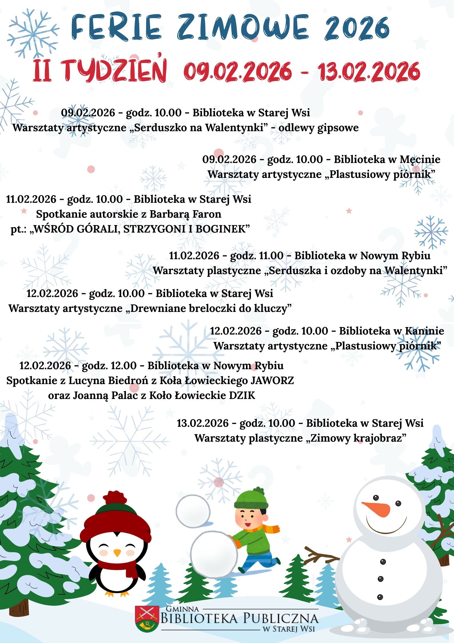 O godz. 12.00 w Bibliotece w Nowym Rybiu zaplanowano spotkanie z Lucyną Biedroń z Koła Łowieckiego „Jaworz” oraz Joanną Palac z Koła Łowieckiego „Dzik”. Zwieńczeniem ferii będą warsztaty plastyczne „Zimowy krajobraz”, które odbędą się