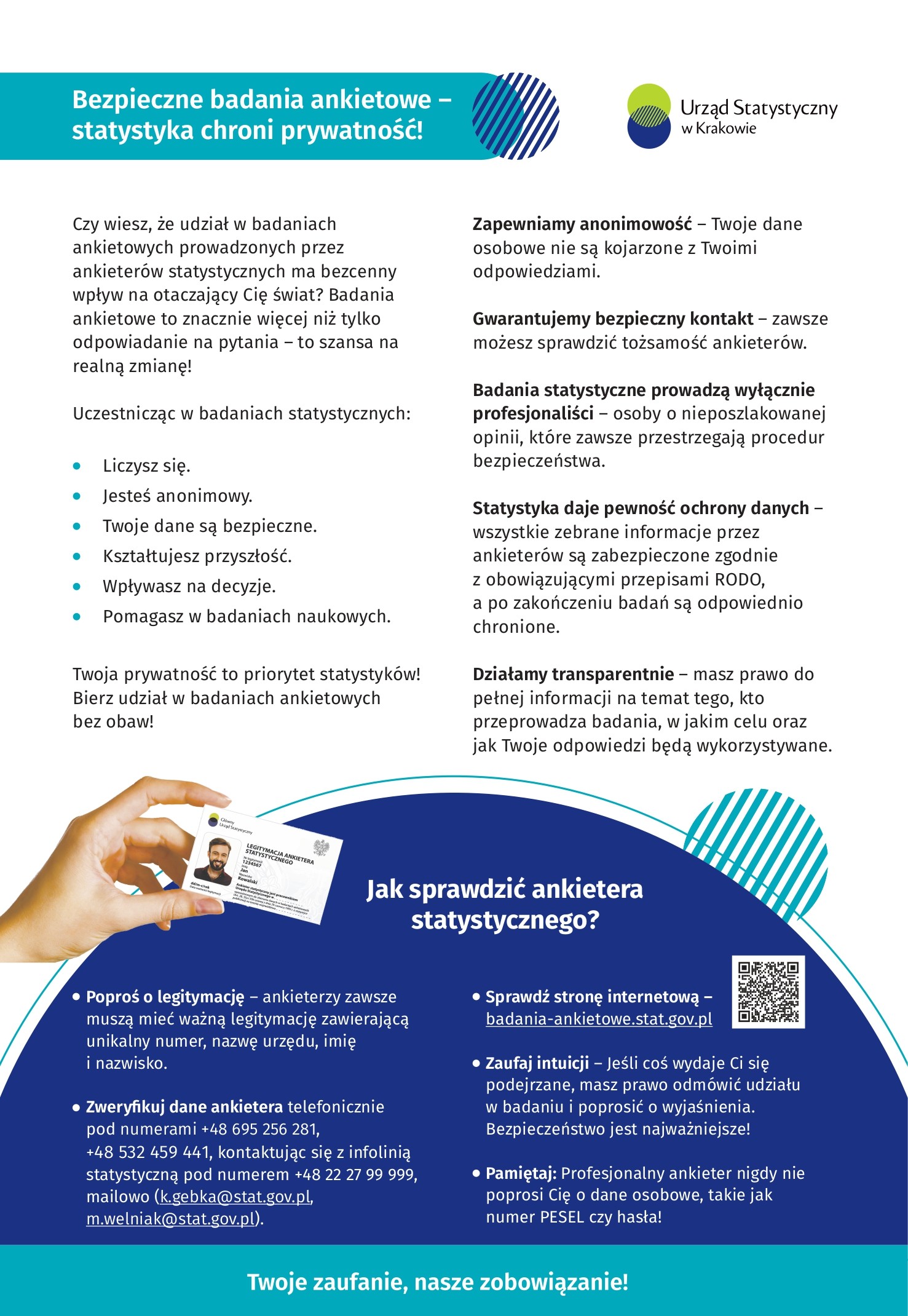 Urząd Statystyczny w Krakowie dokłada wszelkich starań w celu ochrony prywatności i bezpieczeństwa osób biorących udział w badaniach. To jeden z priorytetów prowadzonej przez Urząd kampanii informacyjnej, mającej na celu przybliżenie mieszkańcom województwa małopolskiego znaczenia statystyki publicznej oraz informowanie o prowadzonych działaniach. Najważniejsze informacje o realizowanych badaniach ankietowych w Małopolsce – w tym dotyczące terminów, stosowanych formularzy, a także metod weryfikacji tożsamości ankieterów – znajdują się na stronie internetowej Urzędu Statystycznego w Krakowie