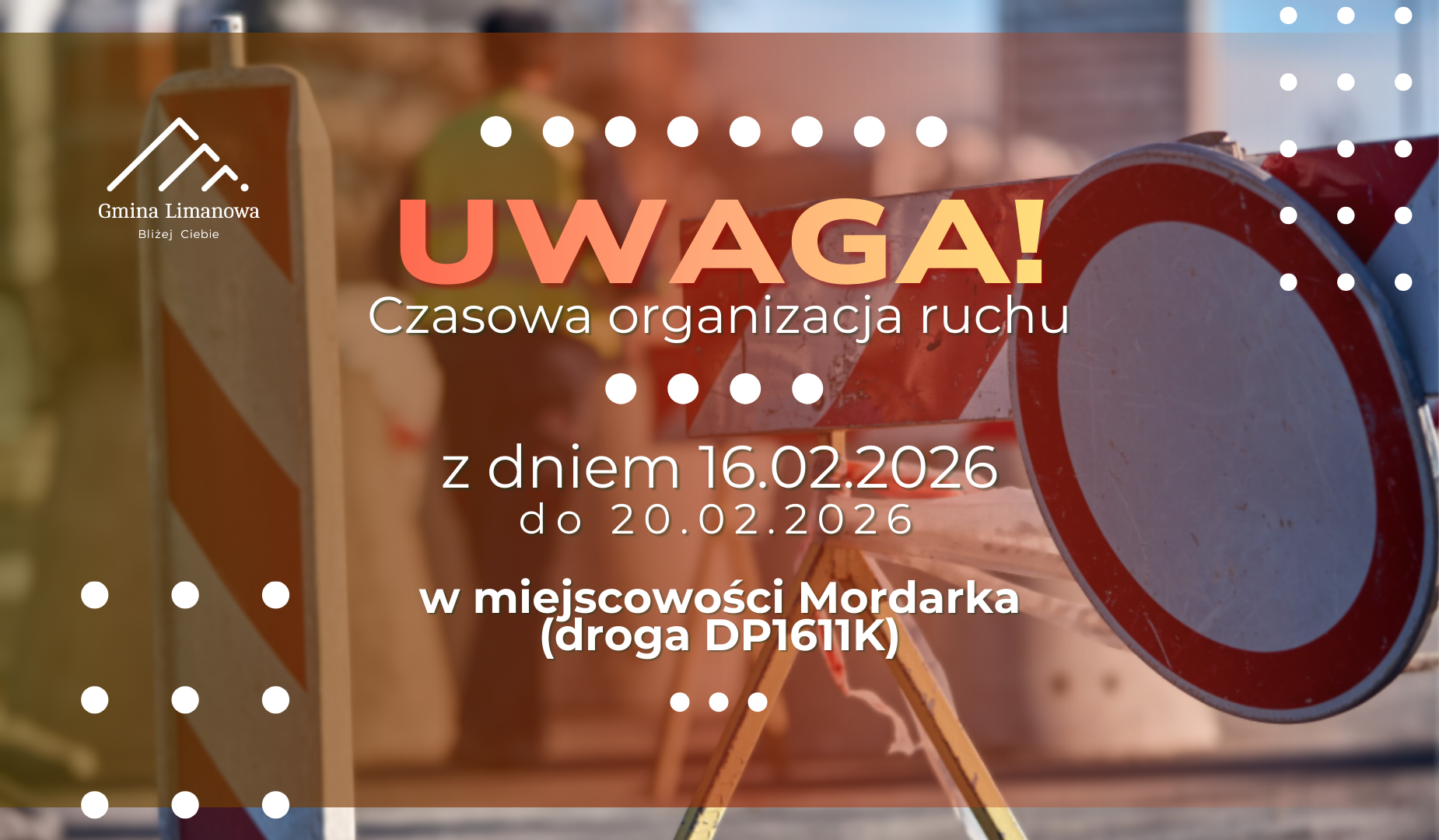 Konsorcjum firm Budimex S.A. oraz Gulermak S.A. zawiadamia o wprowadzeniu czasowej organizacji ruchu na drodze DP1611K w miejscowości Mordarka - etap 3 (na czas rozdeskowywania obiektu mostowego) od dnia 16.02.2026 od godziny 8:00 do dnia 20.02.2026 do godziny 20:00.