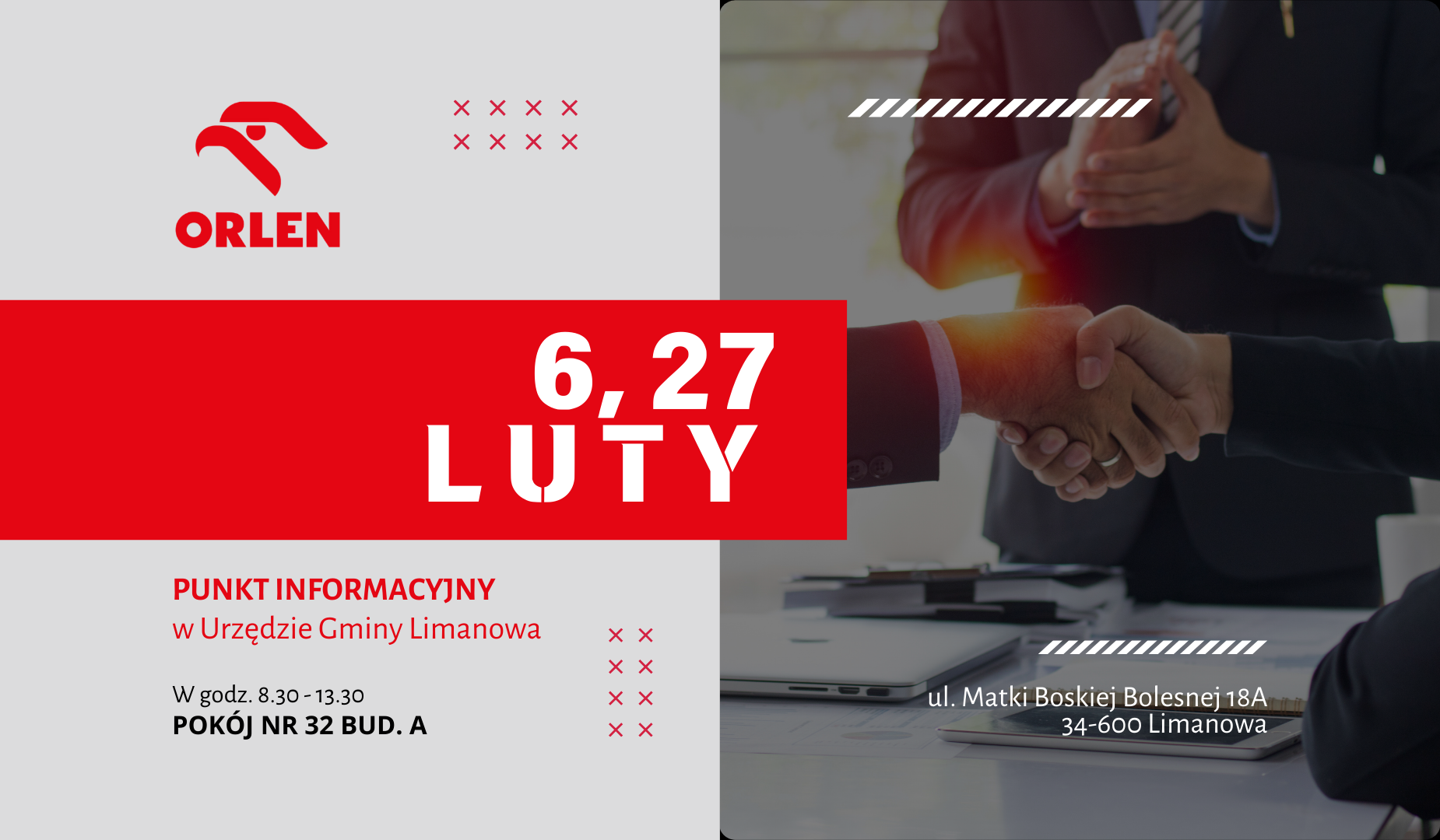 Przedstawicielem myOrlen odbywającym dyżury w Urzędzie Gminy Limanowa jest Robert Gargula tel. 663850282.