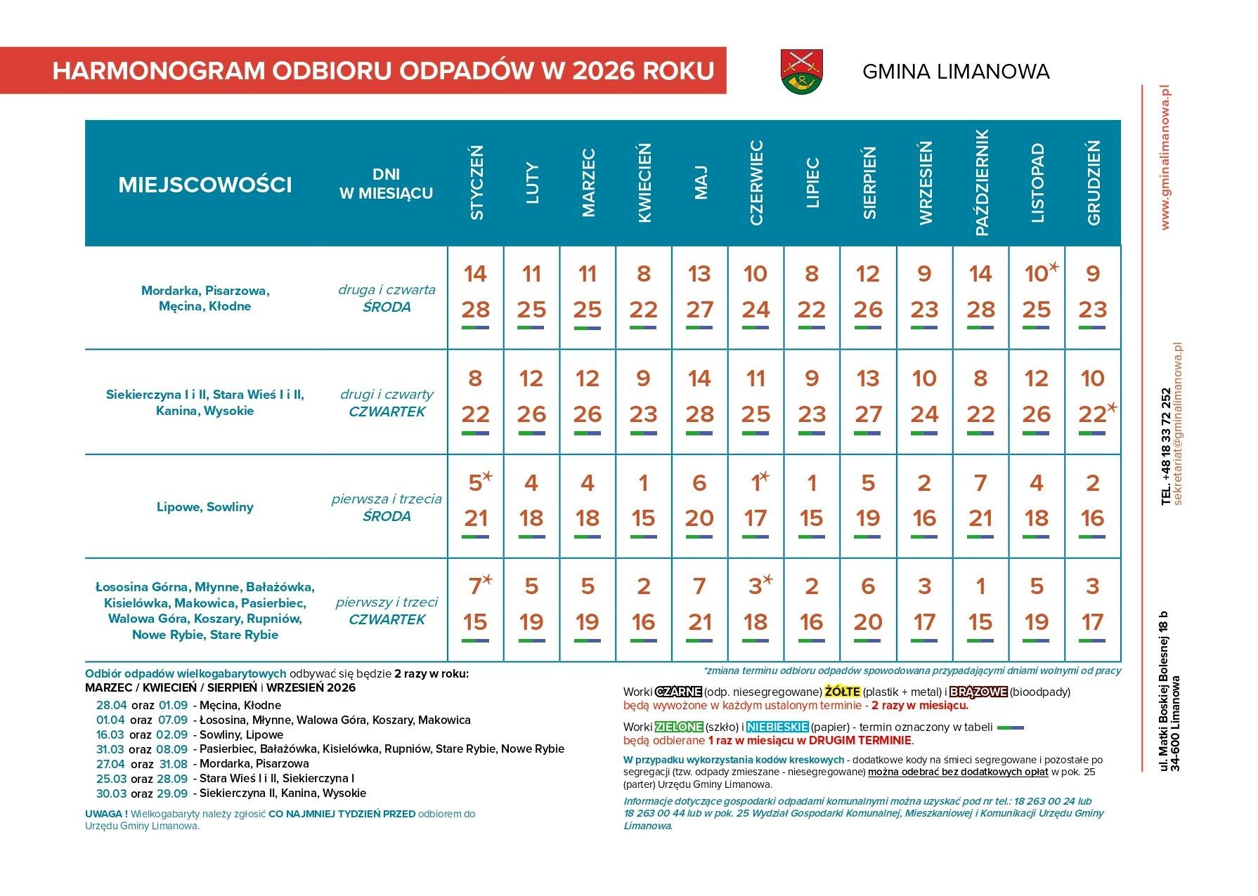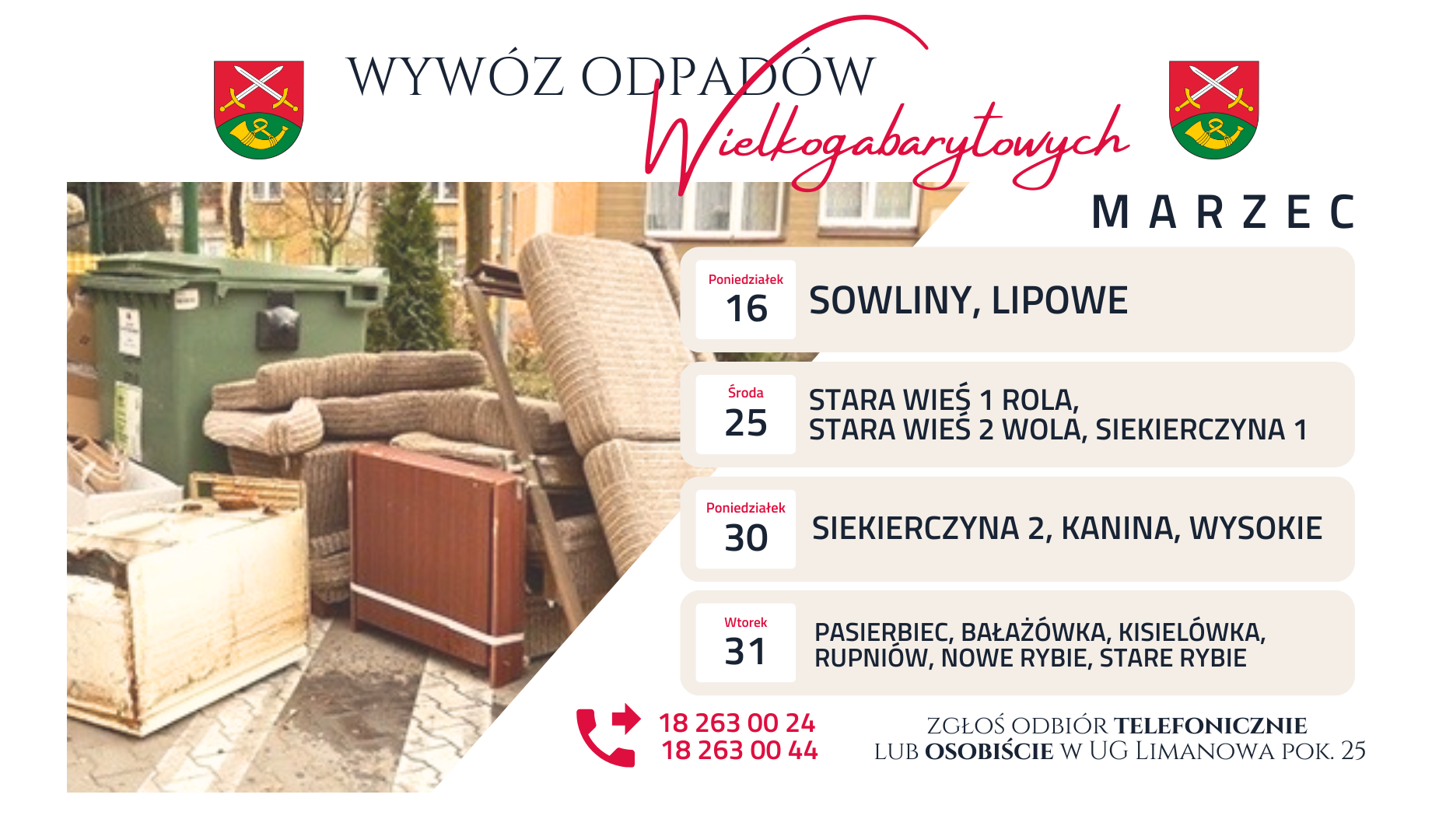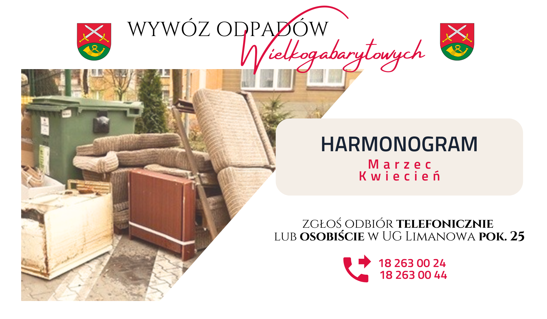 Zamiar wystawienia odpadów do odbioru mieszkańcy gminy zobowiązani są wcześniej zgłosić do Wydziału Gospodarki Komunalnej i Mieszkaniowej Urzędu Gminy Limanowa (pok. nr 25) osobiście lub telefonicznie: 18/263 00 24, 18/263 00 44.
