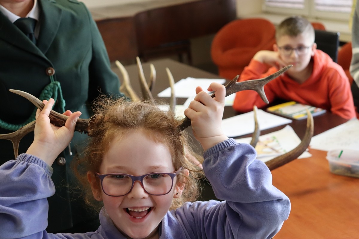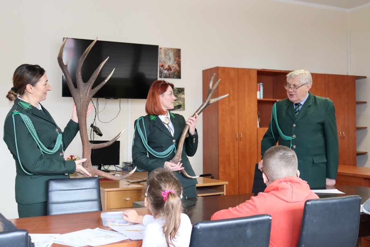 Podczas zajęć dzieci poznały fascynujące ciekawostki dotyczące życia dzikich zwierząt zamieszkujących lasy naszego regionu. Panie w przystępny i bardzo interesujący sposób opowiadały o różnicach między sarną a jeleniem, prezentując prawdziwe poroża, które każdy uczestnik mógł wziąć do ręki, obejrzeć z bliska i poznać ich budowę oraz znaczenie.