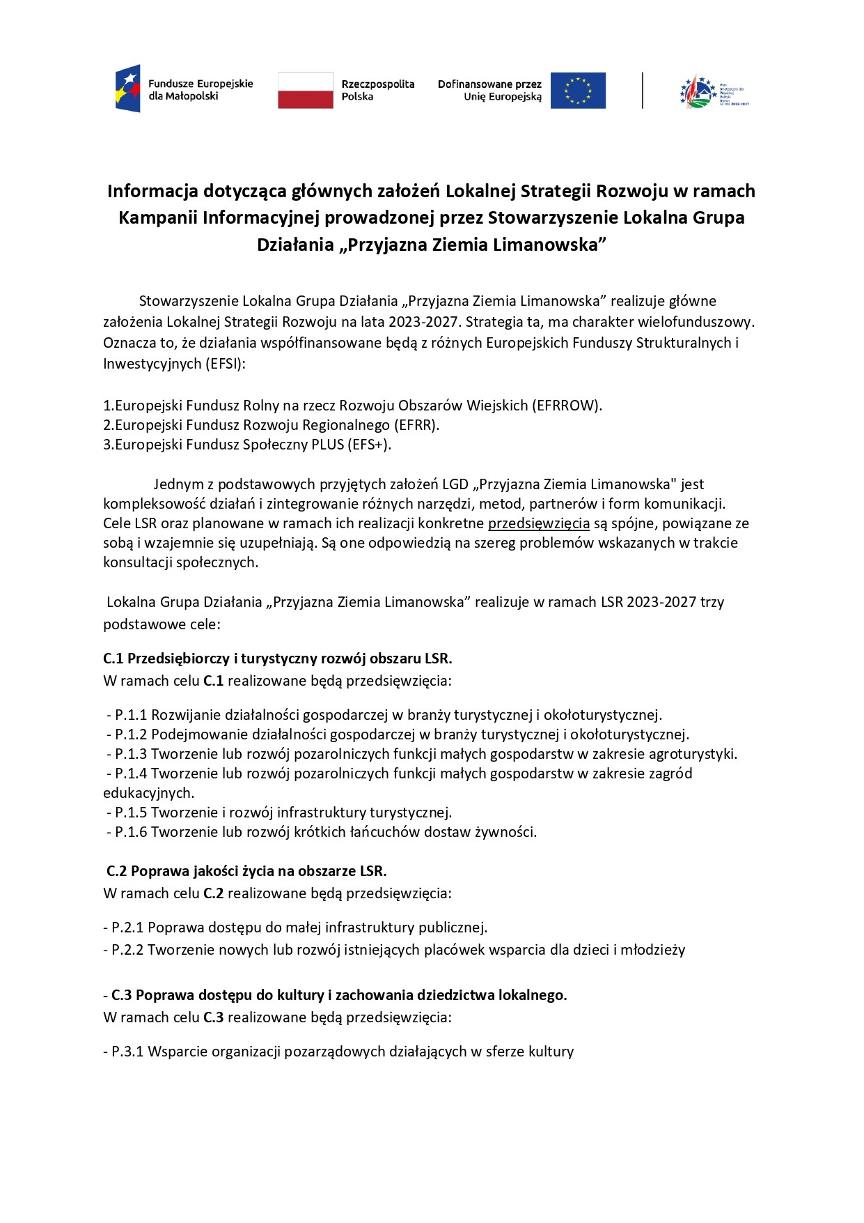 Stowarzyszenie Lokalna Grupa Działania „Przyjazna Ziemia Limanowska” realizuje główne założenia Lokalnej Strategii Rozwoju na lata 2023-2027. Strategia ta, ma charakter wielofunduszowy. Oznacza to, że działania współfinansowane będą z różnych Europejskich Funduszy Strukturalnych i Inwestycyjnych (EFSI):