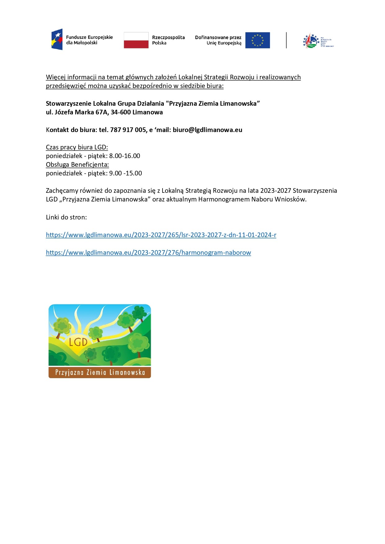 Zachęcamy również do zapoznania się z Lokalną Strategią Rozwoju na lata 2023-2027 Stowarzyszenia LGD „Przyjazna Ziemia Limanowska” oraz aktualnym Harmonogramem Naboru Wniosków.