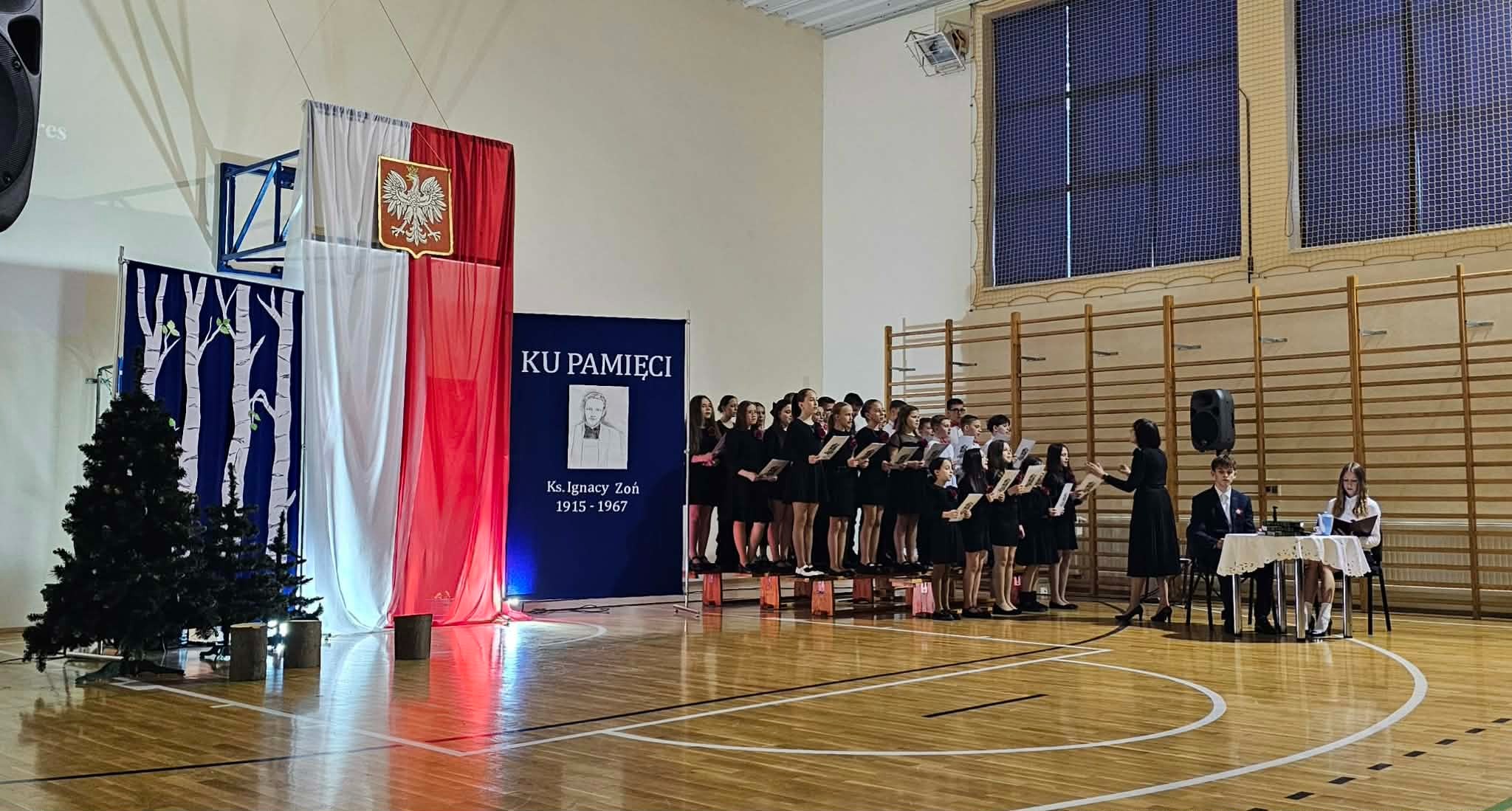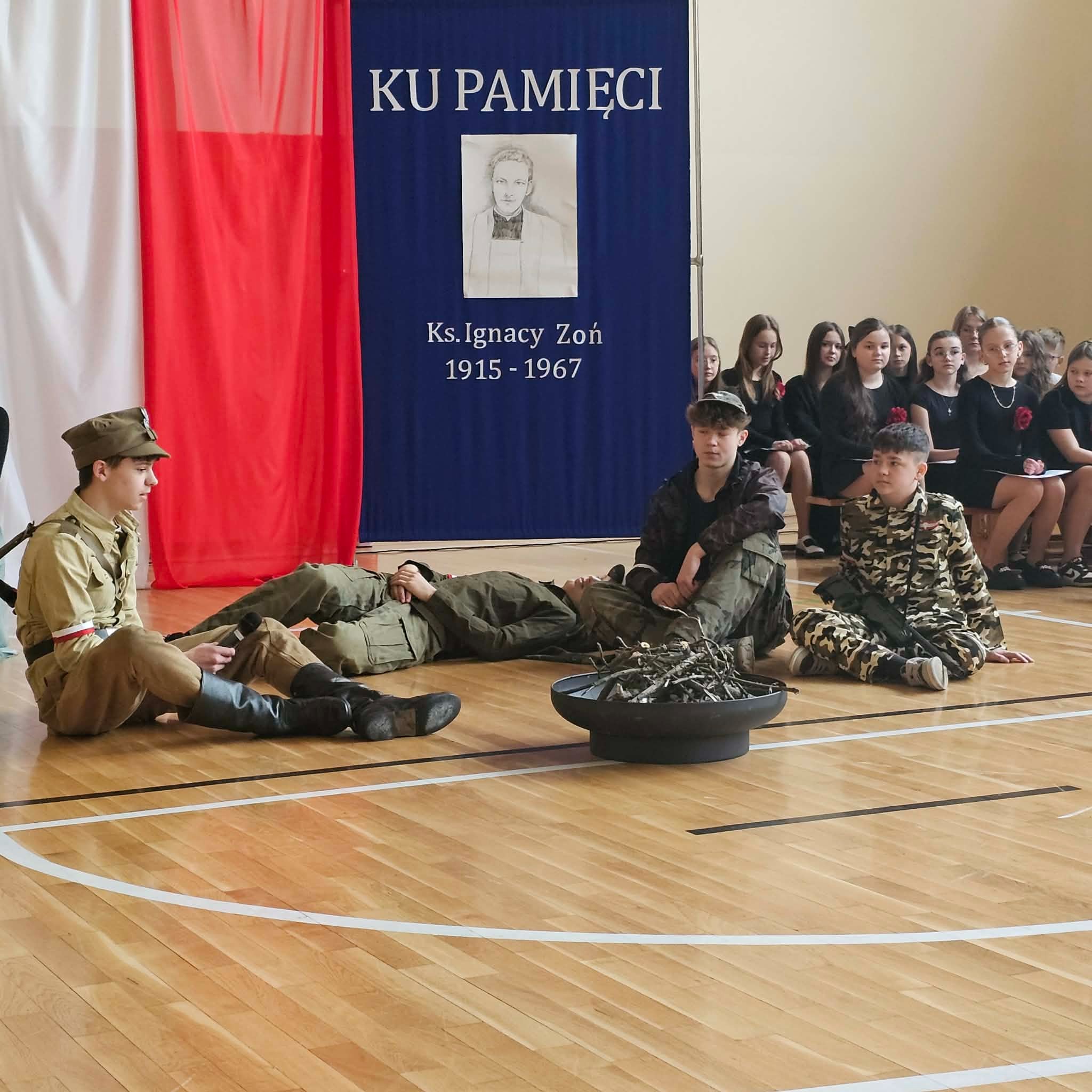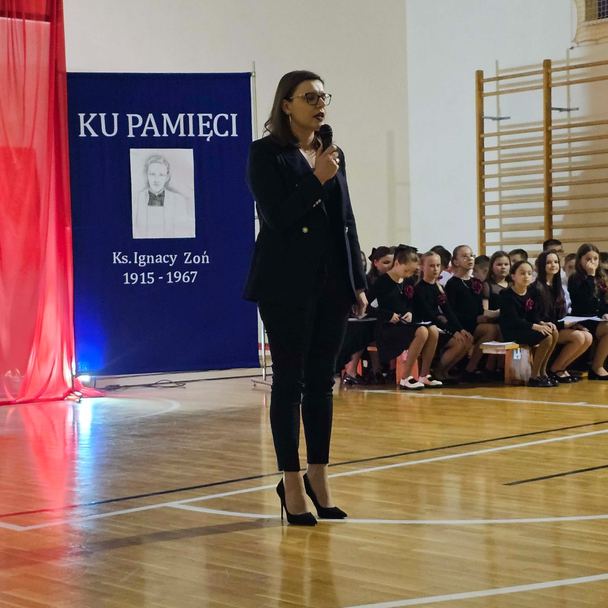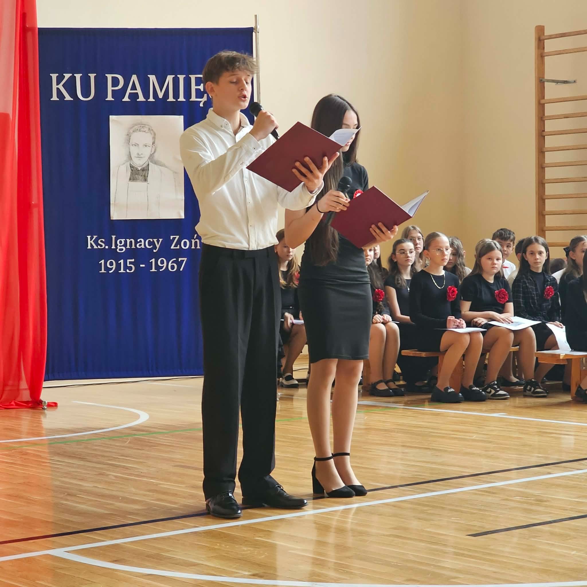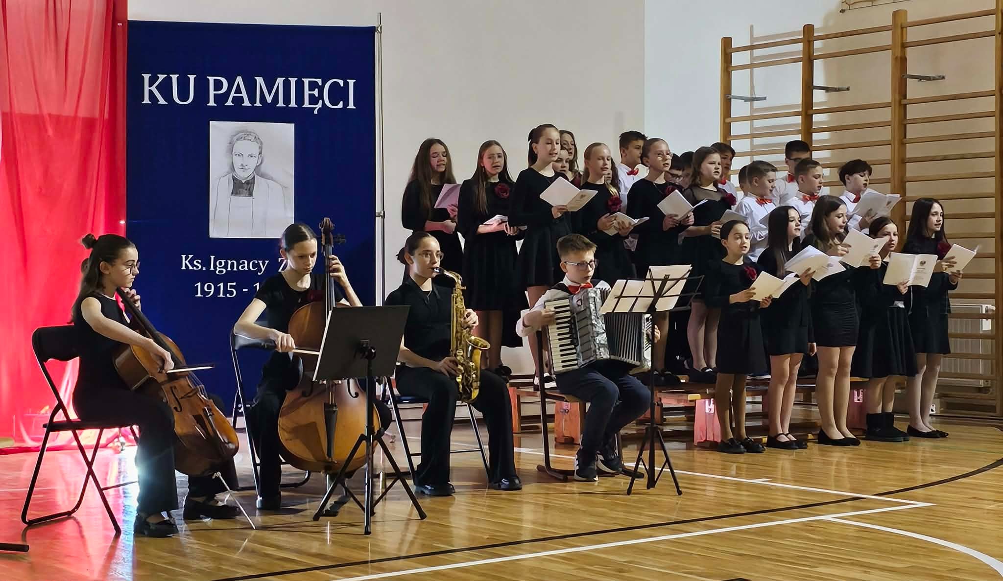 Uroczystość rozpoczęła się od powitania przez dyrektor Natalię Kordeczkę wszystkich zaproszonych gości, a w szczególności najbliższej rodziny ks. Ignacego Zonia. Po wspólnym odśpiewaniu hymnu państwowego uczniowie klasy ósmej i siódmej przedstawili program artystyczny, który składał się ze scenek historycznych związanych z życiem ks. Ignacego. Chór szkolny pod kierunkiem Joanny Dutki wzbogacił przedstawienie pieśniami nawiązującymi do walki o wolność i niepodległość Polski jaką prowadzili Żołnierze Wyklęci. Scenografia, odpowiednio dobrane pieśni patriotyczne oraz stroje historyczne przygotowane przez uczniów i ich rodziców pozwoliły widzom jeszcze bardziej wczuć się w atmosferę czasu głębokich przemian politycznych związanych z narzuceniem Polakom systemu komunistycznego.