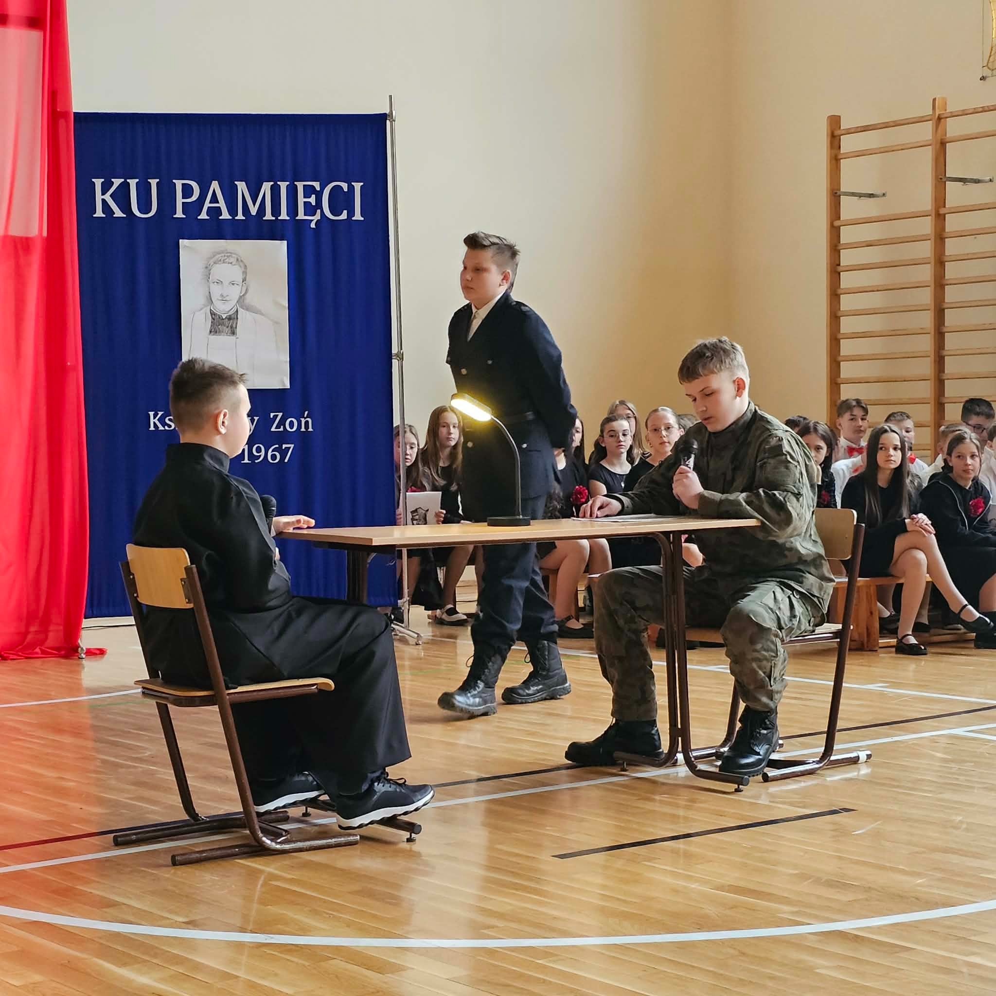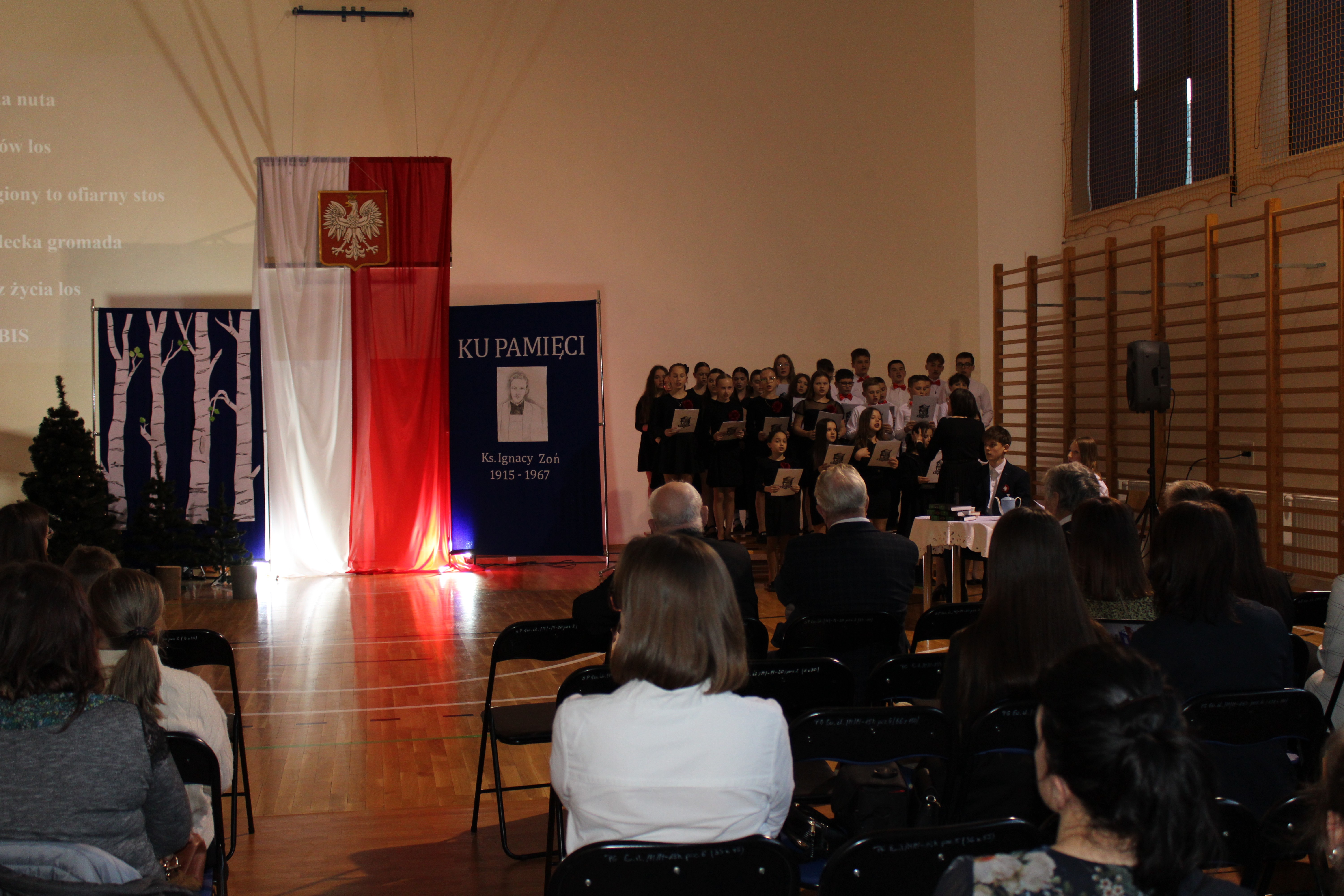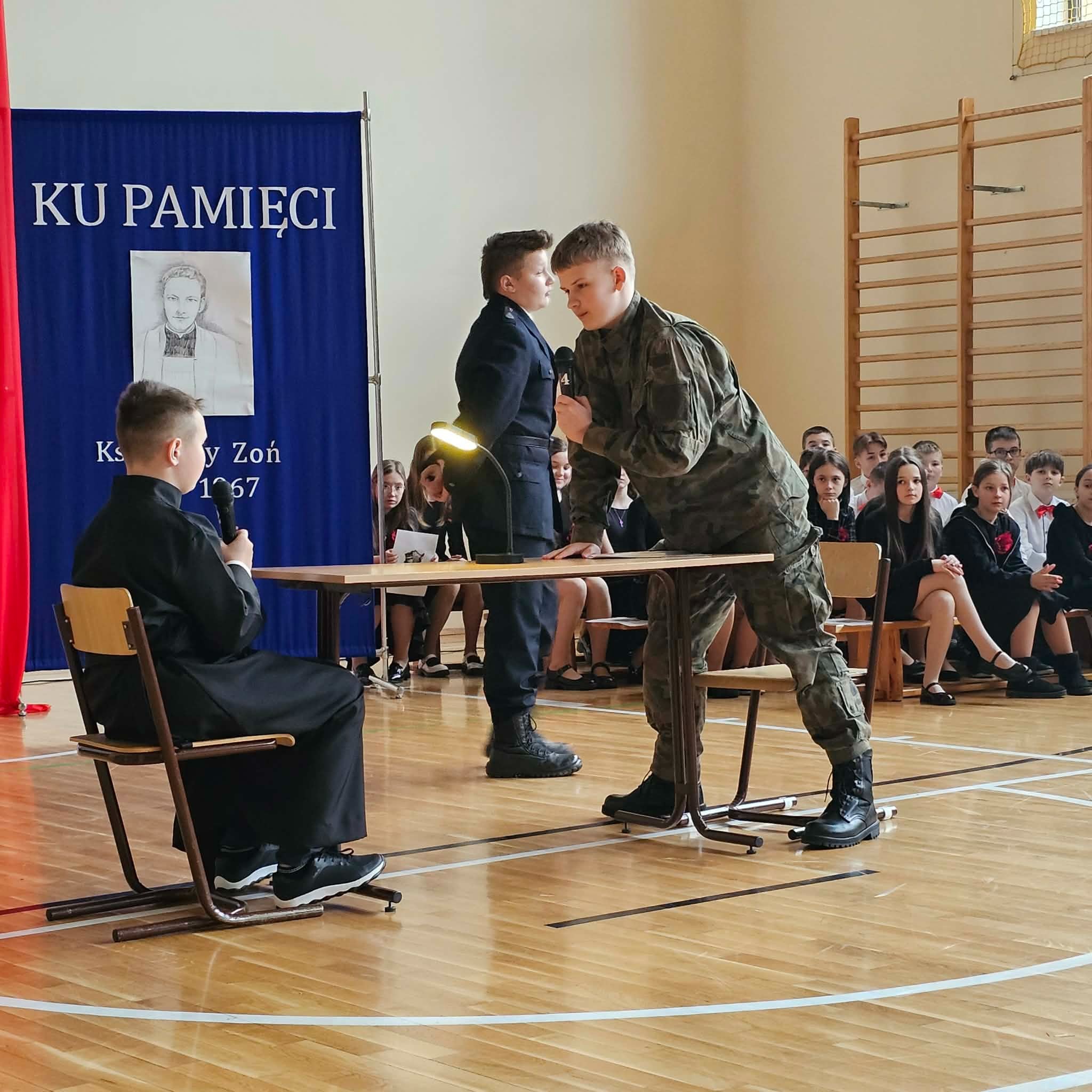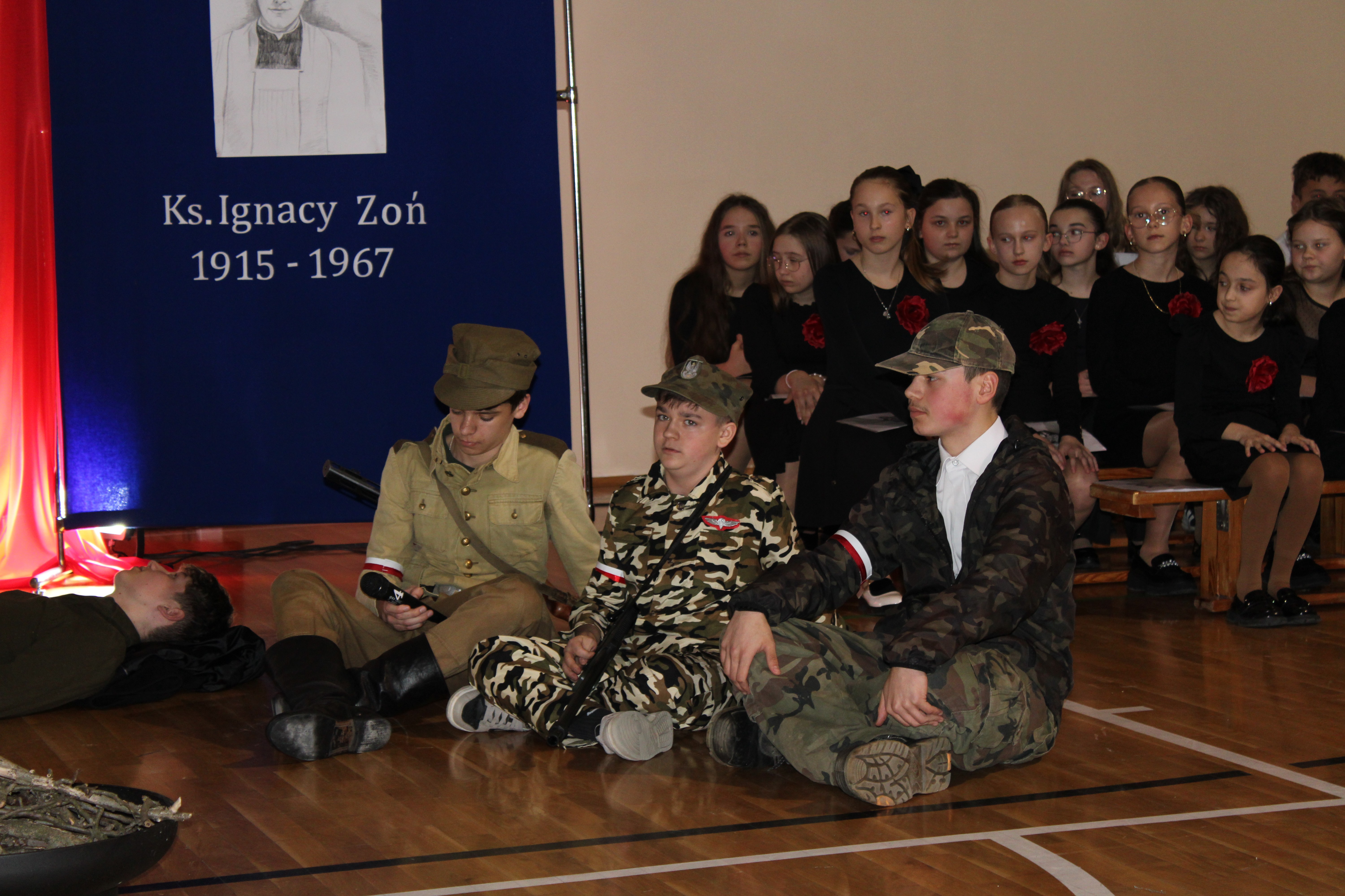 Uroczystość rozpoczęła się od powitania przez dyrektor Natalię Kordeczkę wszystkich zaproszonych gości, a w szczególności najbliższej rodziny ks. Ignacego Zonia. Po wspólnym odśpiewaniu hymnu państwowego uczniowie klasy ósmej i siódmej przedstawili program artystyczny, który składał się ze scenek historycznych związanych z życiem ks. Ignacego. Chór szkolny pod kierunkiem Joanny Dutki wzbogacił przedstawienie pieśniami nawiązującymi do walki o wolność i niepodległość Polski jaką prowadzili Żołnierze Wyklęci. Scenografia, odpowiednio dobrane pieśni patriotyczne oraz stroje historyczne przygotowane przez uczniów i ich rodziców pozwoliły widzom jeszcze bardziej wczuć się w atmosferę czasu głębokich przemian politycznych związanych z narzuceniem Polakom systemu komunistycznego.