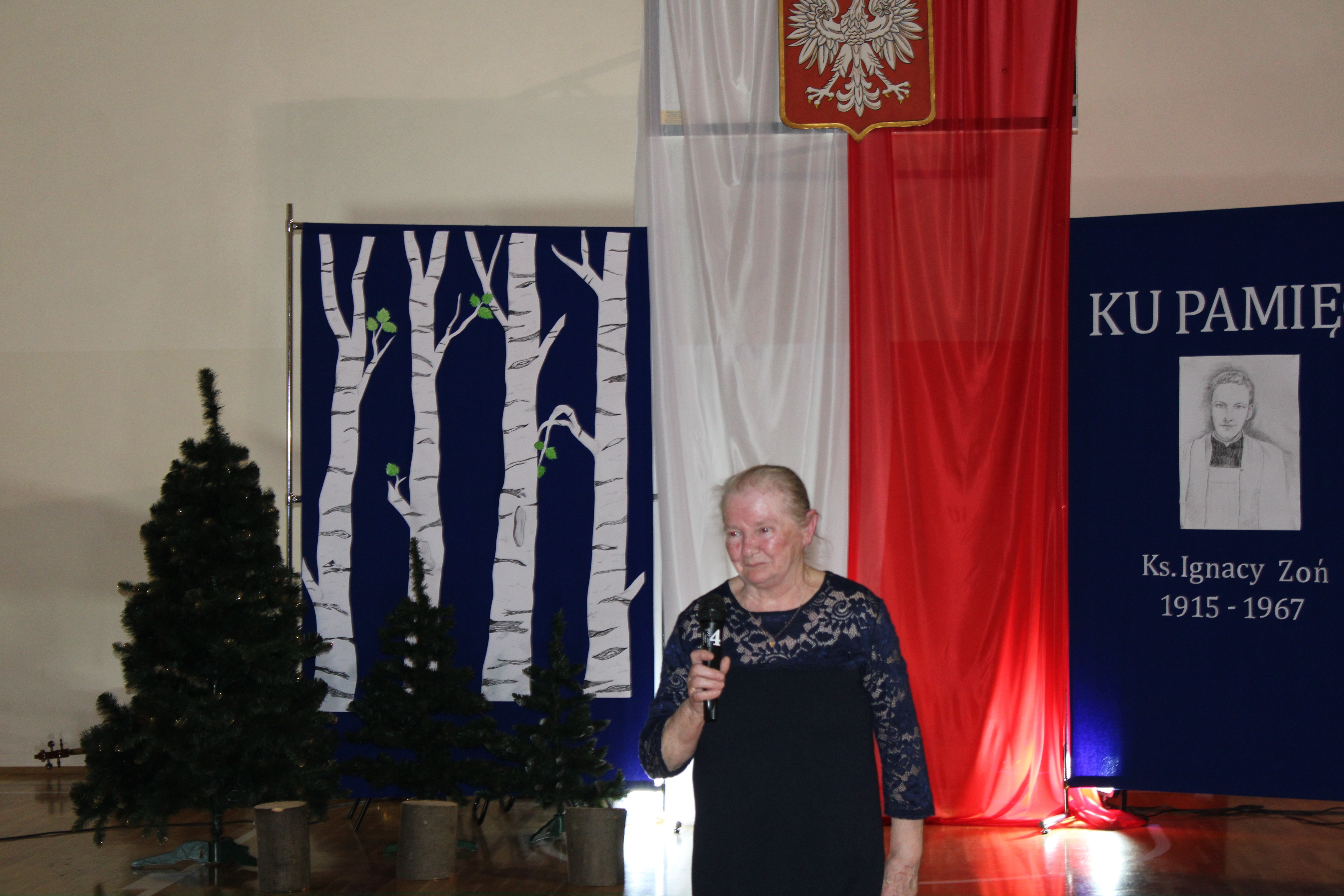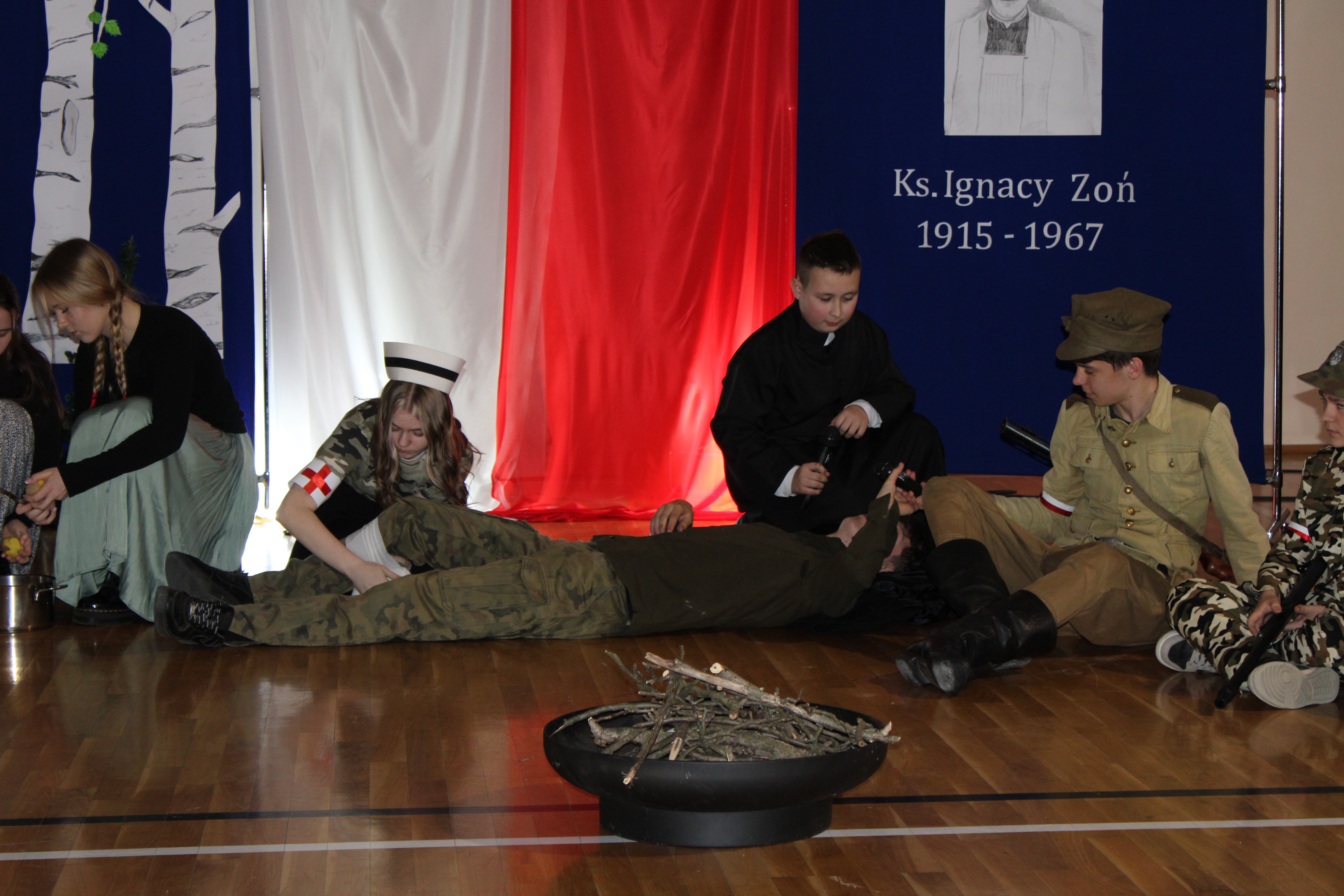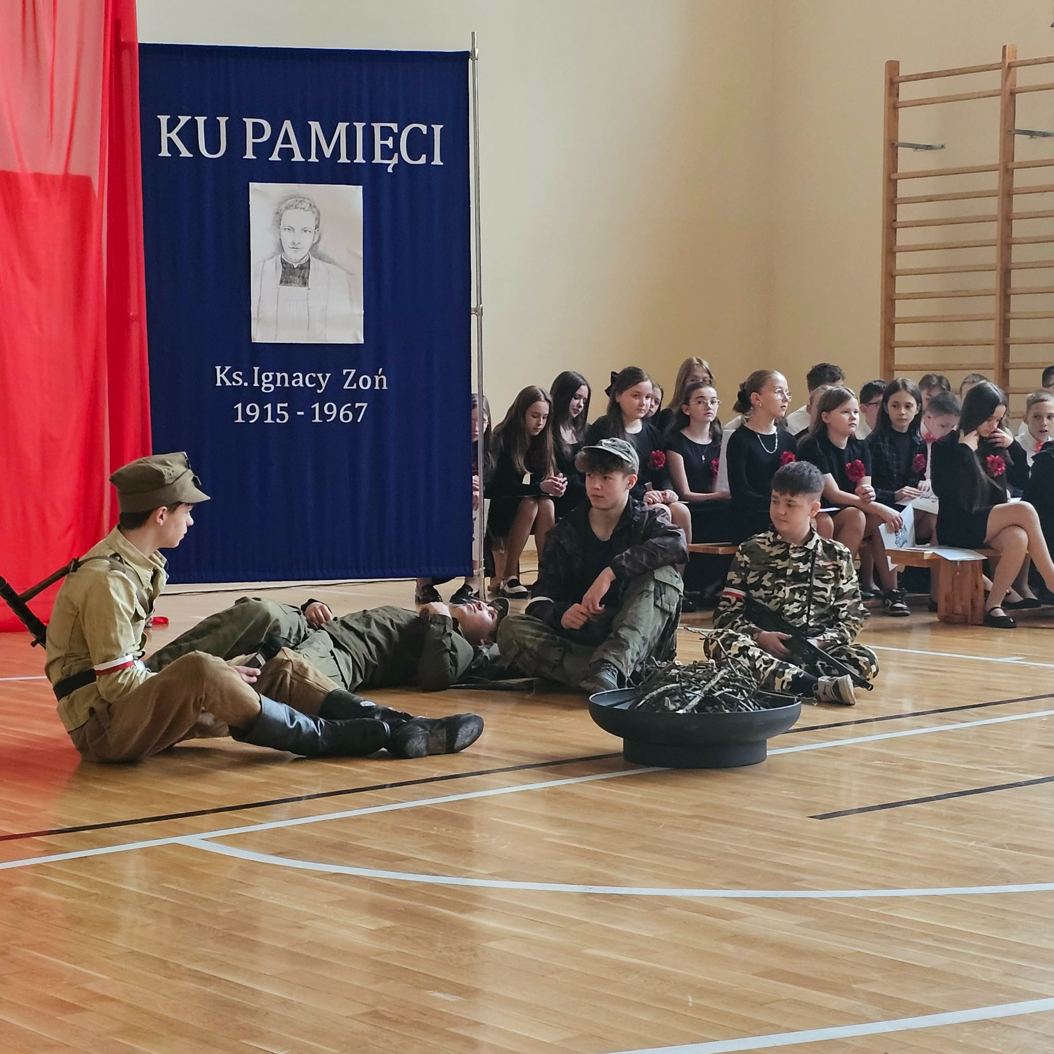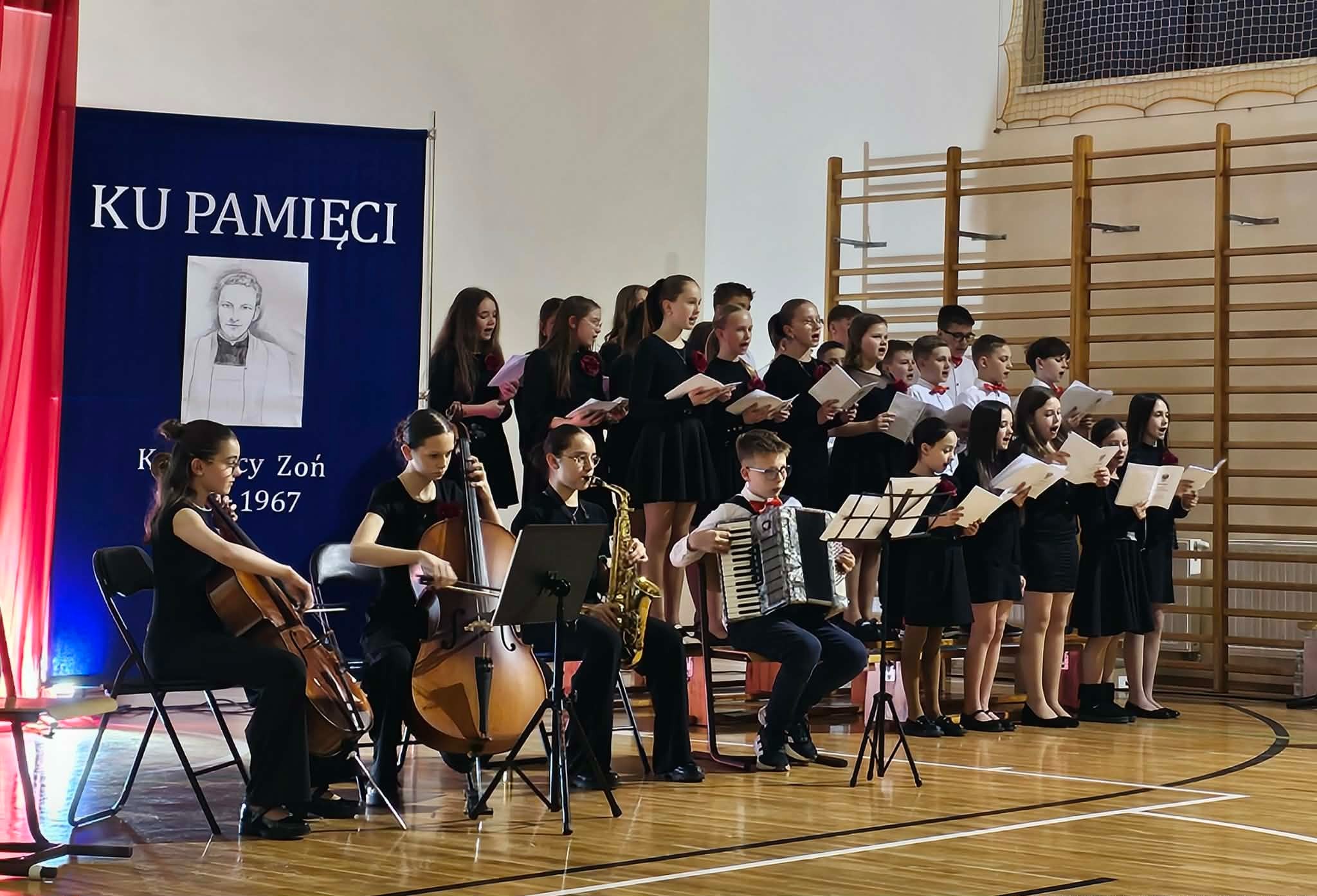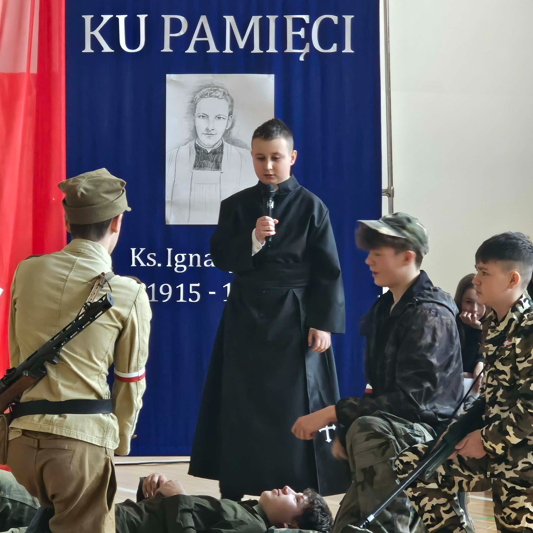 Uroczystość rozpoczęła się od powitania przez dyrektor Natalię Kordeczkę wszystkich zaproszonych gości, a w szczególności najbliższej rodziny ks. Ignacego Zonia. Po wspólnym odśpiewaniu hymnu państwowego uczniowie klasy ósmej i siódmej przedstawili program artystyczny, który składał się ze scenek historycznych związanych z życiem ks. Ignacego. Chór szkolny pod kierunkiem Joanny Dutki wzbogacił przedstawienie pieśniami nawiązującymi do walki o wolność i niepodległość Polski jaką prowadzili Żołnierze Wyklęci. Scenografia, odpowiednio dobrane pieśni patriotyczne oraz stroje historyczne przygotowane przez uczniów i ich rodziców pozwoliły widzom jeszcze bardziej wczuć się w atmosferę czasu głębokich przemian politycznych związanych z narzuceniem Polakom systemu komunistycznego.