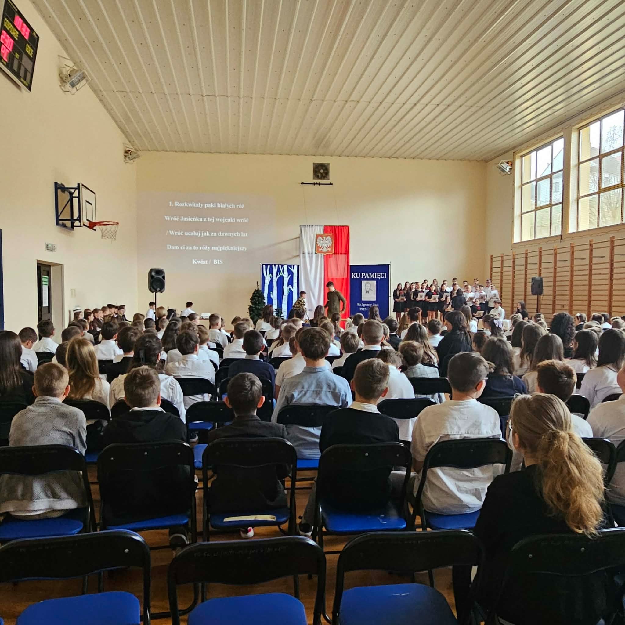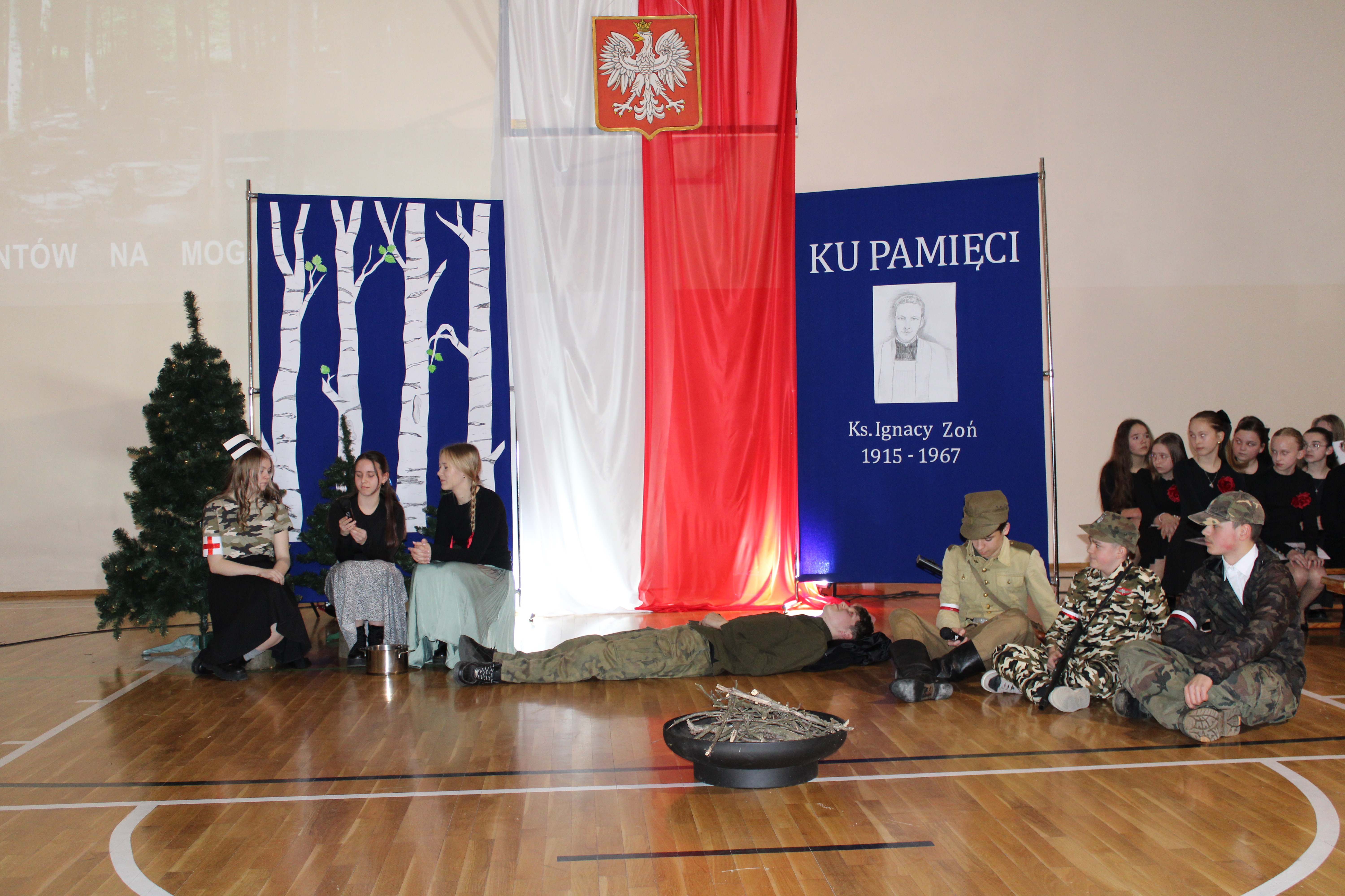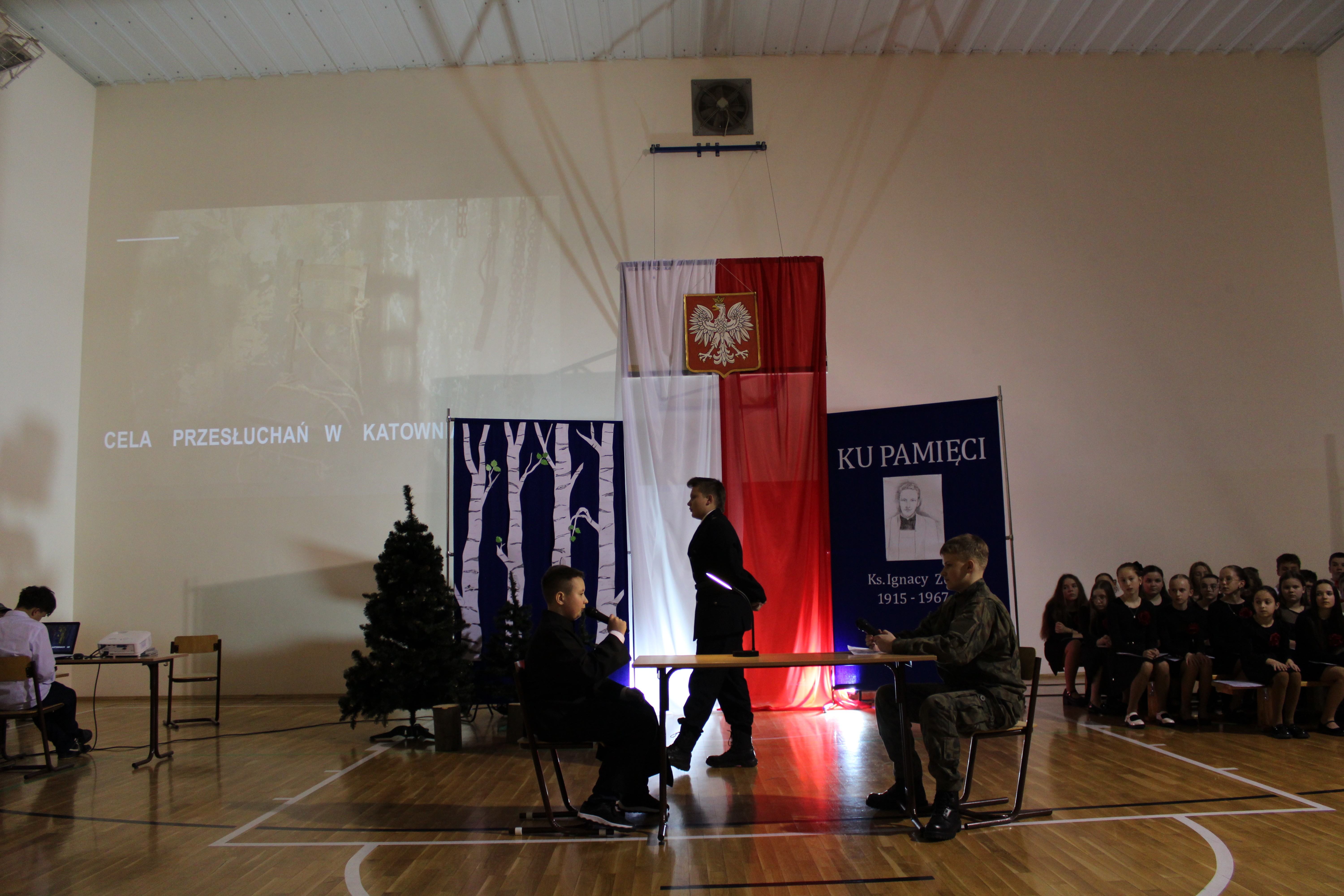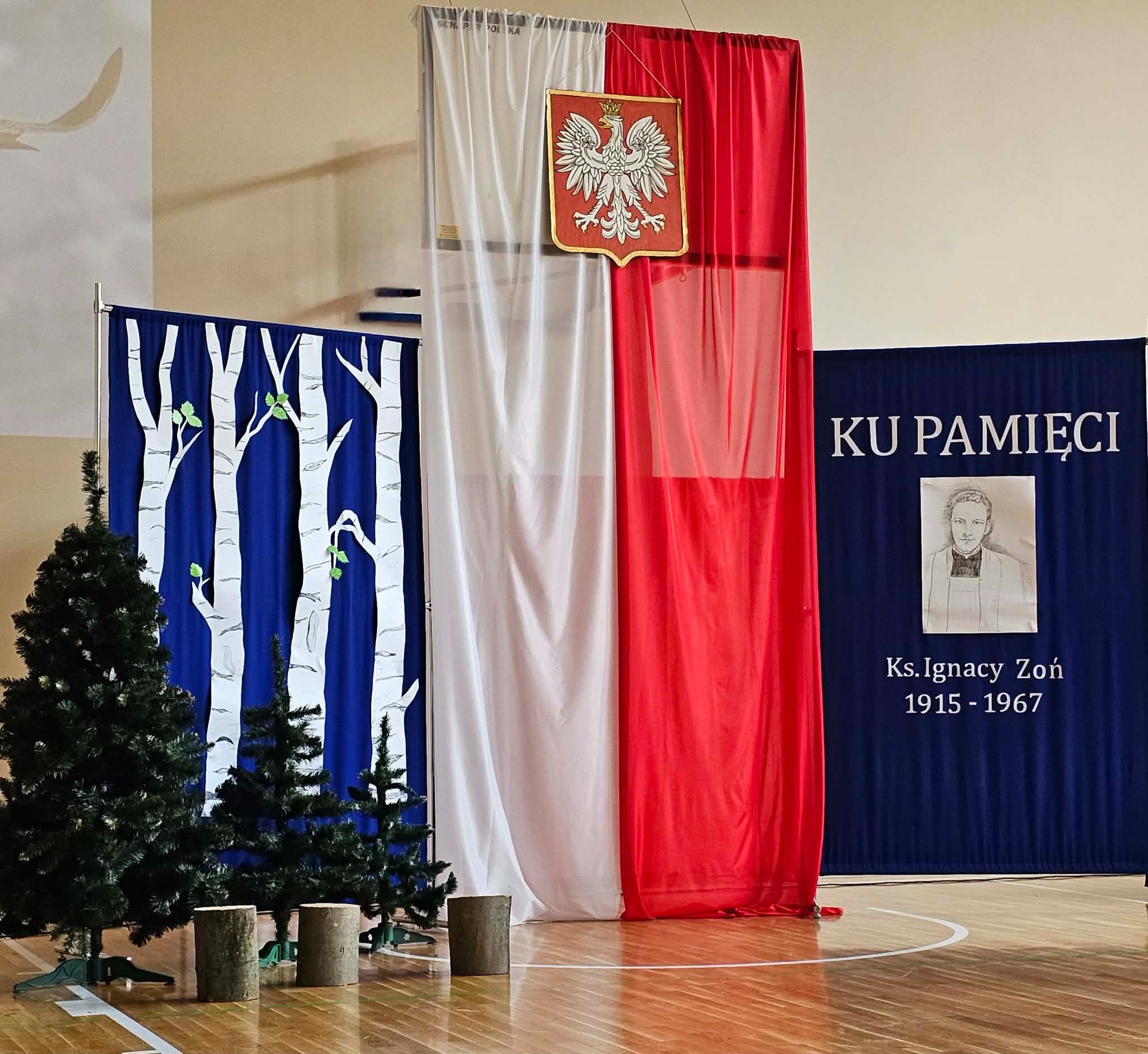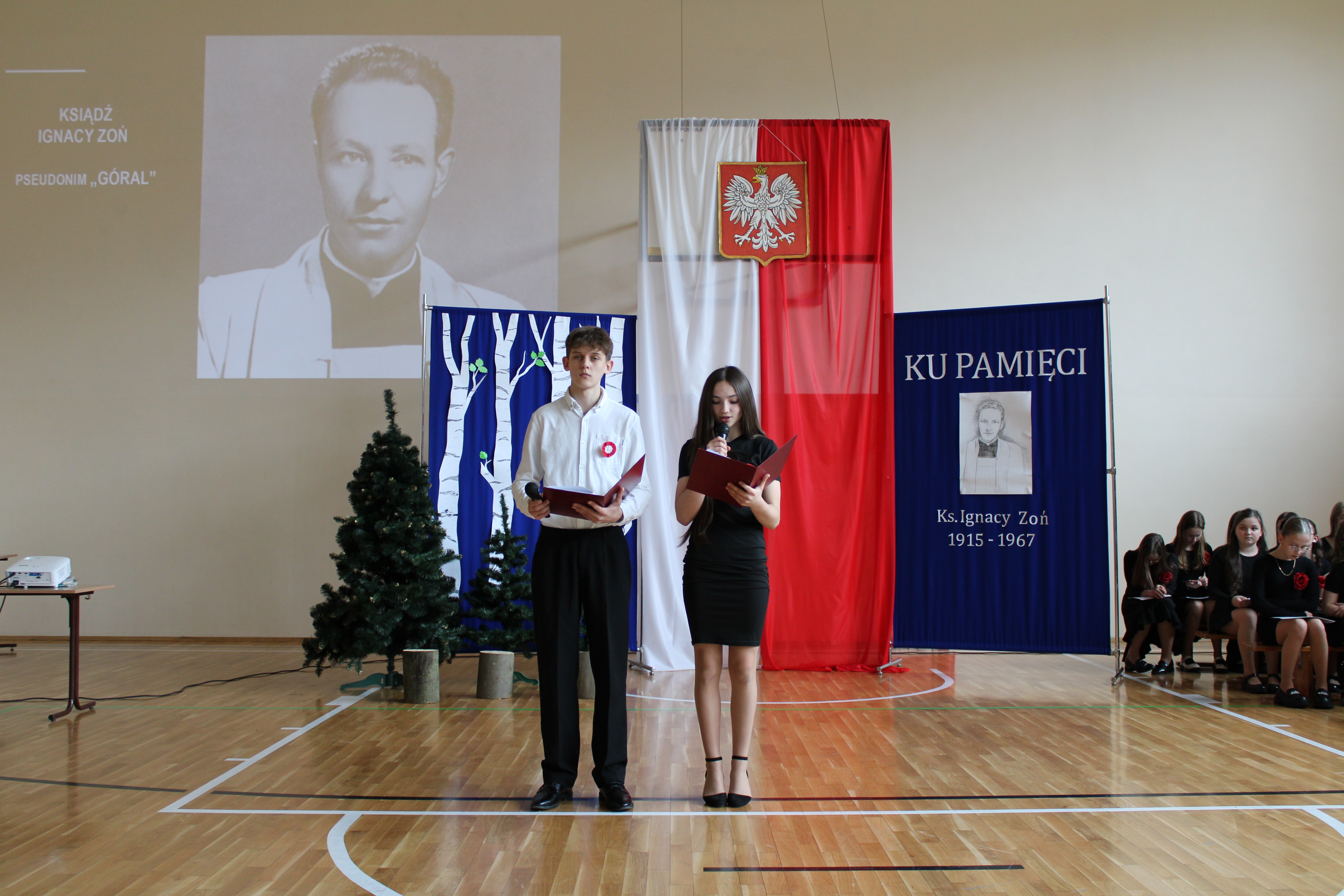 Uroczystość rozpoczęła się od powitania przez dyrektor Natalię Kordeczkę wszystkich zaproszonych gości, a w szczególności najbliższej rodziny ks. Ignacego Zonia. Po wspólnym odśpiewaniu hymnu państwowego uczniowie klasy ósmej i siódmej przedstawili program artystyczny, który składał się ze scenek historycznych związanych z życiem ks. Ignacego. Chór szkolny pod kierunkiem Joanny Dutki wzbogacił przedstawienie pieśniami nawiązującymi do walki o wolność i niepodległość Polski jaką prowadzili Żołnierze Wyklęci. Scenografia, odpowiednio dobrane pieśni patriotyczne oraz stroje historyczne przygotowane przez uczniów i ich rodziców pozwoliły widzom jeszcze bardziej wczuć się w atmosferę czasu głębokich przemian politycznych związanych z narzuceniem Polakom systemu komunistycznego.