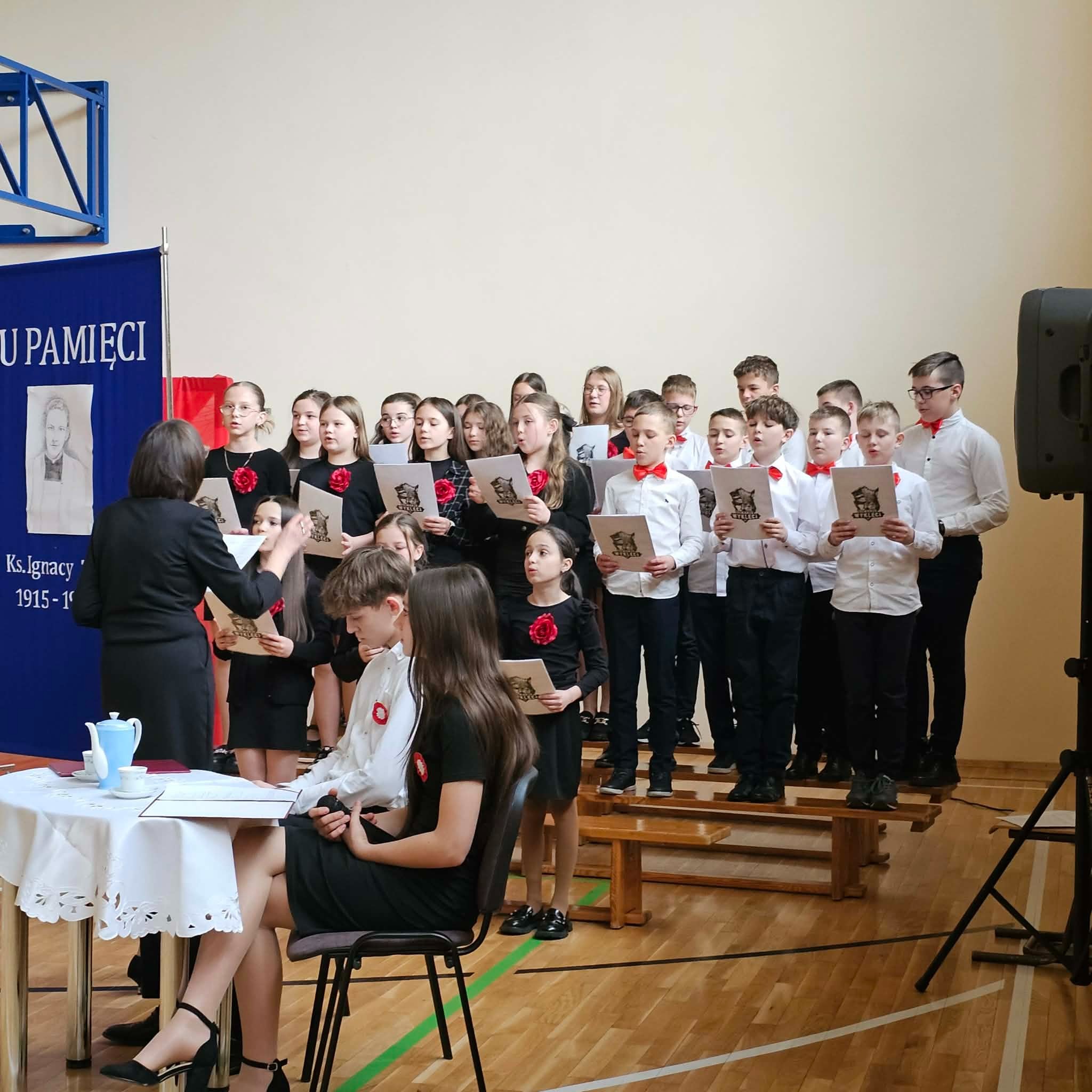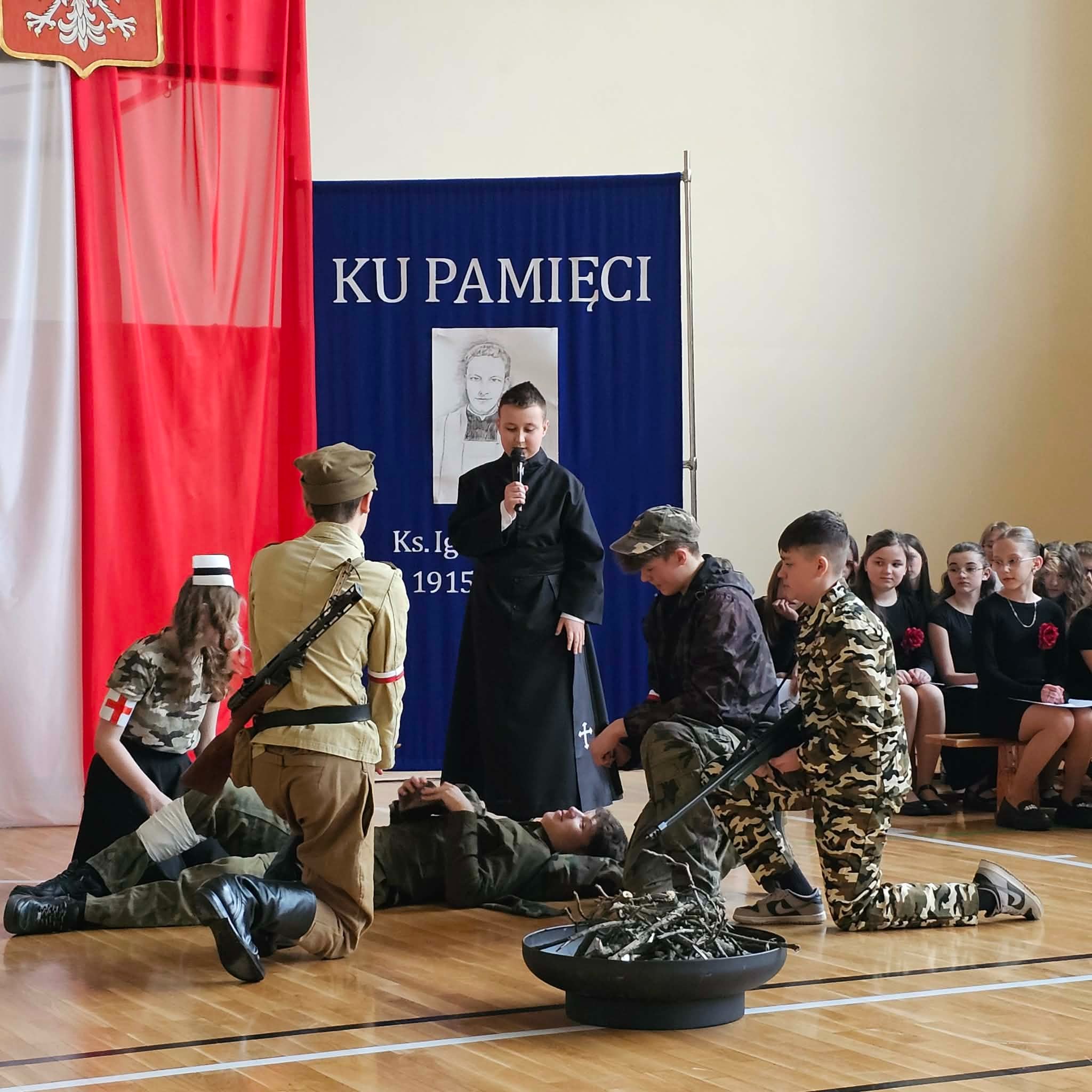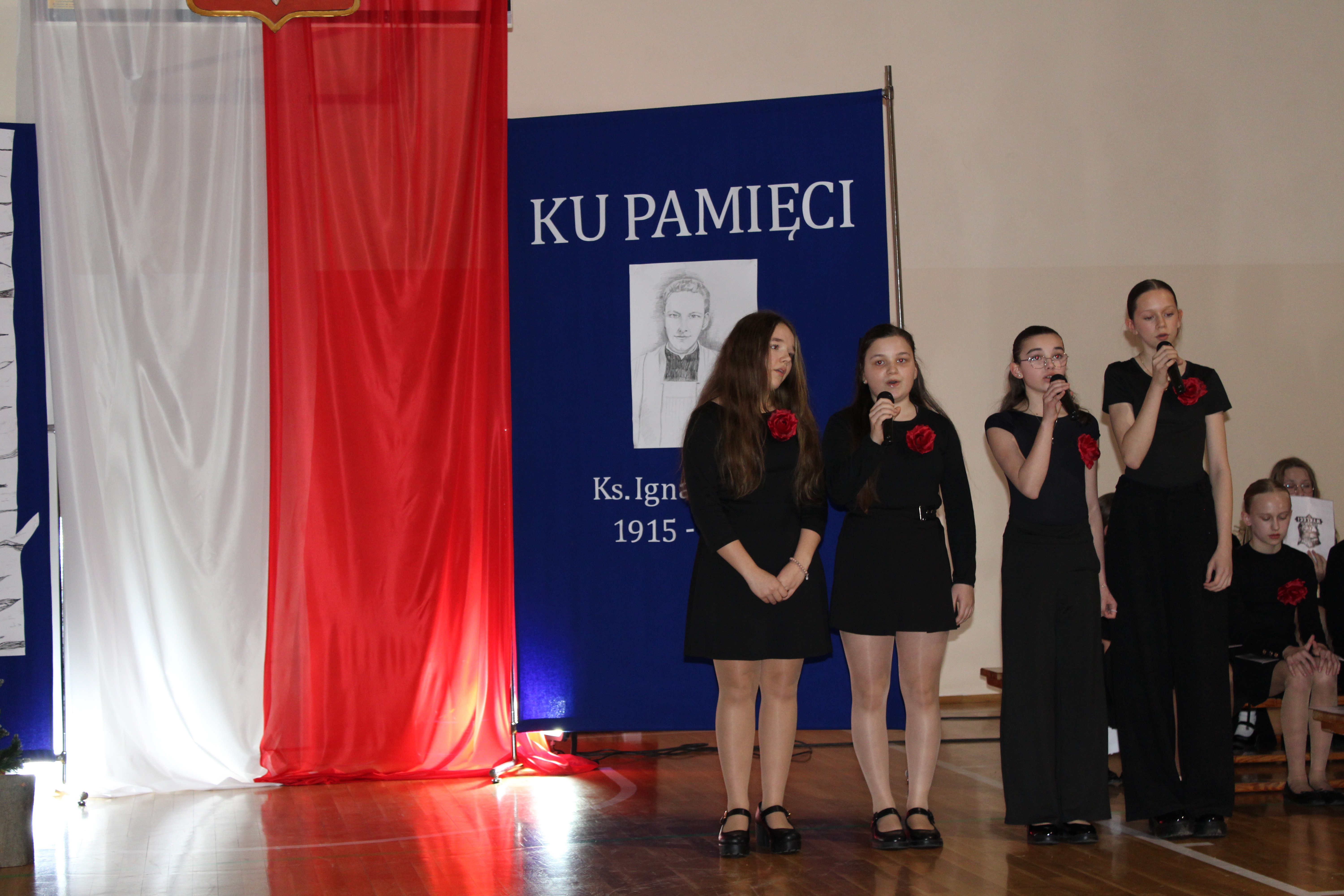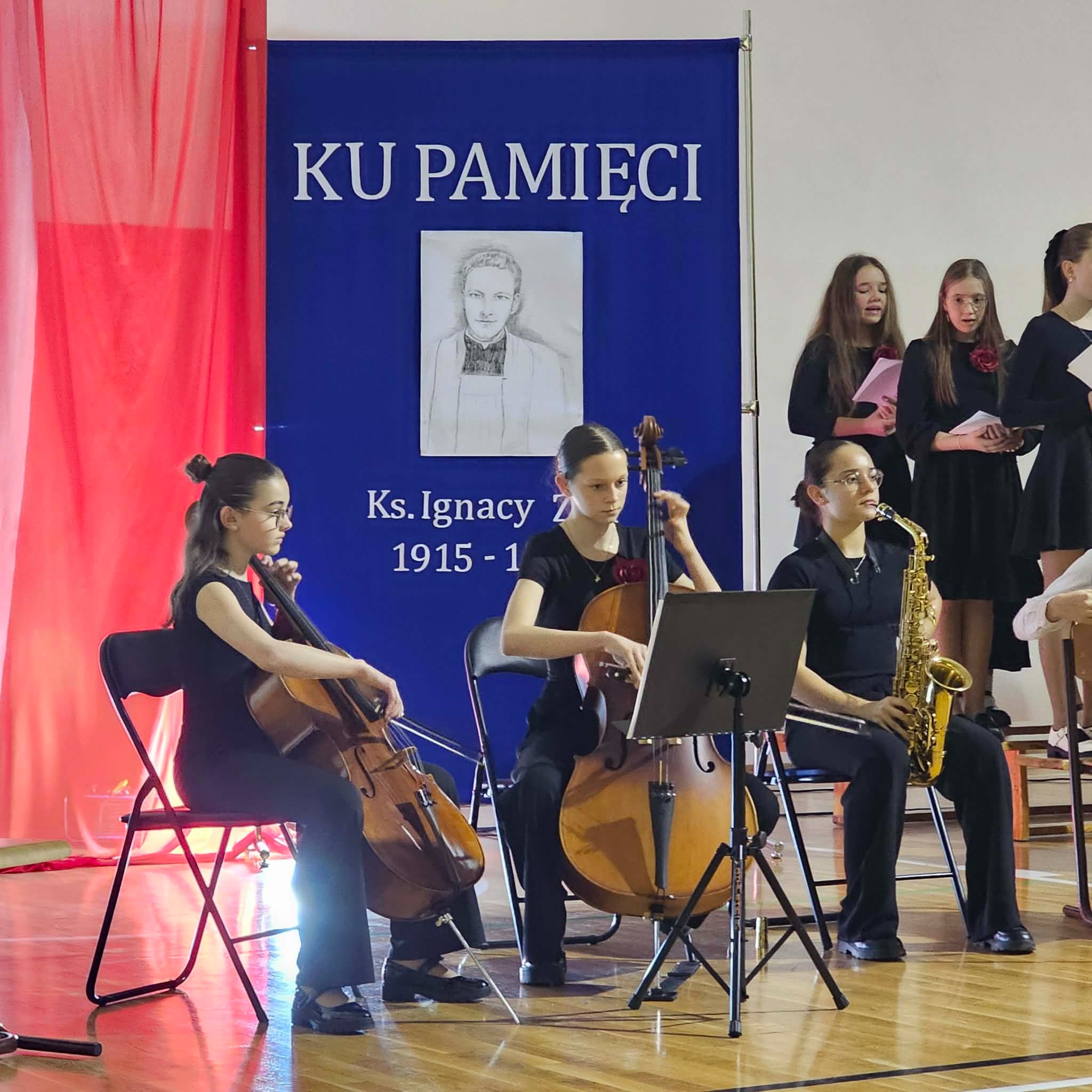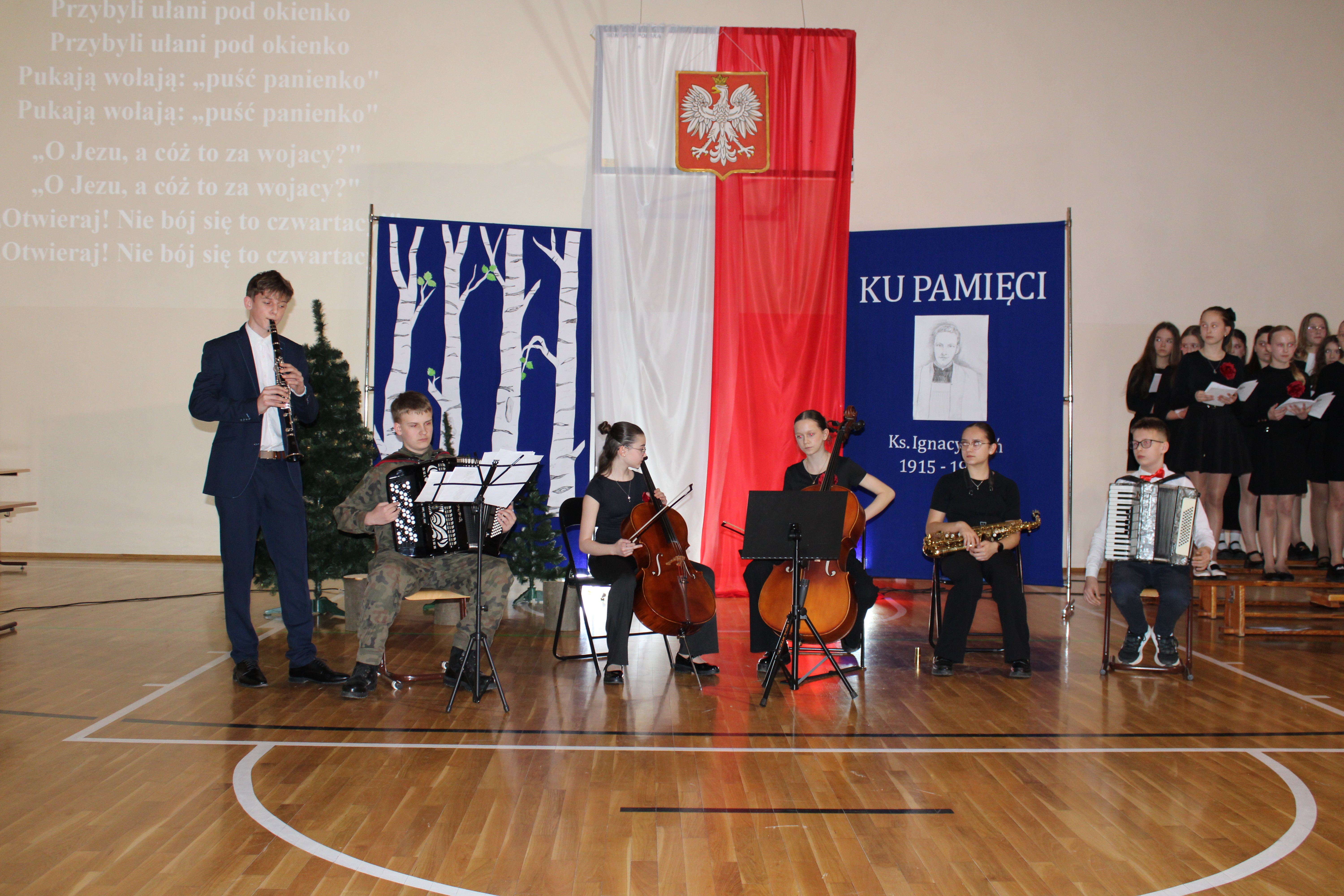 Uroczystość rozpoczęła się od powitania przez dyrektor Natalię Kordeczkę wszystkich zaproszonych gości, a w szczególności najbliższej rodziny ks. Ignacego Zonia. Po wspólnym odśpiewaniu hymnu państwowego uczniowie klasy ósmej i siódmej przedstawili program artystyczny, który składał się ze scenek historycznych związanych z życiem ks. Ignacego. Chór szkolny pod kierunkiem Joanny Dutki wzbogacił przedstawienie pieśniami nawiązującymi do walki o wolność i niepodległość Polski jaką prowadzili Żołnierze Wyklęci. Scenografia, odpowiednio dobrane pieśni patriotyczne oraz stroje historyczne przygotowane przez uczniów i ich rodziców pozwoliły widzom jeszcze bardziej wczuć się w atmosferę czasu głębokich przemian politycznych związanych z narzuceniem Polakom systemu komunistycznego.