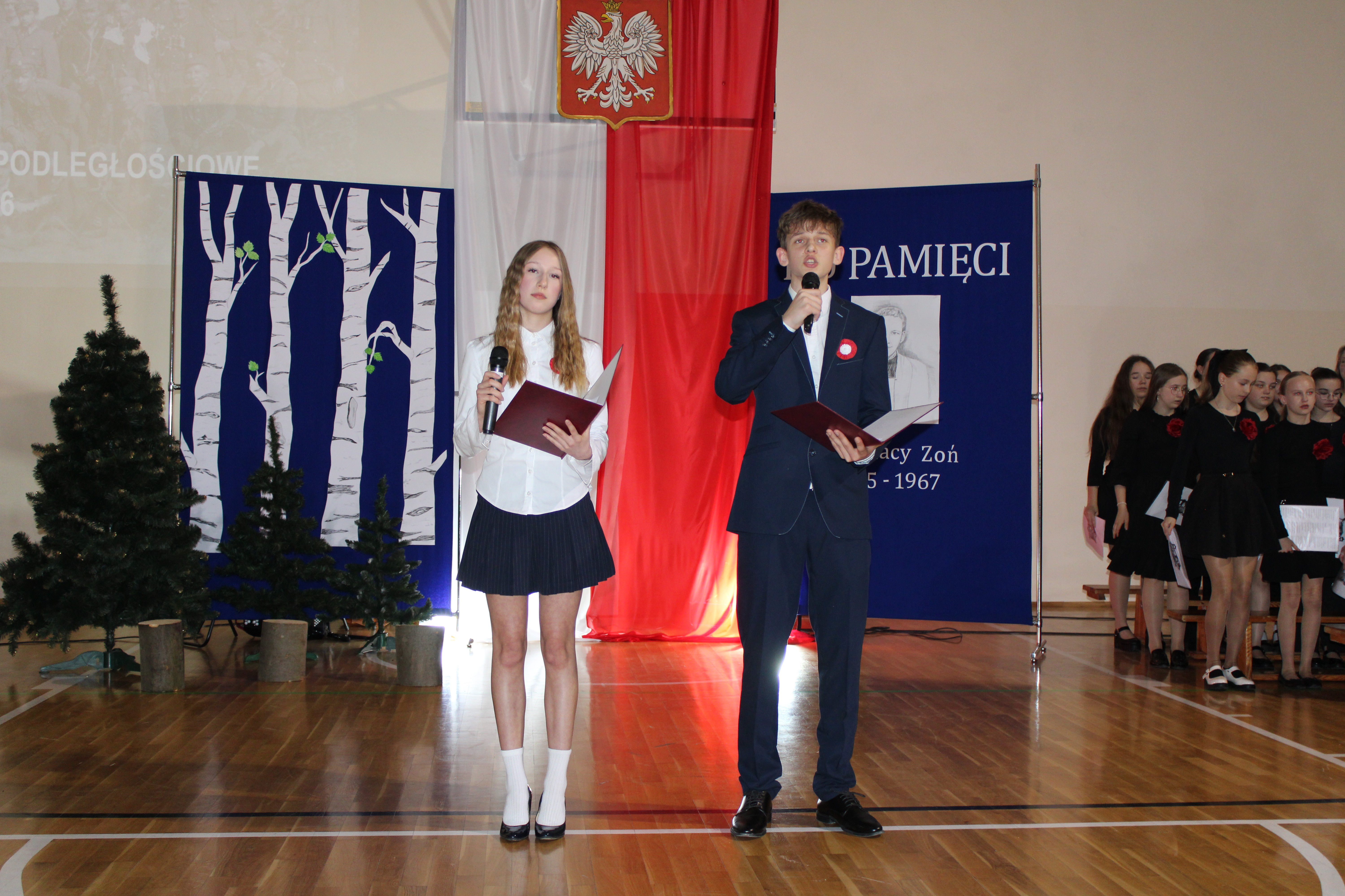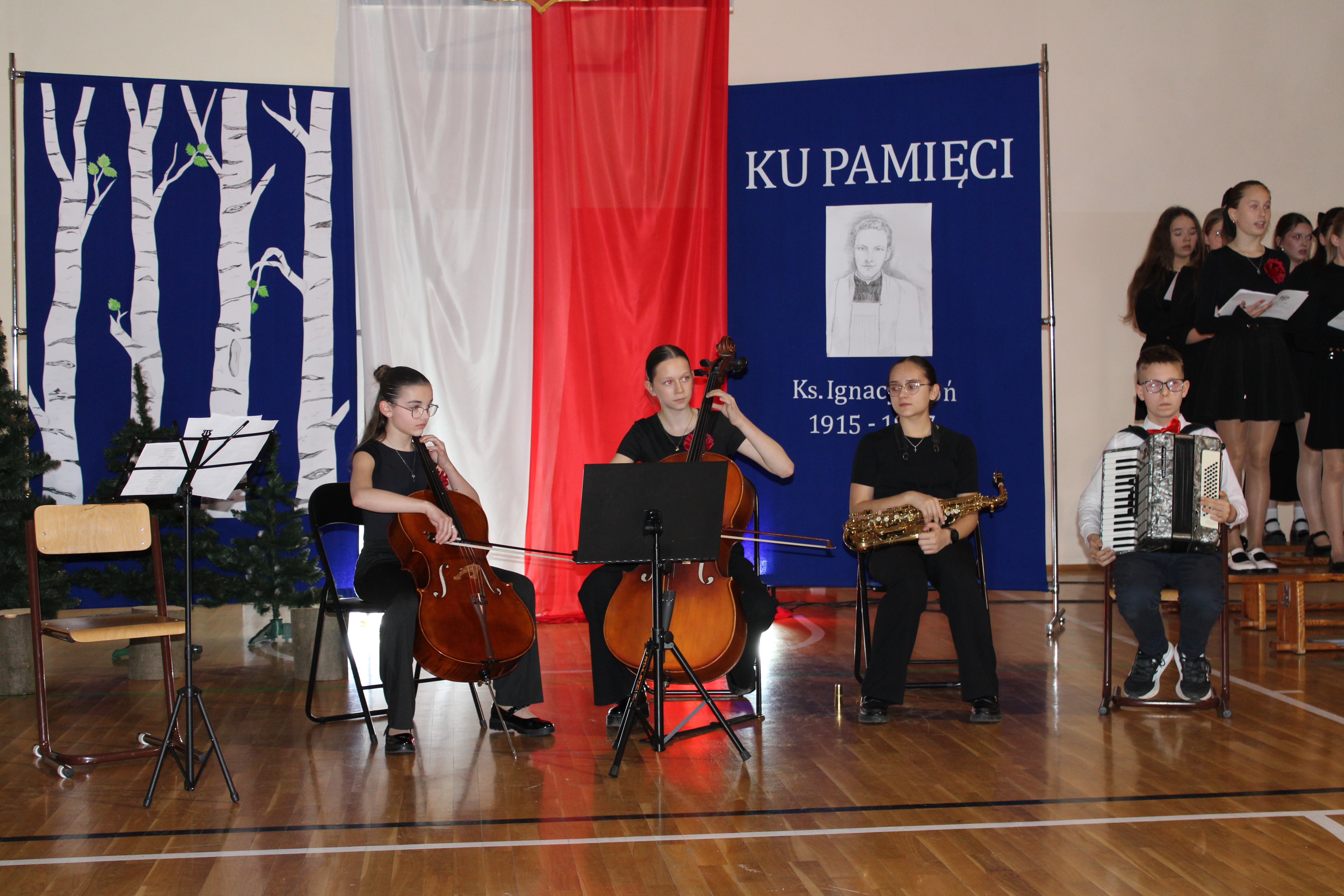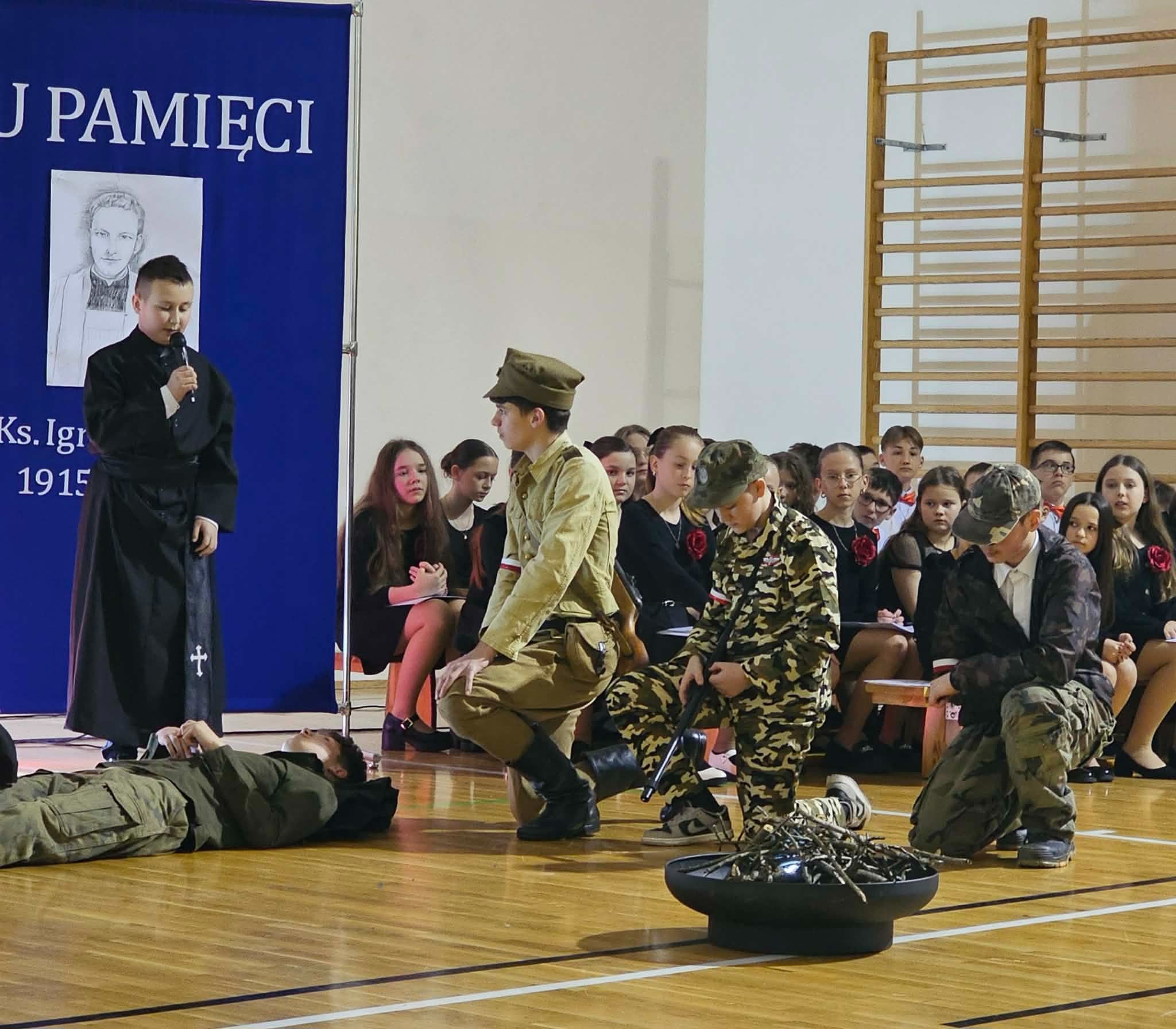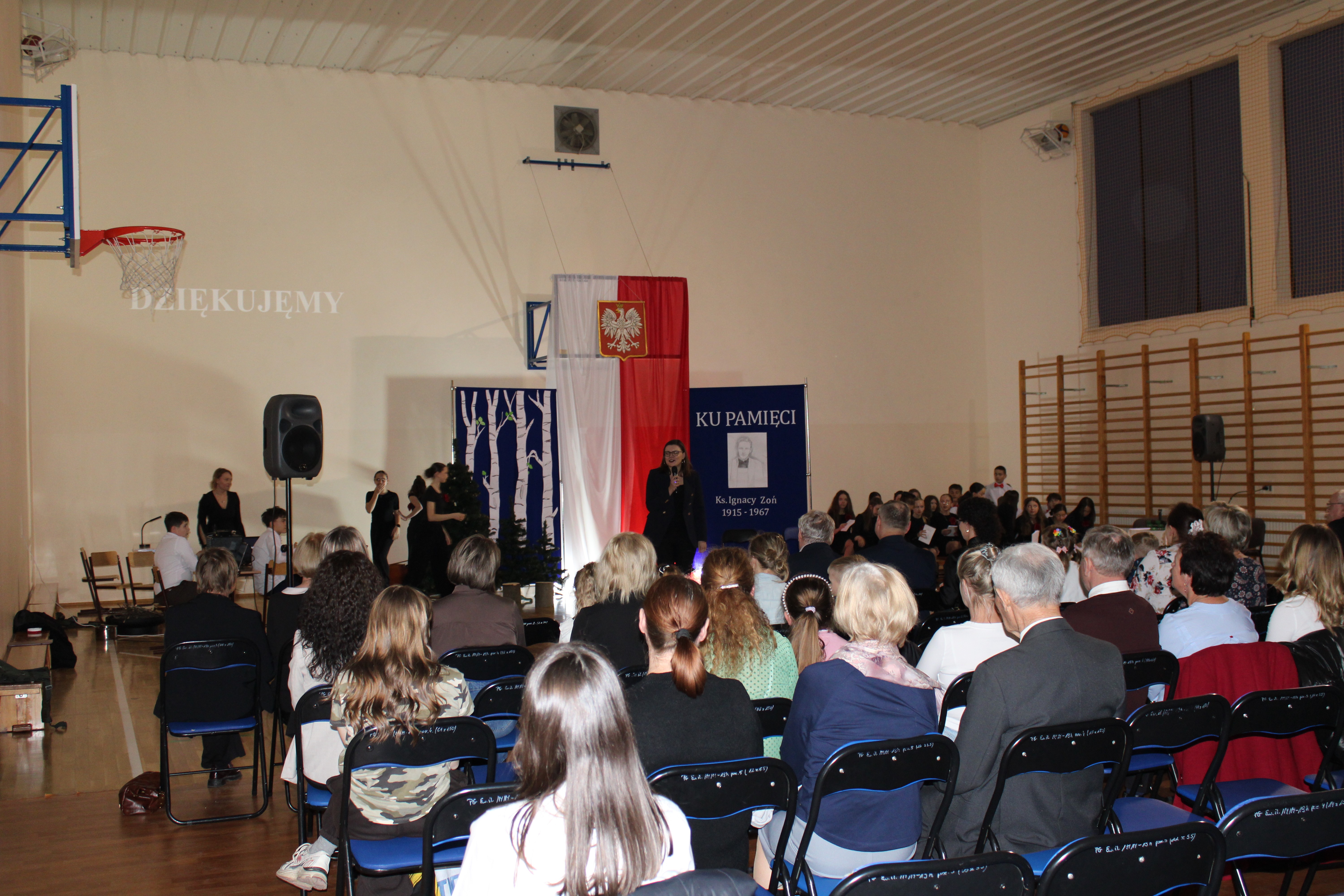 Uroczystość rozpoczęła się od powitania przez dyrektor Natalię Kordeczkę wszystkich zaproszonych gości, a w szczególności najbliższej rodziny ks. Ignacego Zonia. Po wspólnym odśpiewaniu hymnu państwowego uczniowie klasy ósmej i siódmej przedstawili program artystyczny, który składał się ze scenek historycznych związanych z życiem ks. Ignacego. Chór szkolny pod kierunkiem Joanny Dutki wzbogacił przedstawienie pieśniami nawiązującymi do walki o wolność i niepodległość Polski jaką prowadzili Żołnierze Wyklęci. Scenografia, odpowiednio dobrane pieśni patriotyczne oraz stroje historyczne przygotowane przez uczniów i ich rodziców pozwoliły widzom jeszcze bardziej wczuć się w atmosferę czasu głębokich przemian politycznych związanych z narzuceniem Polakom systemu komunistycznego.