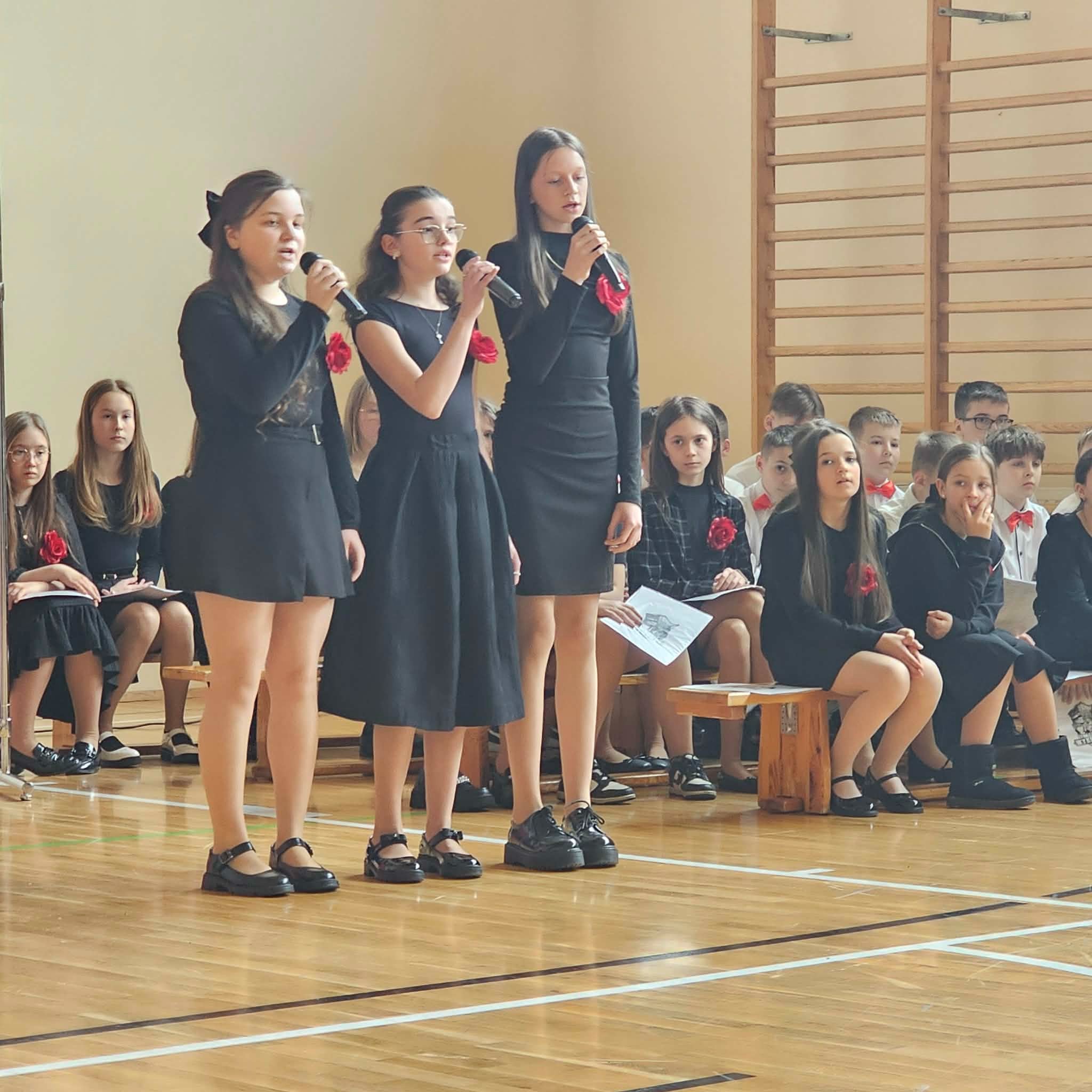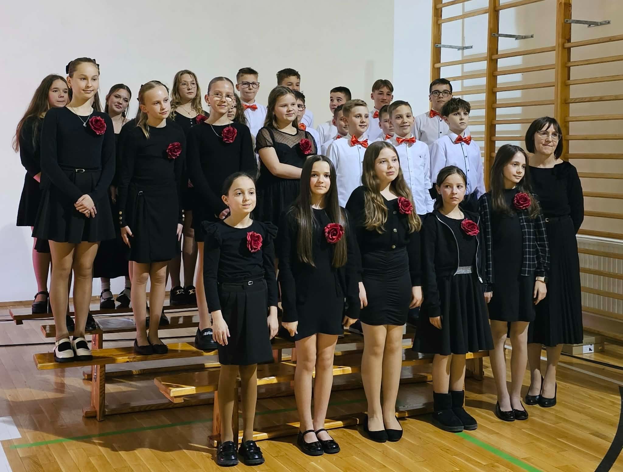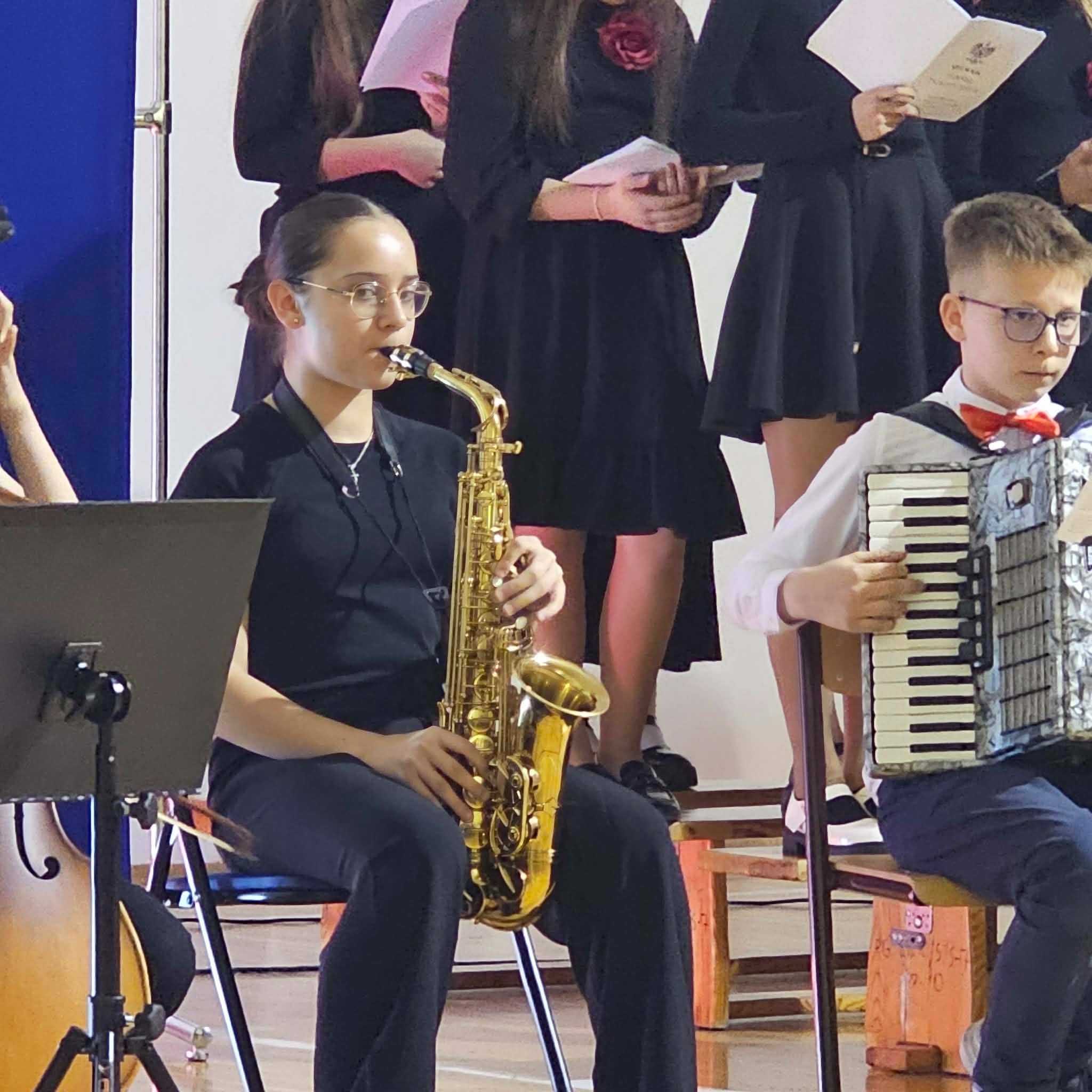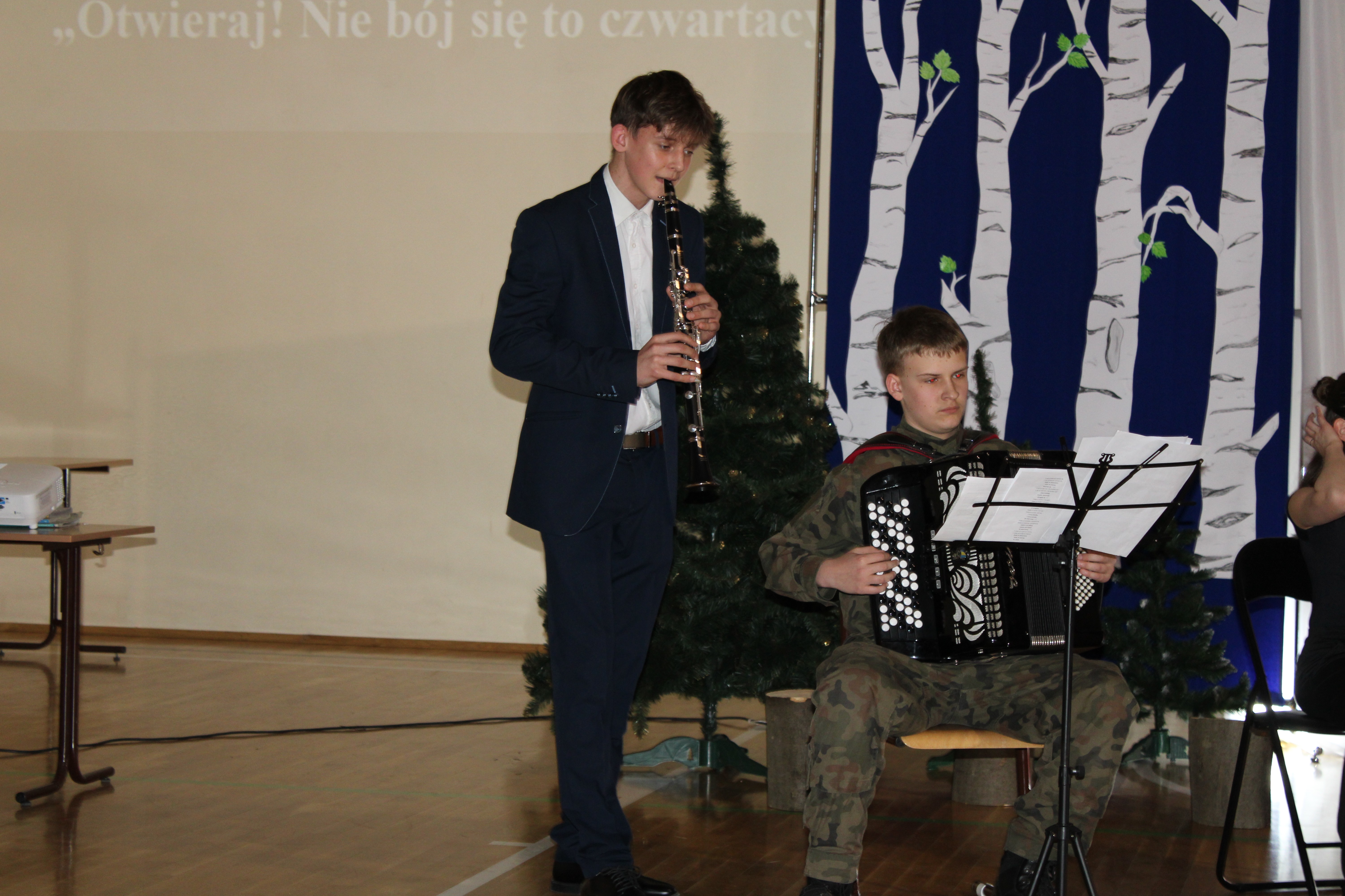 Na zakończenie wieczornicy wystąpili uczniowie uczęszczający do szkół muzycznych którzy zaprezentowali swoje umiejętności instrumentalne grając utwory popularnych pieśni patriotycznych. Uczniami kierowała Iwona Koczanowicz.