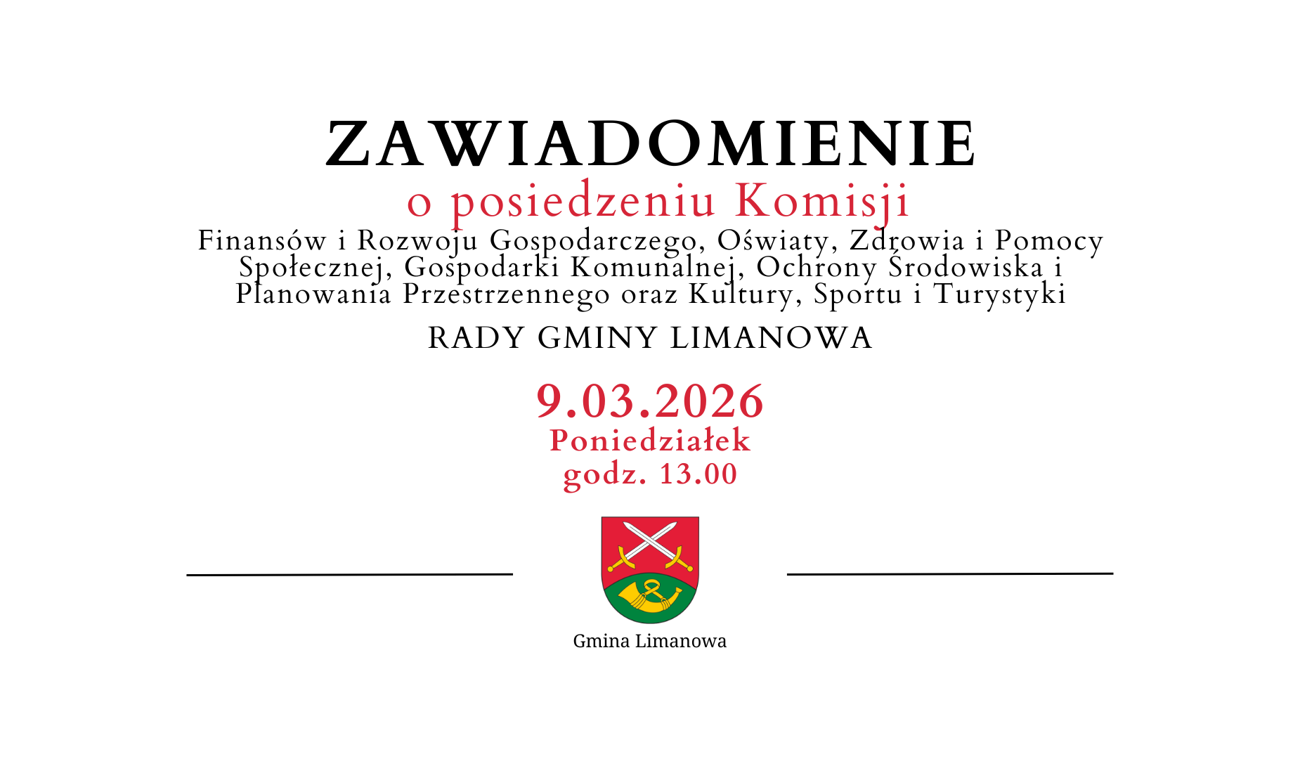 Na podstawie § 60 ust. 1, ust. 3 i ust. 7 uchwały Nr XXIX/278/2018 Rady Gminy Limanowa z dnia 6 września 2018 r. w sprawie Statutu Gminy Limanowa (Dz. Urz. Woj. Mał. z 2018 r. poz. 6395) zapraszam na wspólne posiedzenie Komisji Finansów i Rozwoju Gospodarczego, Komisji Oświaty, Zdrowia i Pomocy Społecznej, Komisji Gospodarki Komunalnej, Ochrony Środowiska i Planowania Przestrzennego oraz Komisji Kultury, Sportu i Turystyki Rady Gminy Limanowa, które odbędzie się w dniu 9 marca 2026 r. /poniedziałek/ o godz. 13.00 w sali konferencyjnej Urzędu Gminy Limanowa.