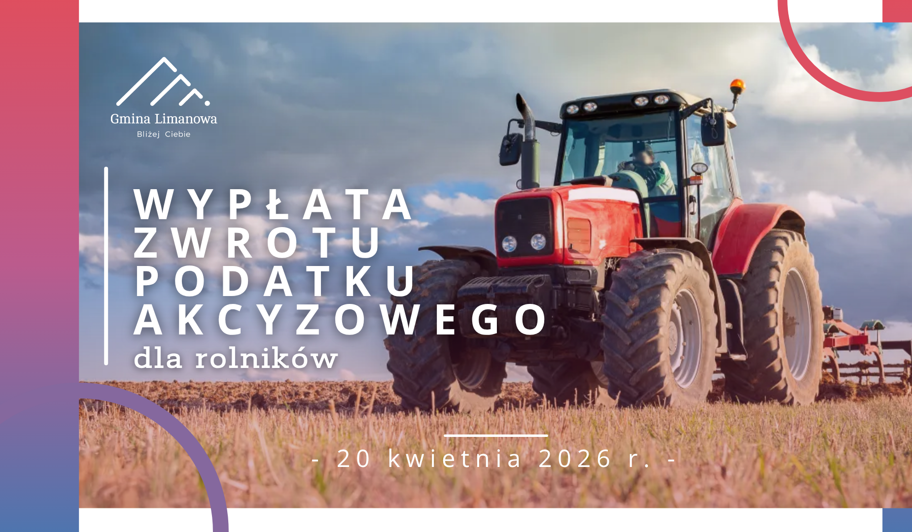 Urząd Gminy Limanowa informuje, że w dniu 20 kwietnia 2026 r. zostaną przelane środki z tytułu zwrotu podatku akcyzowego dla rolników, na rachunek bankowy wskazany we wniosku. Pieniądze zostaną przelane rolnikom, którzy w lutym bieżącego roku złożyli do Wójta Gminy Limanowa wniosek o zwrot podatku akcyzowego wykorzystywanego do produkcji rolnej.