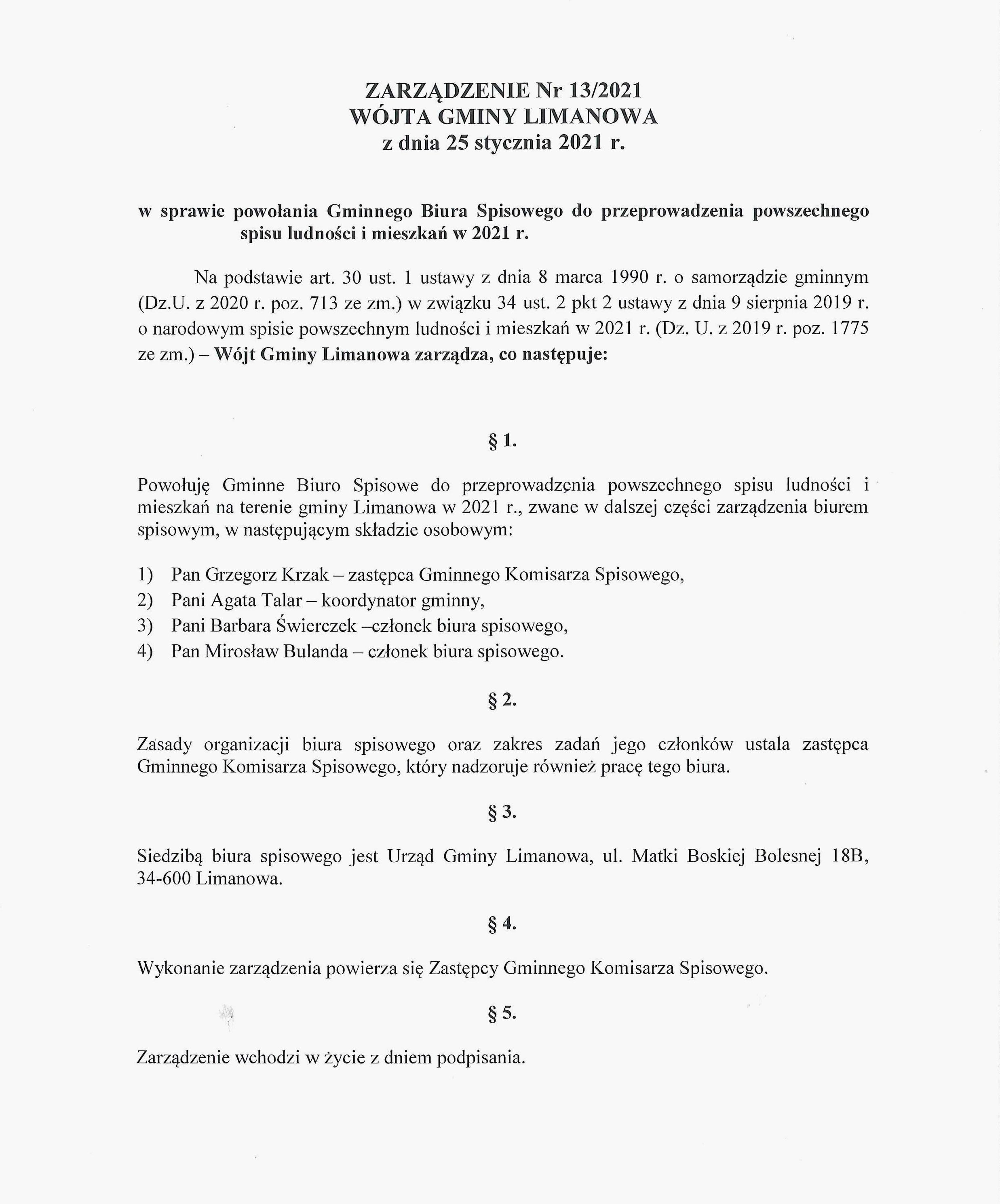 Dnia 29 stycznia 2021, na podstawie art. 24 ust. 1 pkt. 6 ustawy z dnia 9 sierpnia 2019 r. o narodowym spisie powszechnym ludności i mieszkań w 2021 r. (Dz. U. poz. 1775 ze zm.)