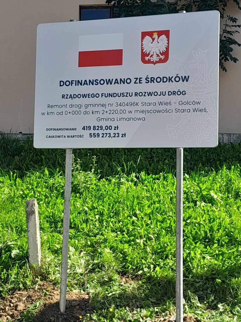 „Remont drogi gminnej nr 340496K Stara Wieś – Golców w km od 0+000 do km 2+220,00 w miejscowości Stara Wieś, Gmina Limanowa” kwota otrzymanego dofinansowania : 540 476,00 zł.